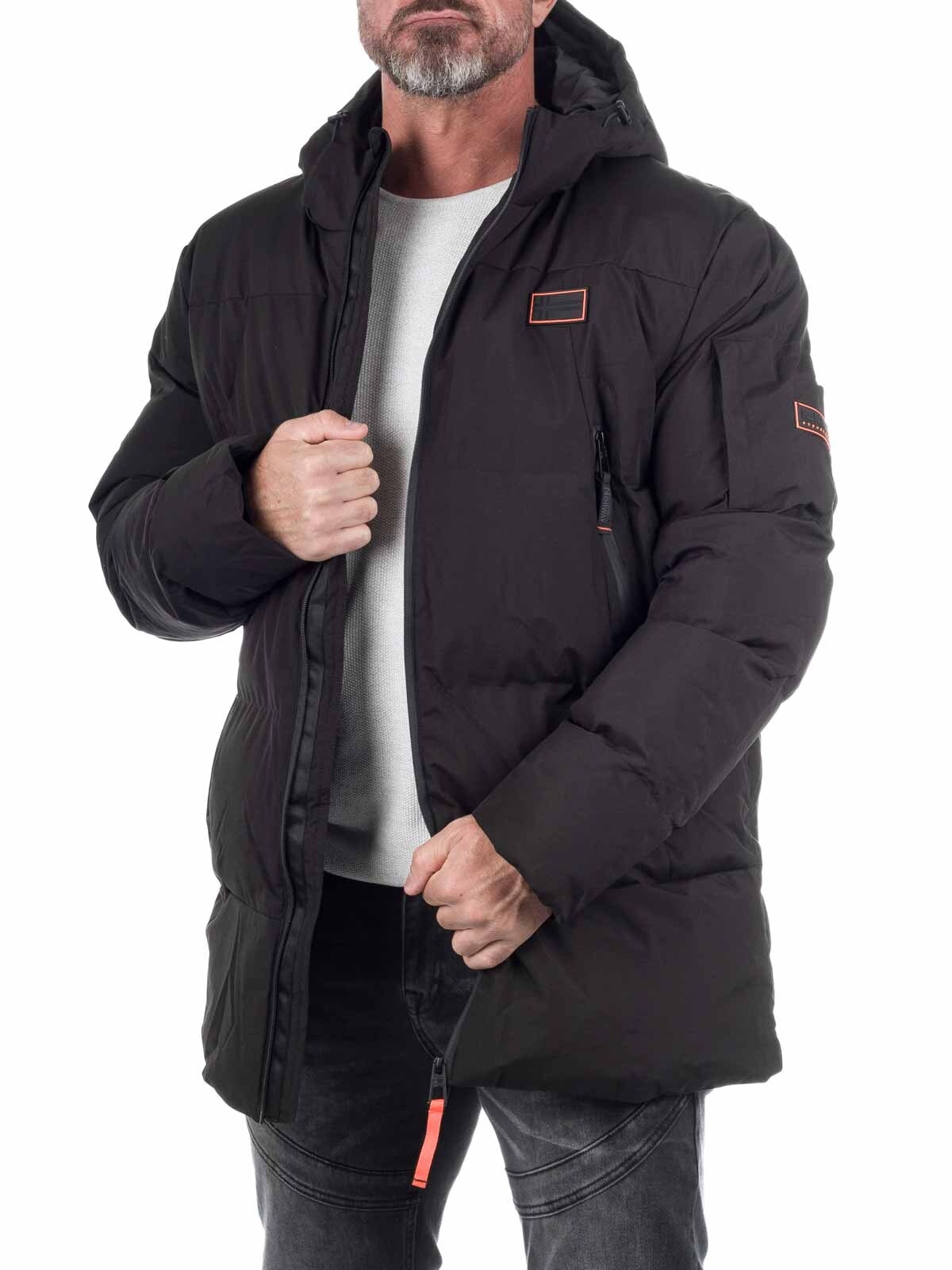 Snygg pufferjacka i längre modell som ger både skydd och stil under vintern. Den har en rejäl huva, stora fickor med dragkedjor och detaljer i kontrastfärg som bryter av den svarta ytan. Det kraftigt vadderade materialet håller dig varm samtidigt som passformen känns modern och maskulin. En vinterfavorit för dig som vill ha en kombination av funktion och stil.