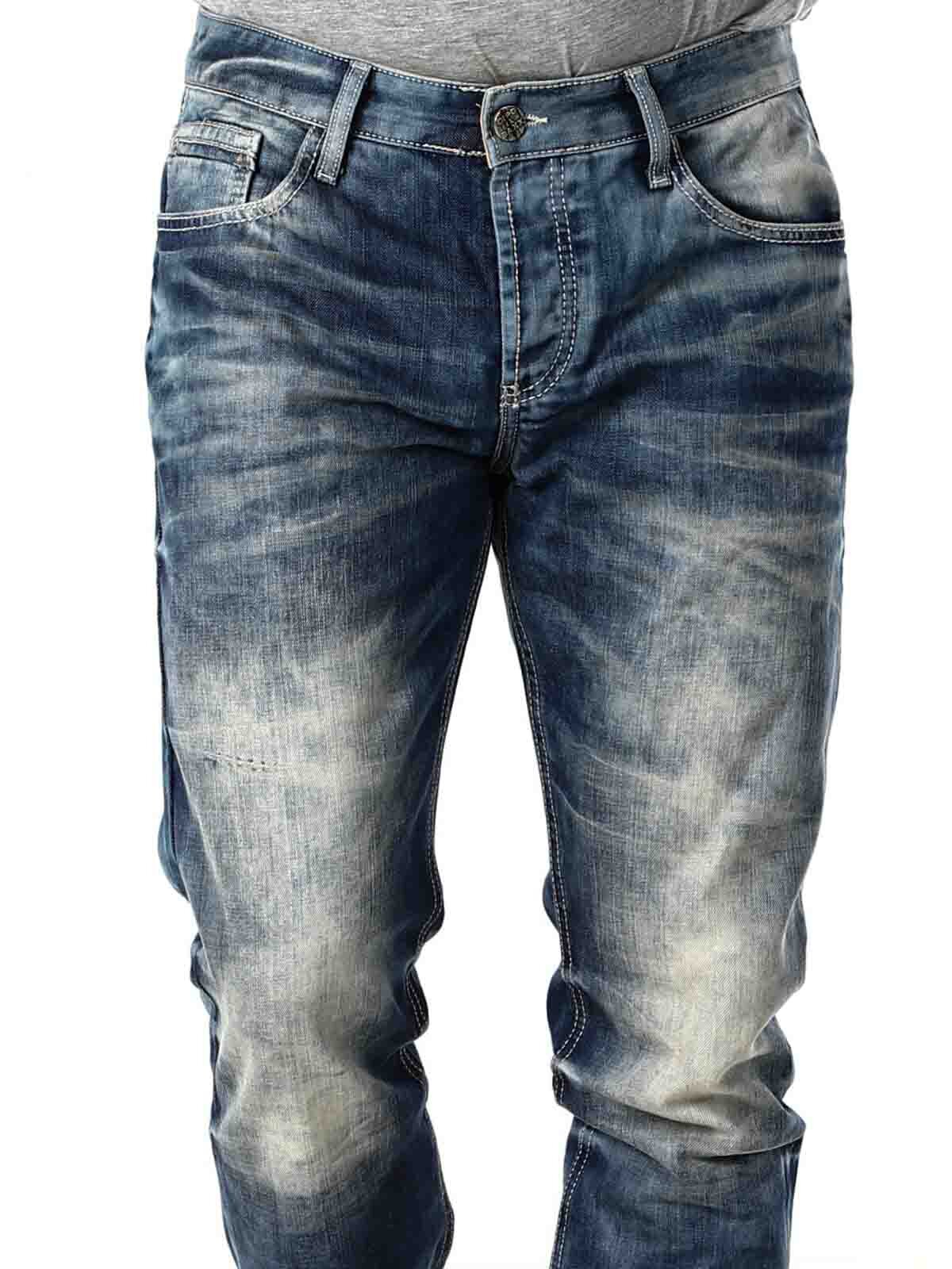 Blå jeans med stentvättad design. De har bälteshällor i midjan, fem fickor, samt en extra liten ficka med knapp på ena bakfickan. Detaljerad med sömmar i kontrastfärg.