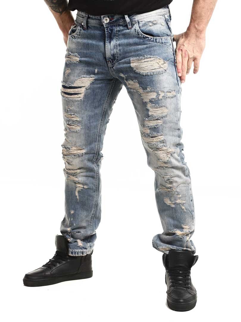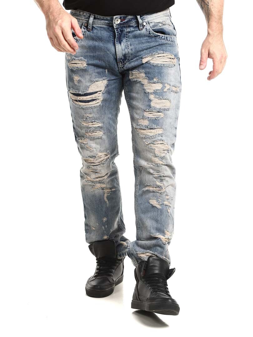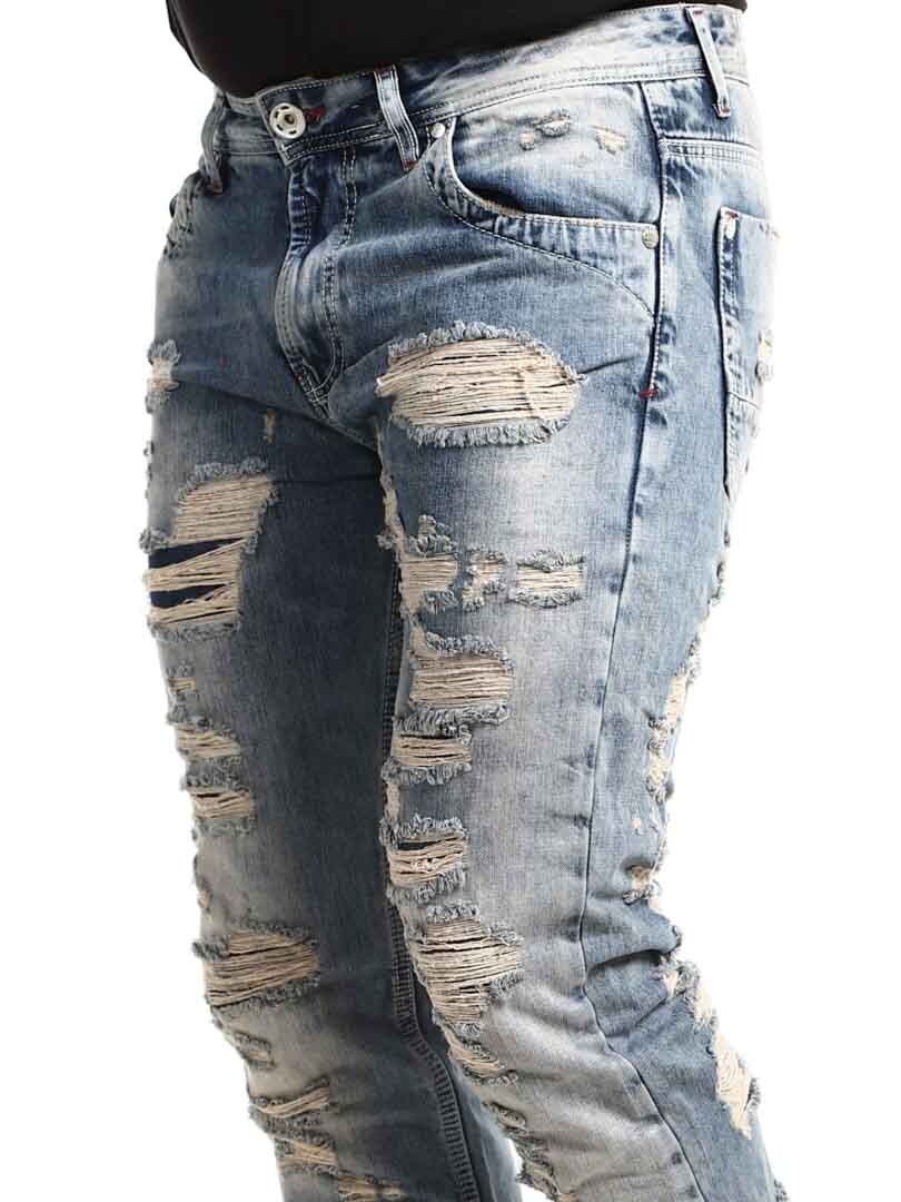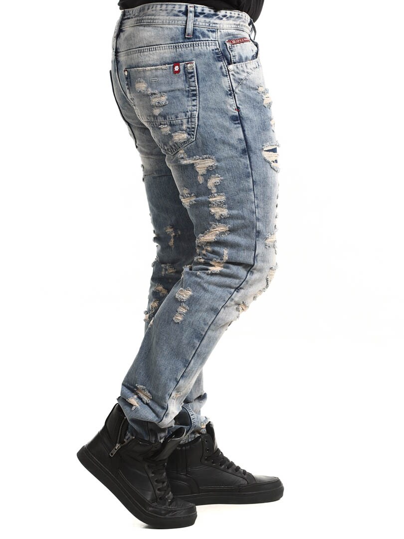 Tuffa jeans detaljerade med mycket slitningar både fram och bak. De har fem fickor, bälteshällor i midjan och sömmar i kontrastfärg. Tillverkade i 100% bomull.