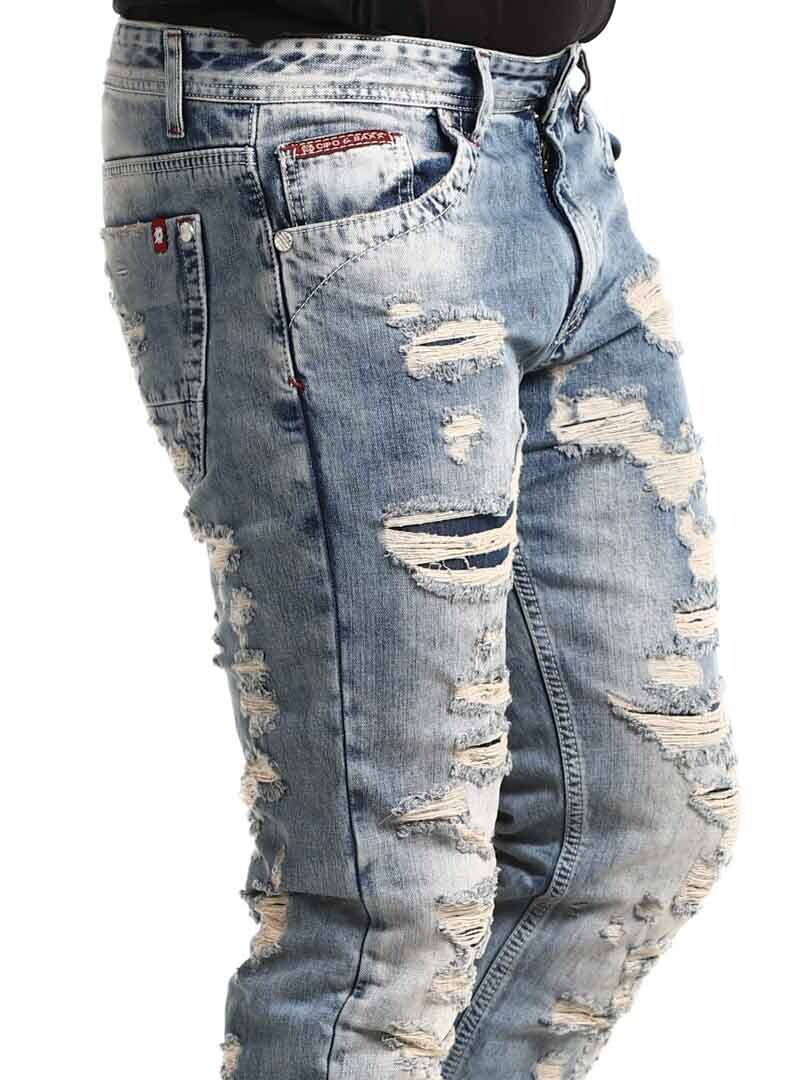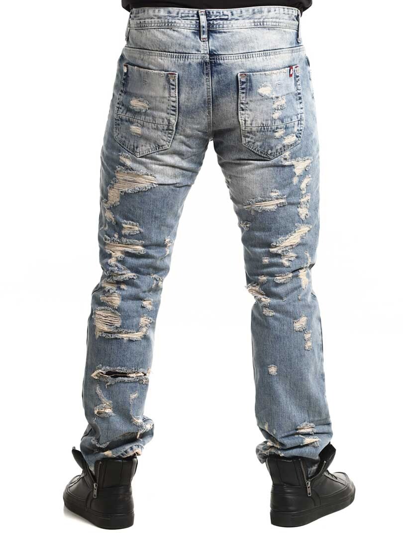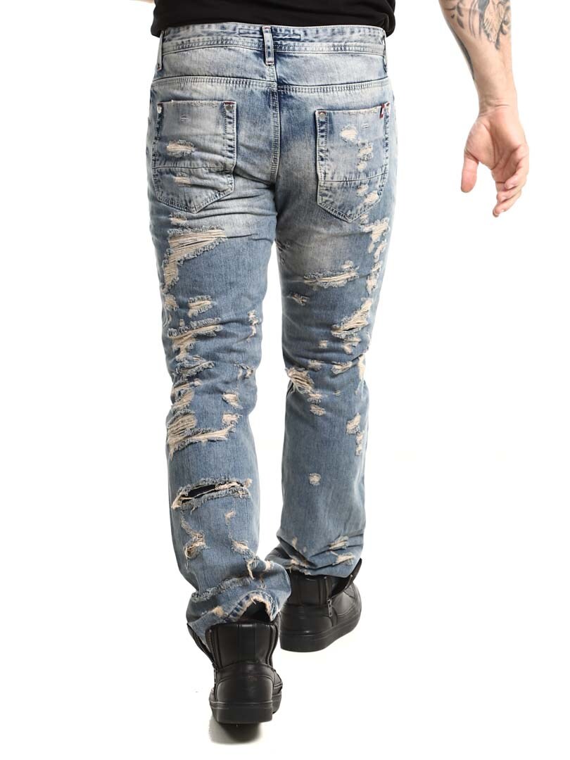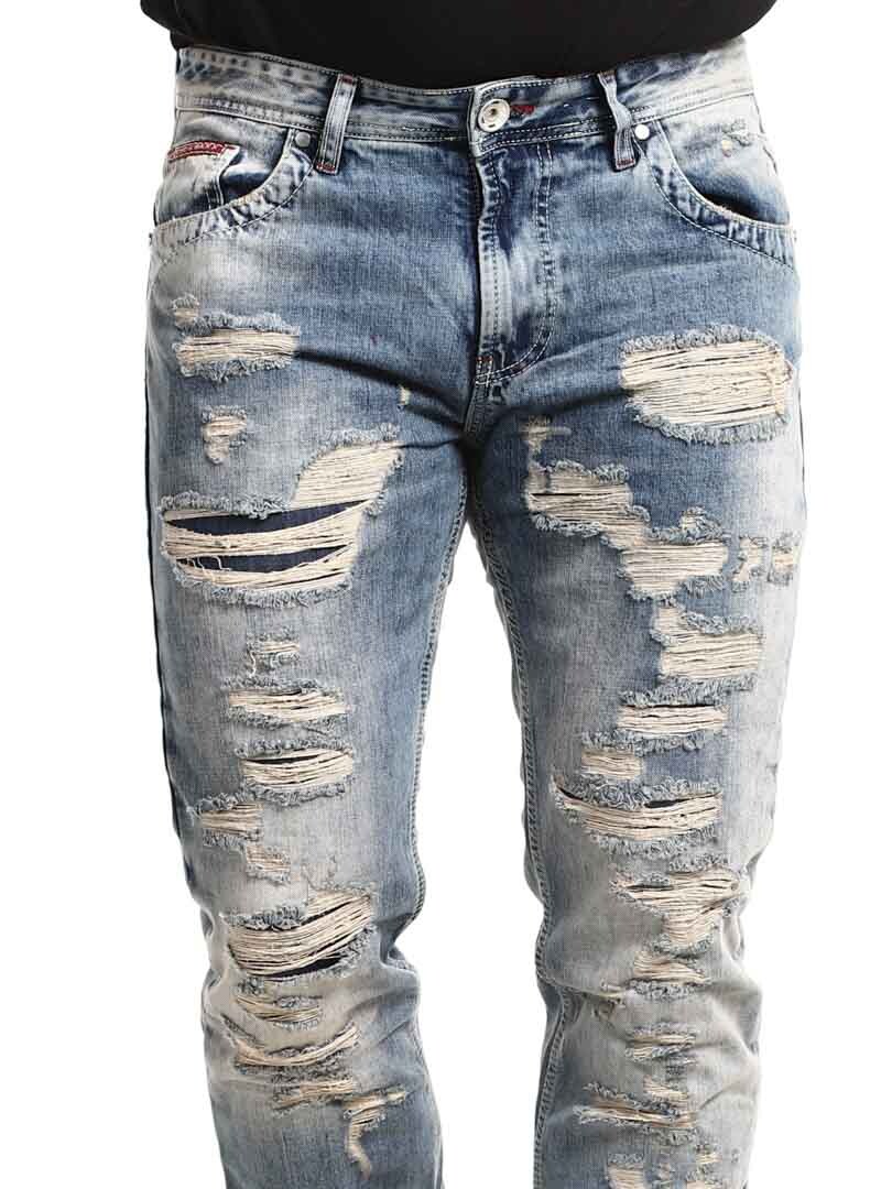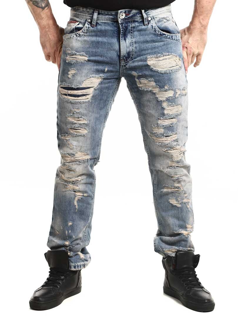 Tuffa jeans detaljerade med mycket slitningar både fram och bak. De har fem fickor, bälteshällor i midjan och sömmar i kontrastfärg. Tillverkade i 100% bomull.
