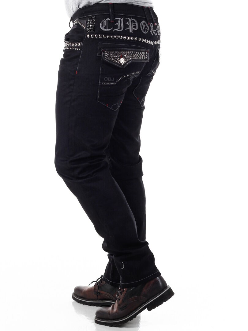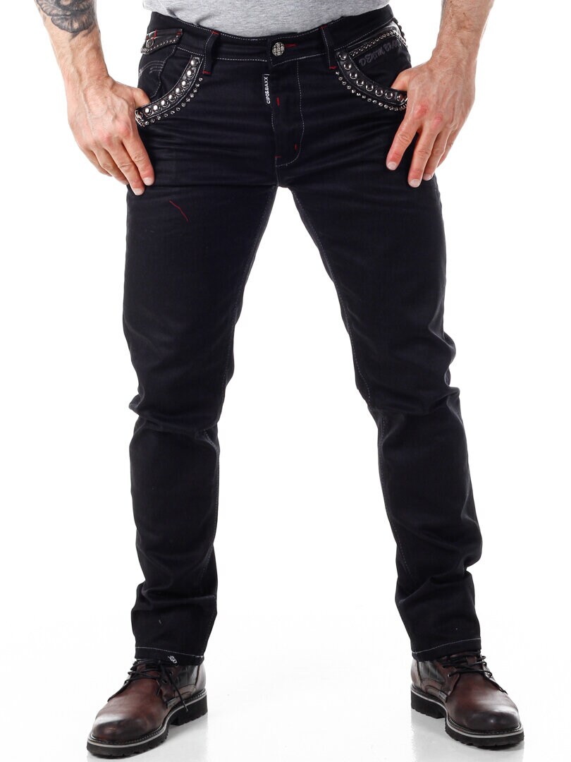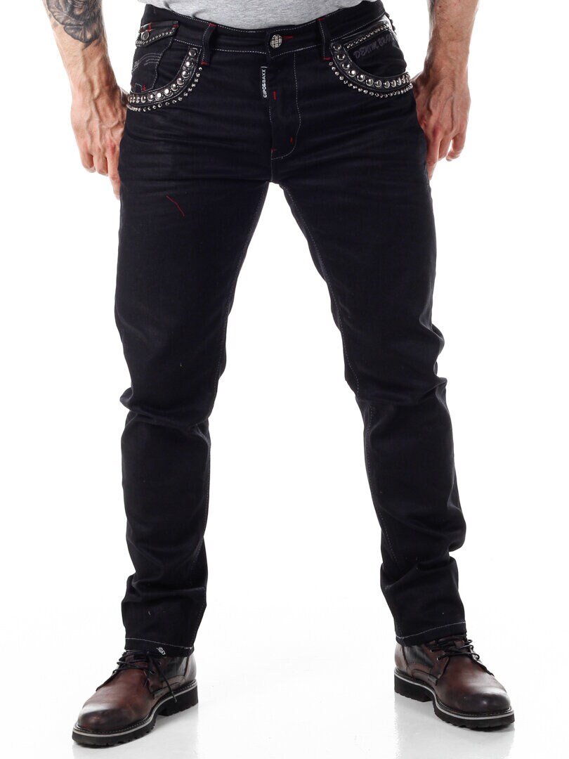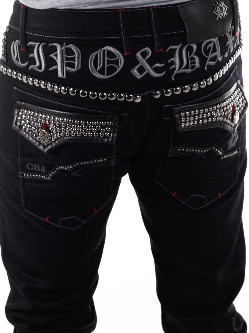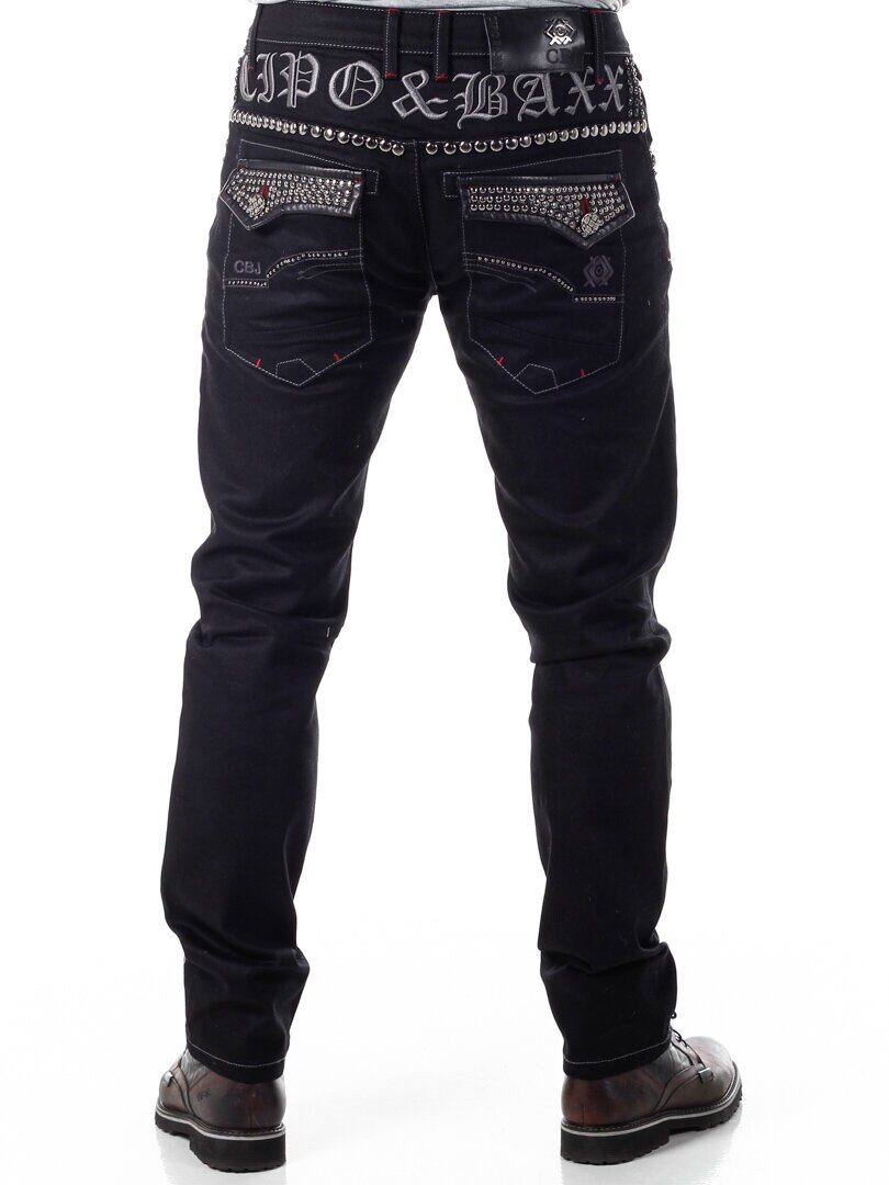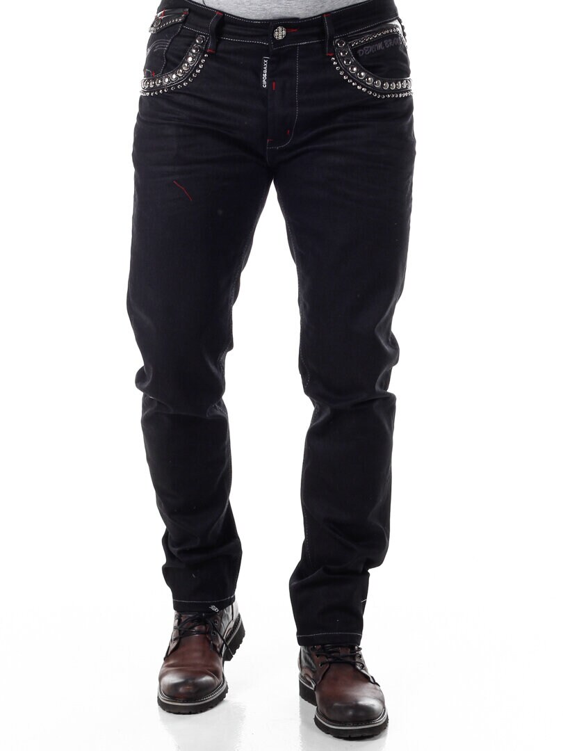 Tuffa byxor i svart denim med blanka nitar. 5-ficksmodell där tre av dem är stängbara. Designade med ljusa sömmar, detaljer i skinnimiation och skräddad logga baktill. Något stretchiga.