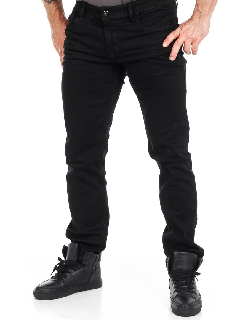 Stretchiga byxor med grova sömmar och broderade fickor i svart. Blixtlås i gylfen och vid linningen finns en svart patch med logga och små nitar i metall. Kroppsnära modell med fyra framfickor och två bakfickor.