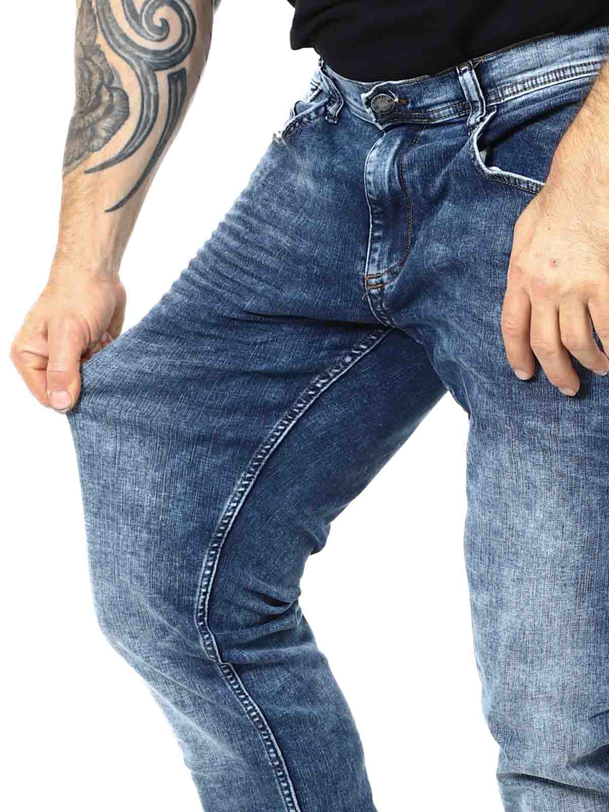 Blå jeans med multiflexteknik som ger extra mycket töjbarhet och extra hög bärkomfort. De har normal midja och avsmalnande ben. Det finns tre framfickor, två bakfickor och bälteshällor i midjan.