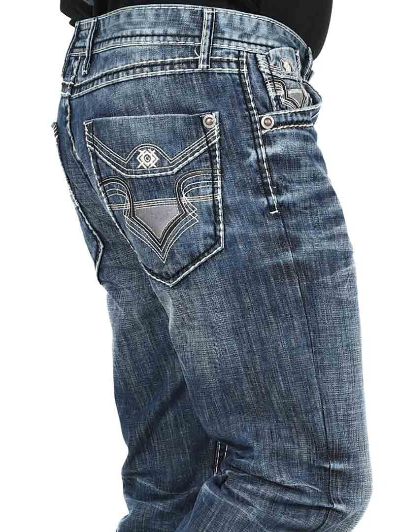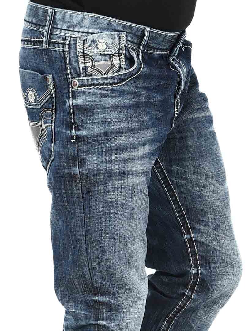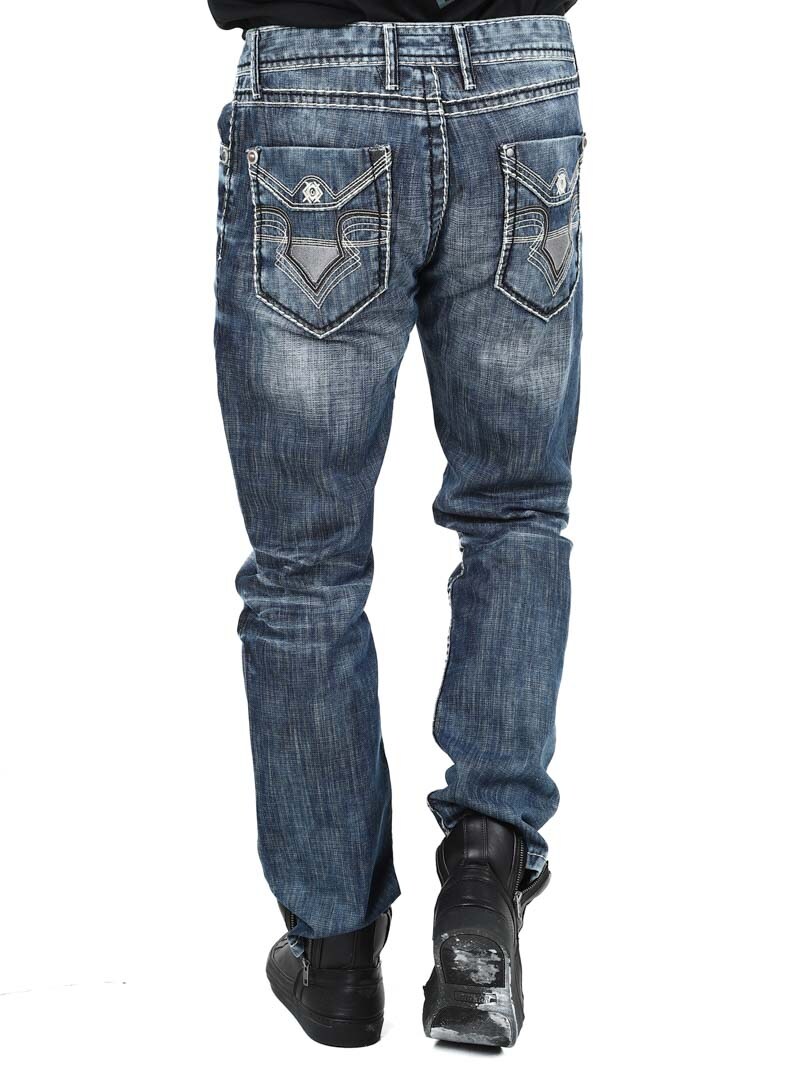 Mörka jeans tillverkade i slitstark denim. De har klassisk passform, fem fickor och bälteshällor i midjan. Designade med sömmar och skräddat tryck i kontrastfärg.