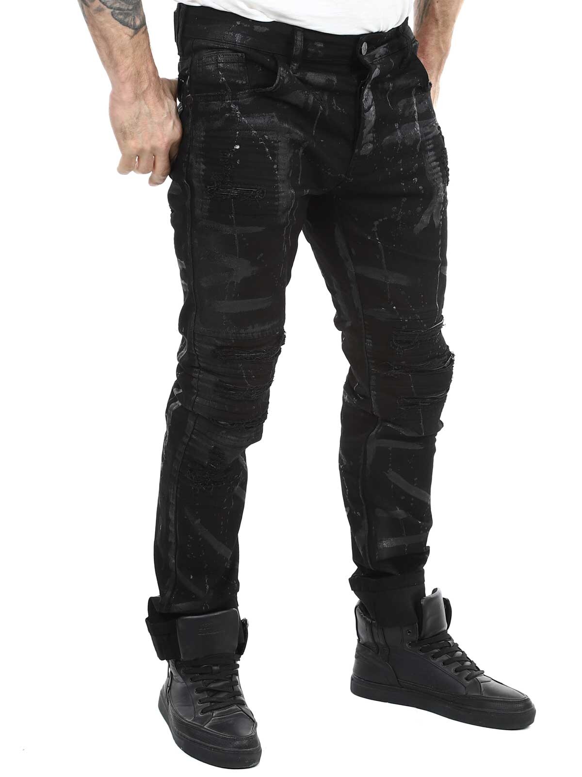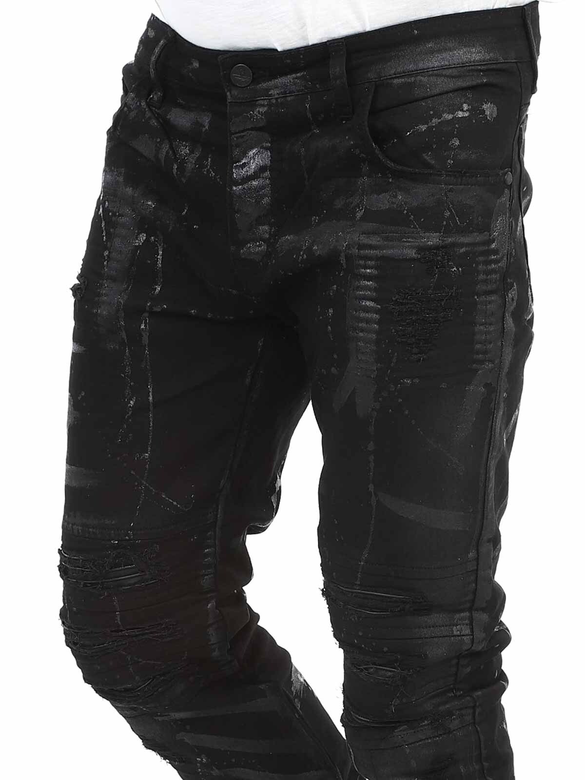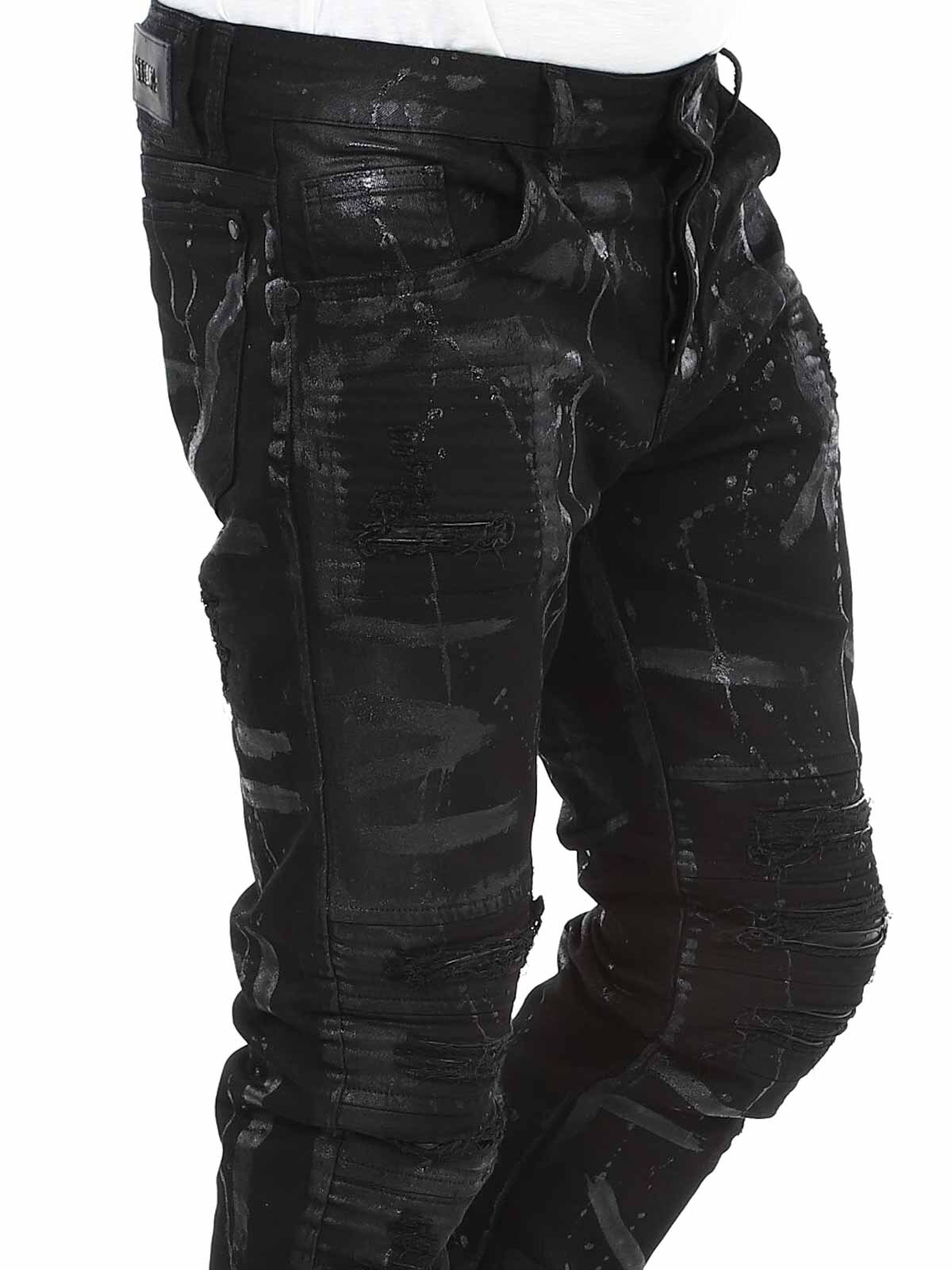 Jeans i bekväm och stretchig denim. Tufft designade med revor i skinnimitation och målade effekter. Femficksmodell med bälteshällor och en patch i linningen baktill. Jeans skapade för att ge din outfit en kaxig och unik edge!