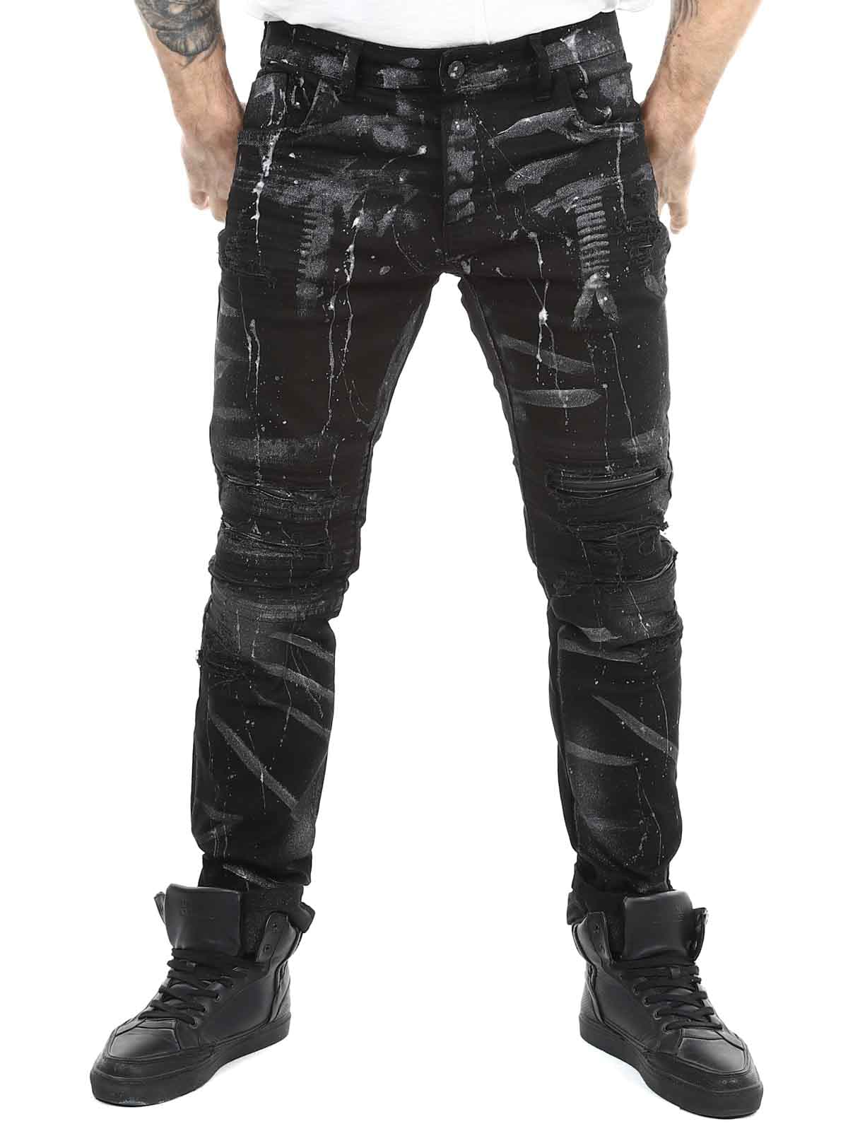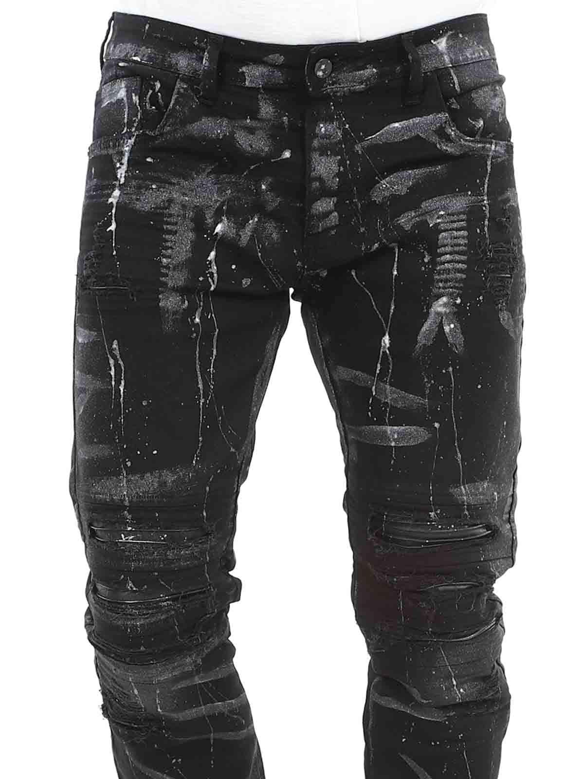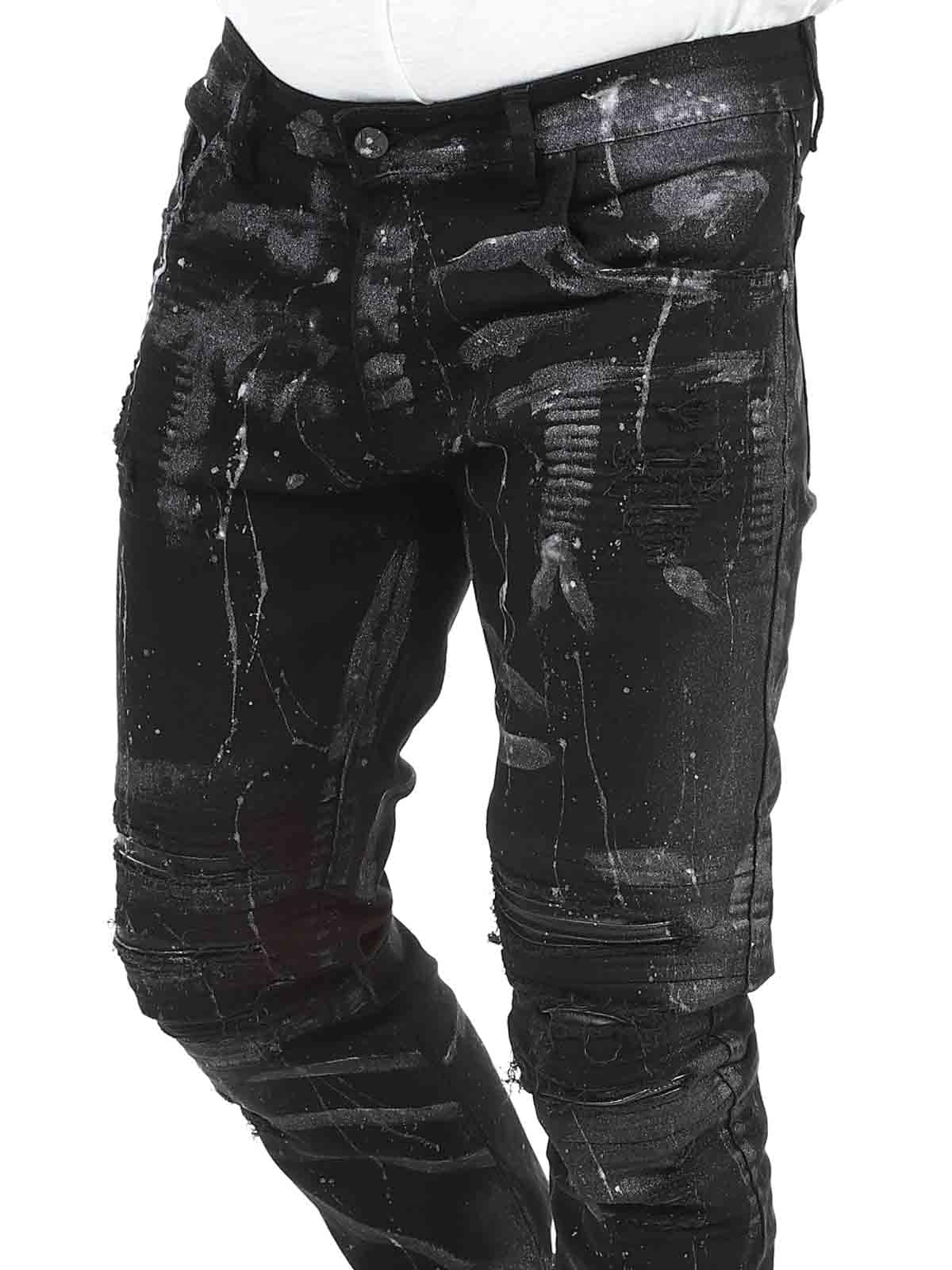 Jeans i bekväm och stretchig denim. Tufft designade med revor i skinnimitation och målade effekter. Femficksmodell med bälteshällor och en patch i linningen baktill. Jeans skapade för att ge din outfit en kaxig och unik edge!