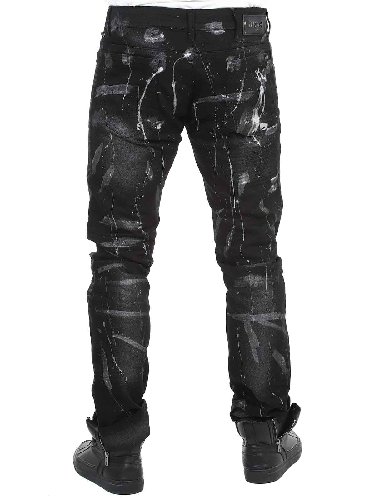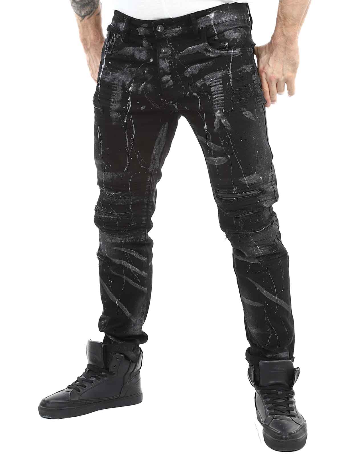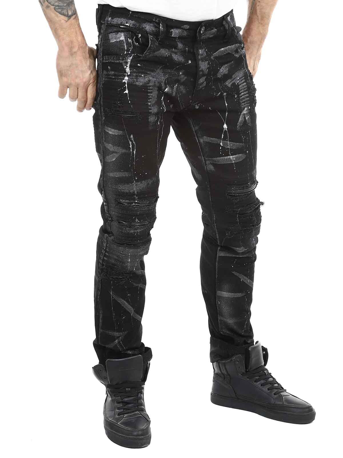 Jeans i bekväm och stretchig denim. Tufft designade med revor i skinnimitation och målade effekter. Femficksmodell med bälteshällor och en patch i linningen baktill. Jeans skapade för att ge din outfit en kaxig och unik edge!