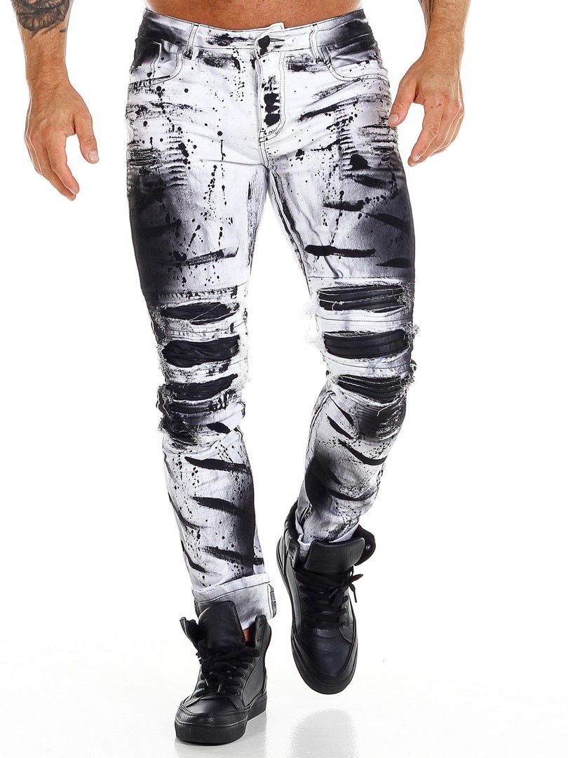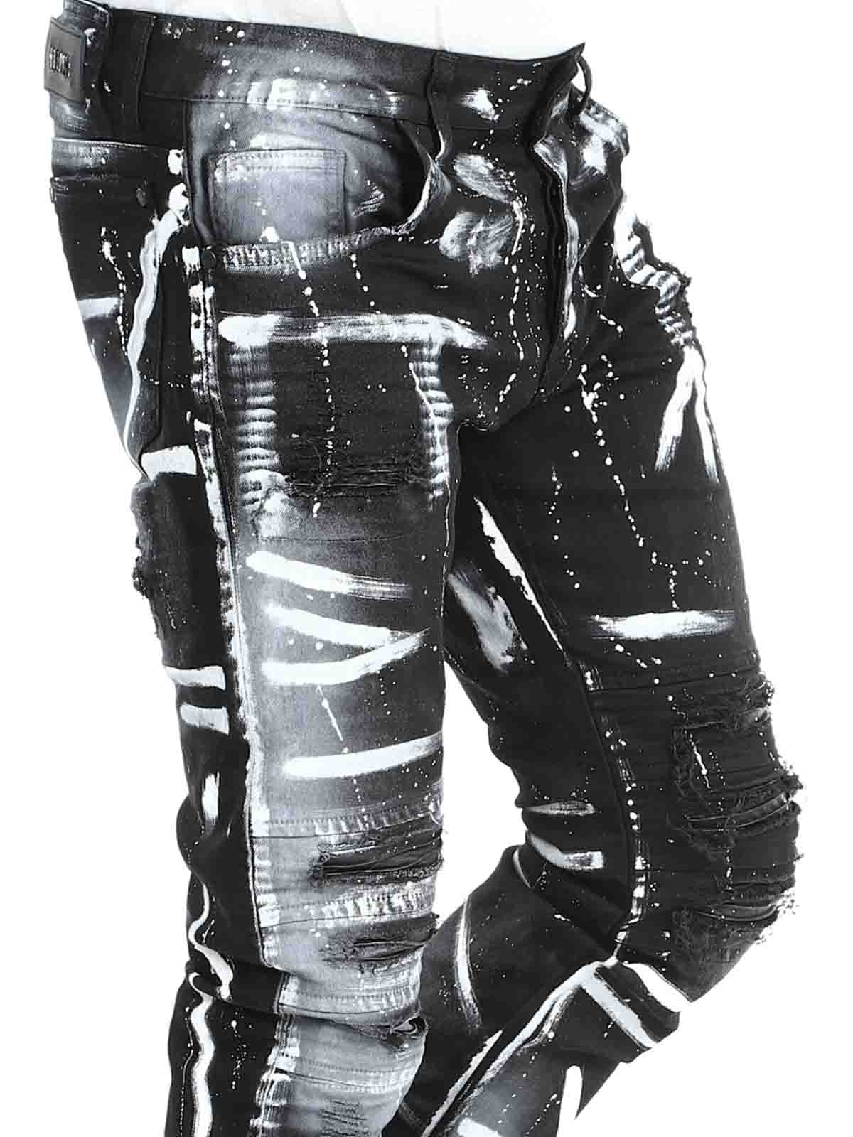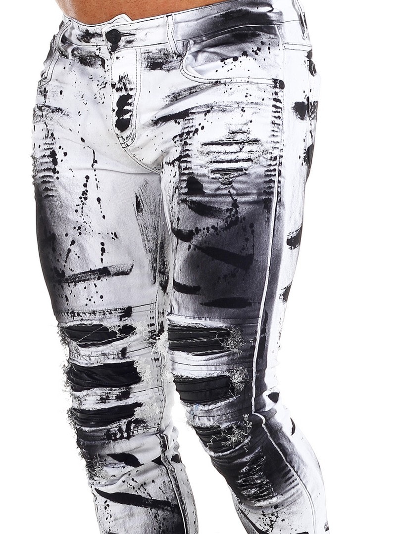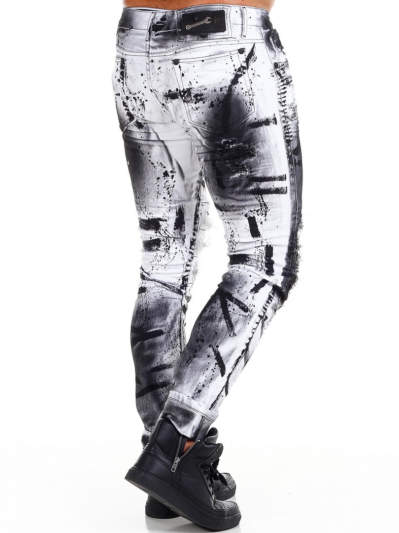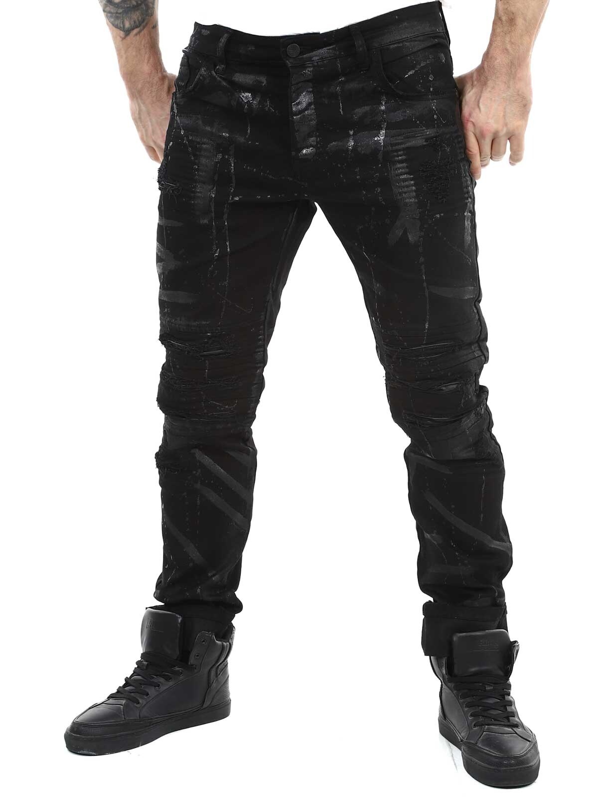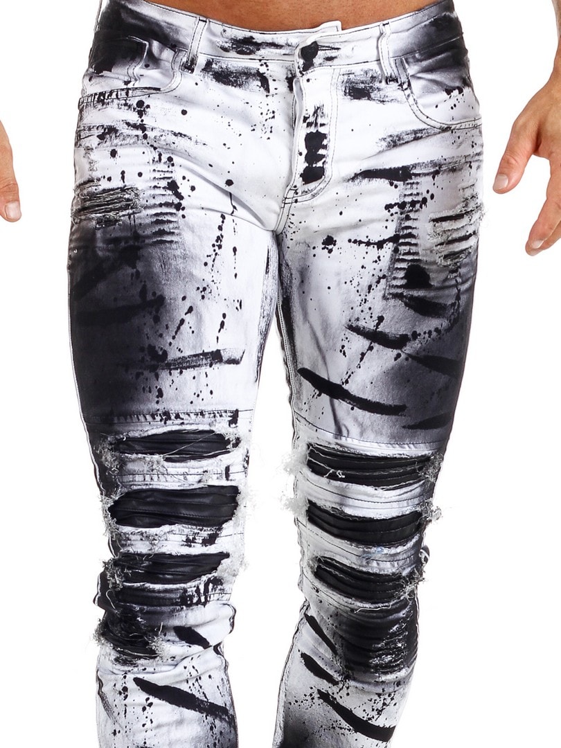 Byxor i smal passform med svarta, målade effekter och skinnimitation i en sliten vintagedesign med revor. Rymliga fickor och patch i linningen baktill.