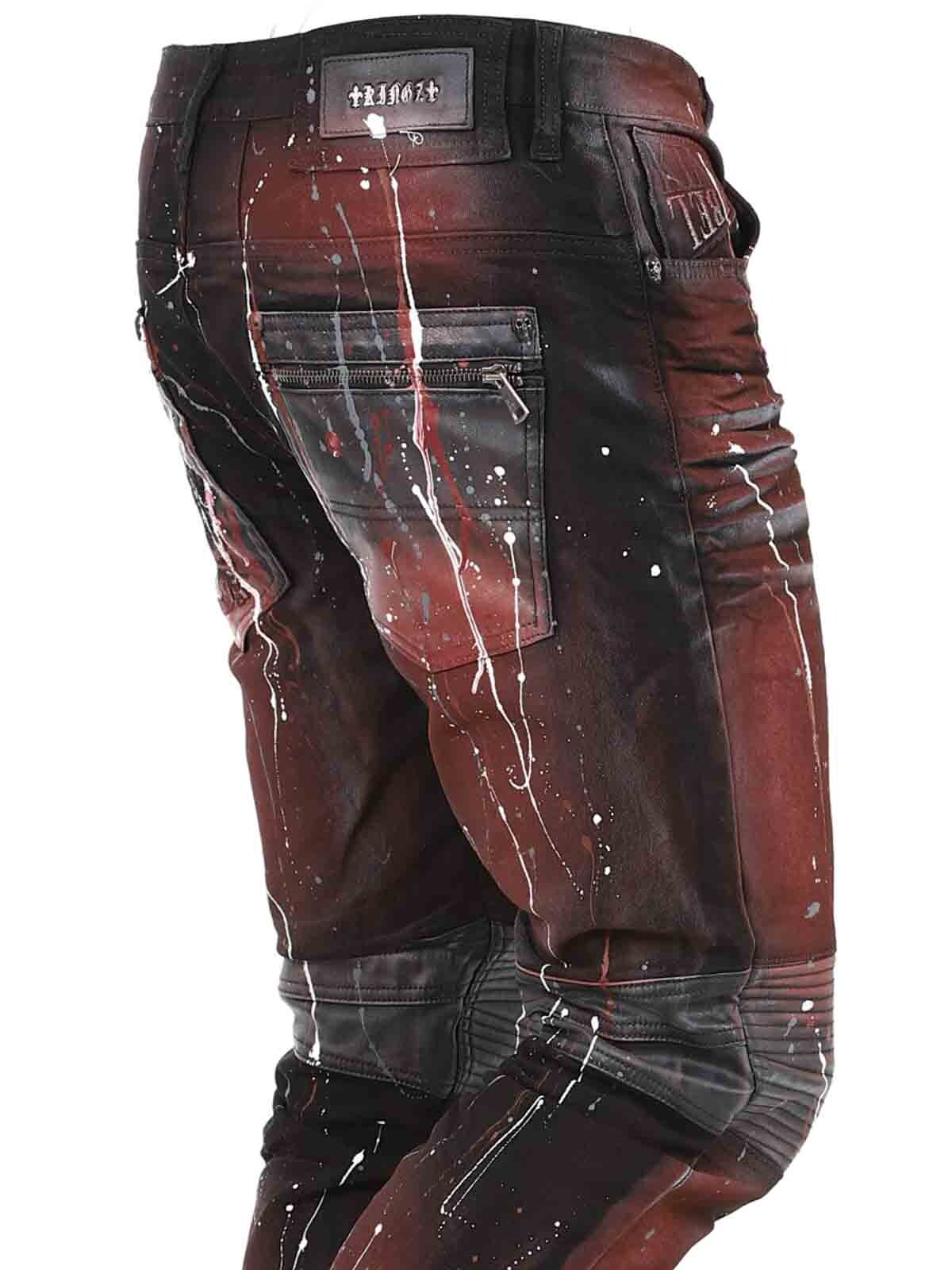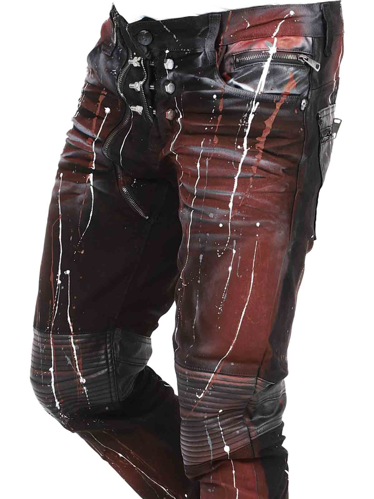 Unika byxor i färgad denim med knän och fickor i svart skinnimitation. Smal passform med silvriga bultar som markerar gylfen och bakfickor som stängs med silvriga dragkedjor. Jeansen stängs med separat dragkedja till höger om knappen i midjan.