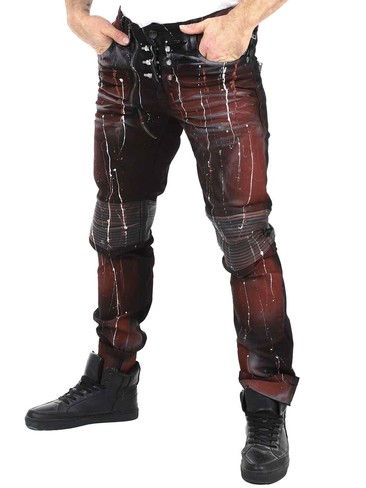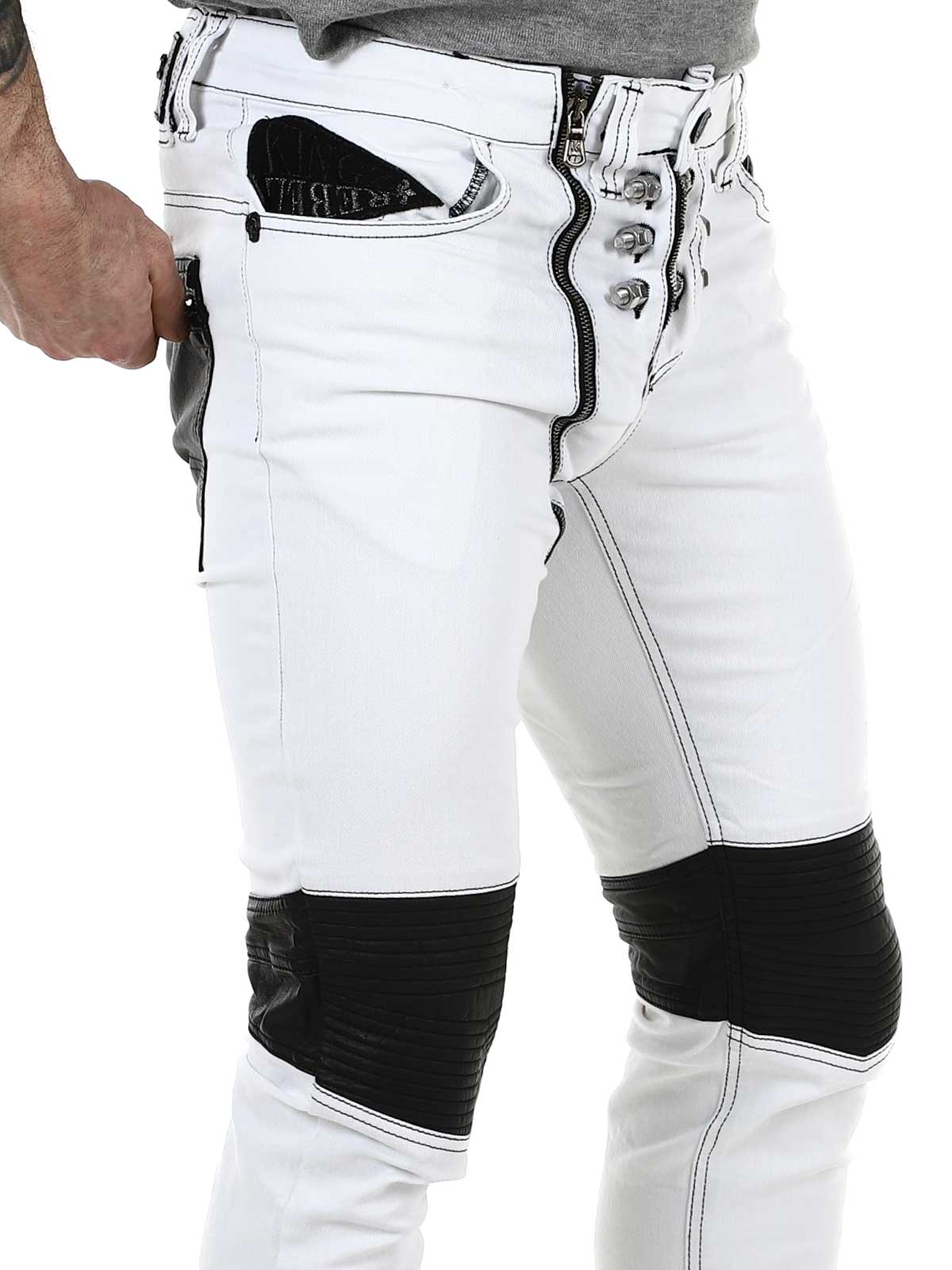 Unika byxor i färgad denim med knän och fickor i svart skinnimitation. Smal passform med silvriga bultar som markerar gylfen och bakfickor som stängs med silvriga dragkedjor. Jeansen stängs med separat dragkedja till höger om knappen i midjan.