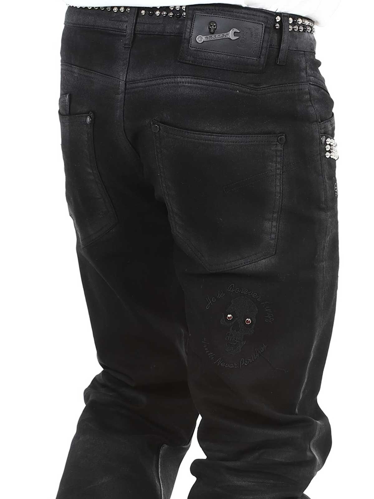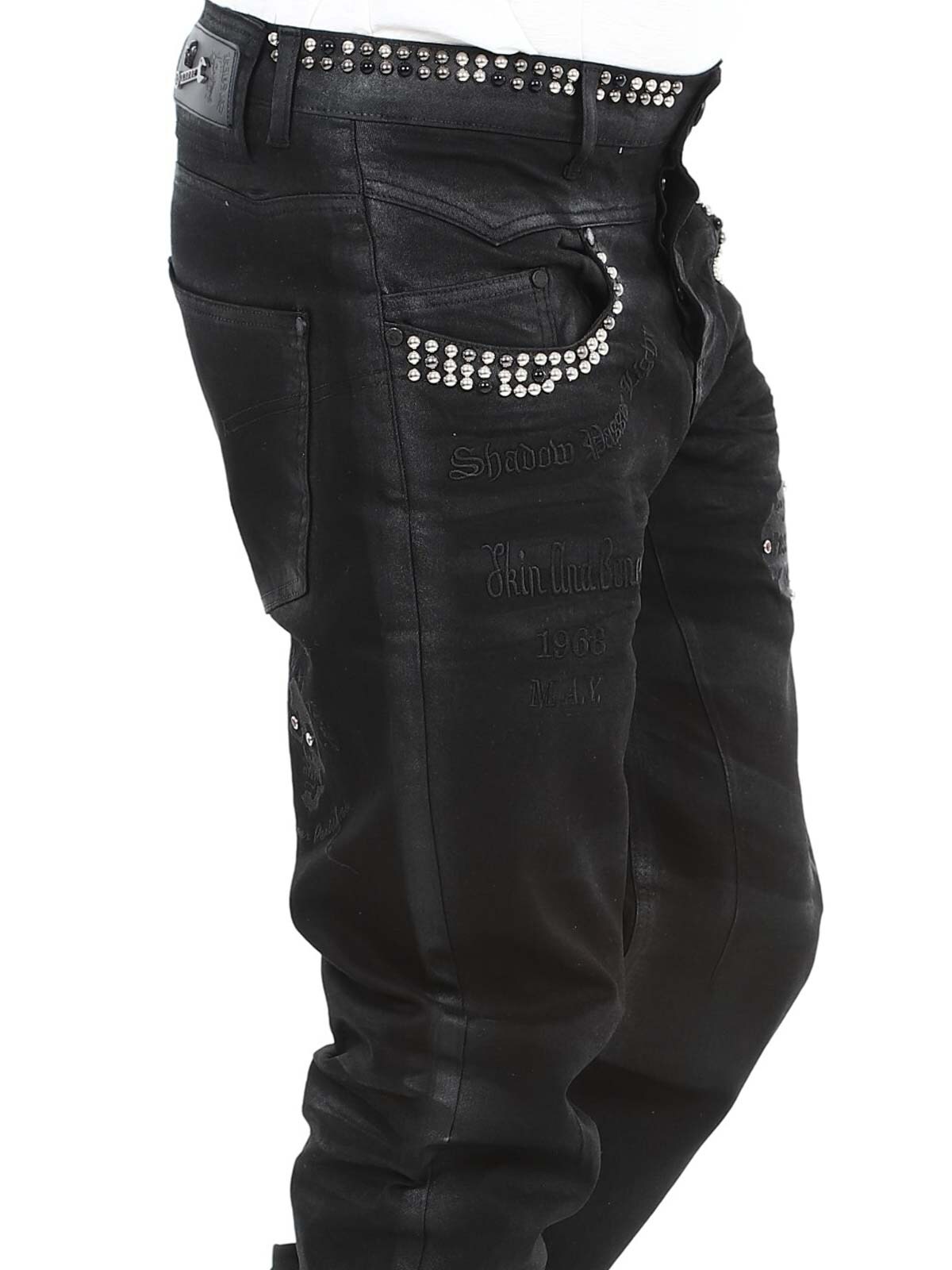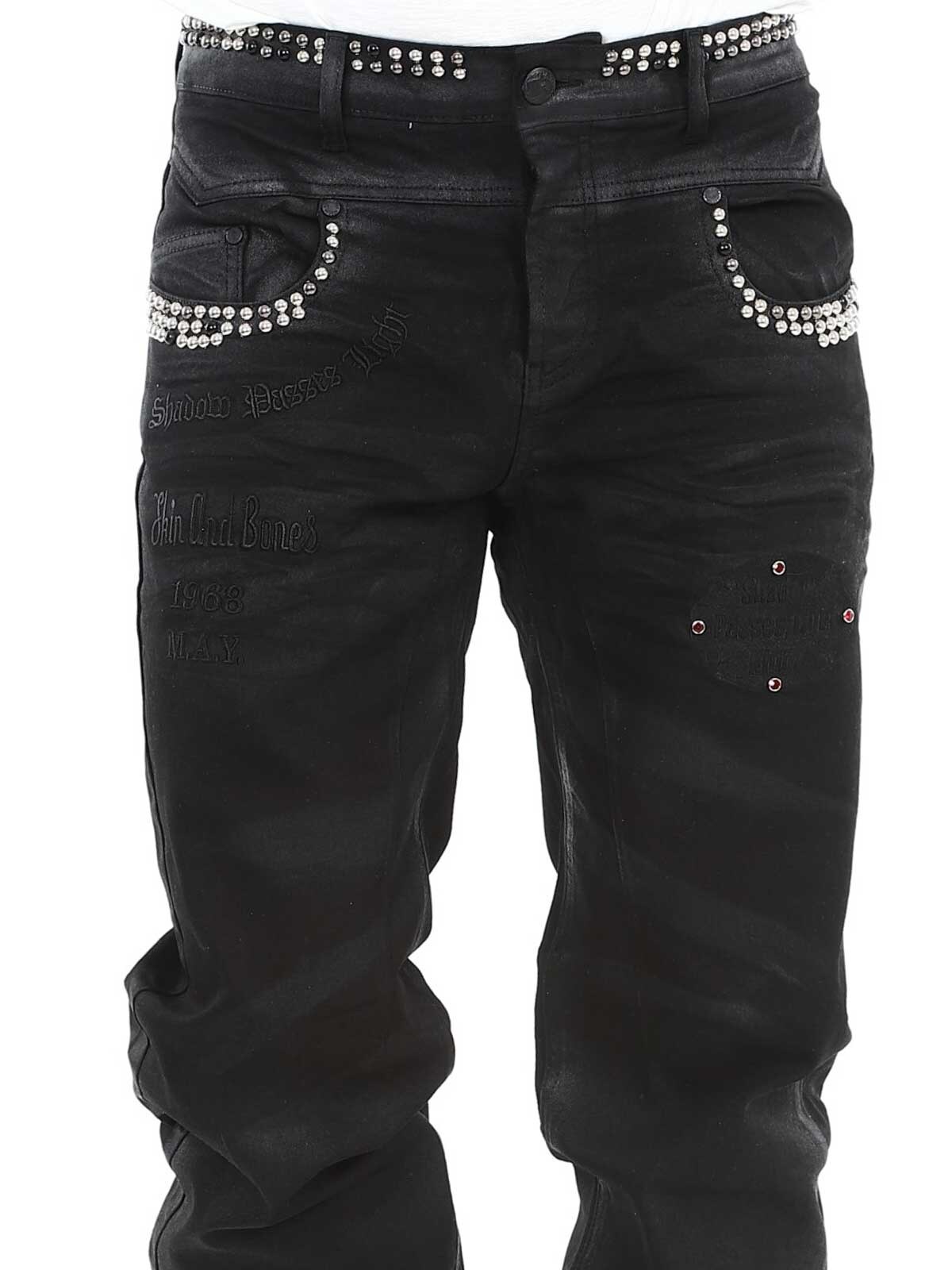Jeans i stretchigt material med blickfångande design. De har bälteshällor, tre framfickor samt tre bakfickor. Tufft detaljerad med nitar och skräddade tryck. Vill du vara unik och sticka ut är dessa jeans helt rätt för dig!