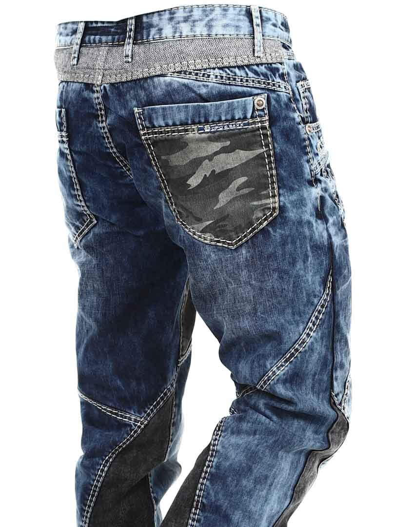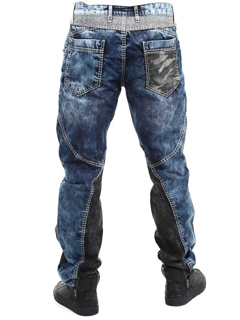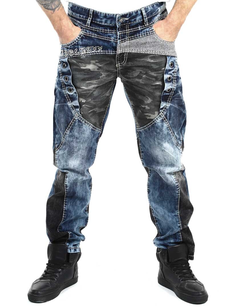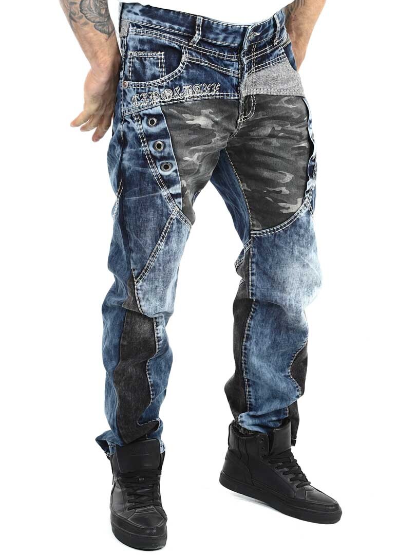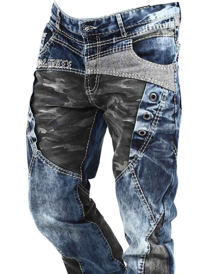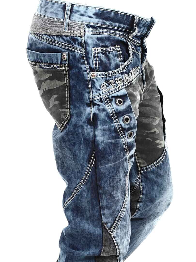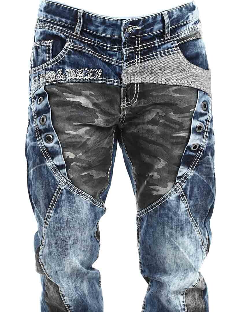 Byxor med unik design som kombinerar slitstark denim med inslag av kamouflagemönster och stickade detaljer. Dessa jeans är stentvättade för en trendig look och har kontrastsömmar som framhäver passformen. Utrustade med dekorativa knappar och subtila broderier som ger ett edgy uttryck. Perfekta för dig som vill sticka ut med stil och attityd!