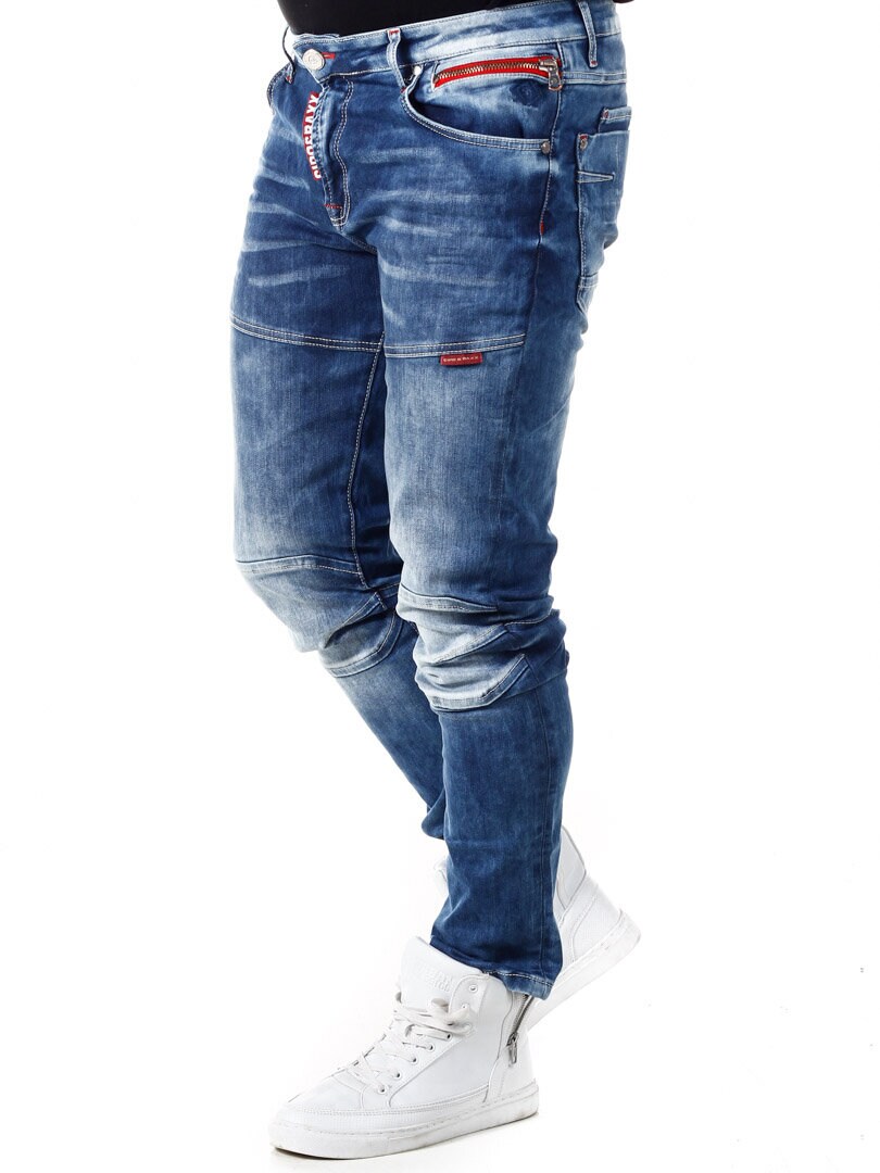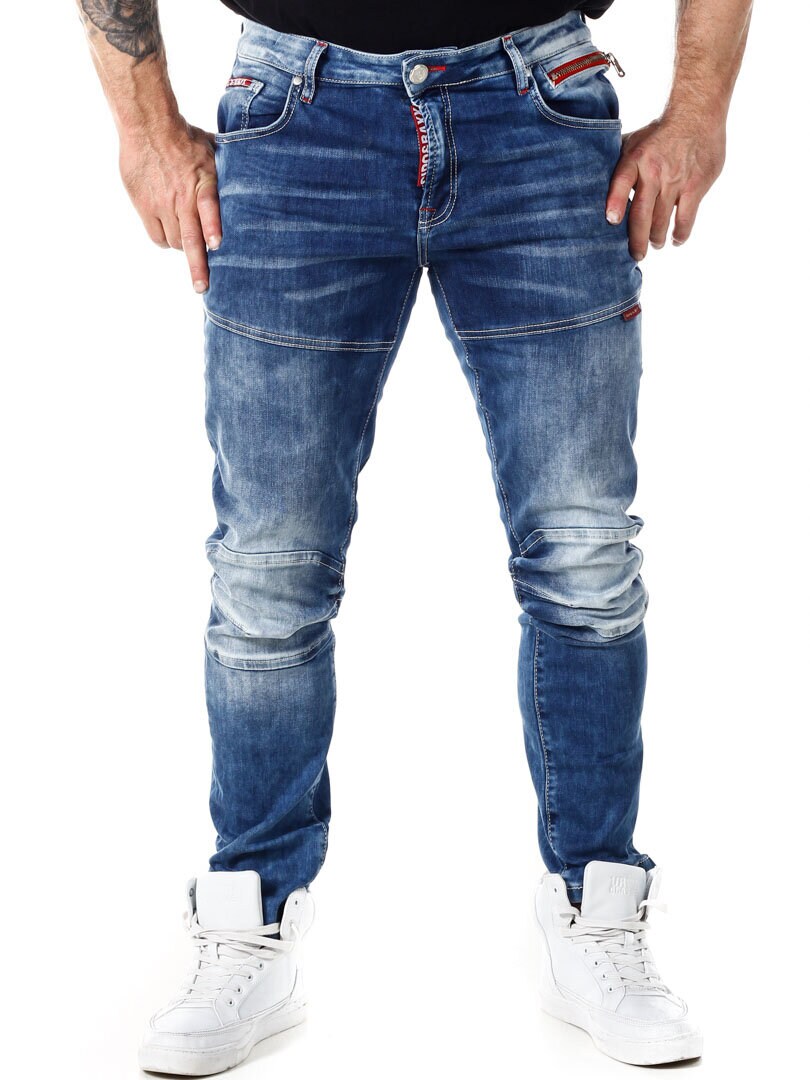 Byxor i stretchig denim med extra sömmar framme vid låren och knäna. Fyra bakfickor och fyra framfickor, varav ena fickan har dragkedja. Röda detaljer som ger en snygg look!