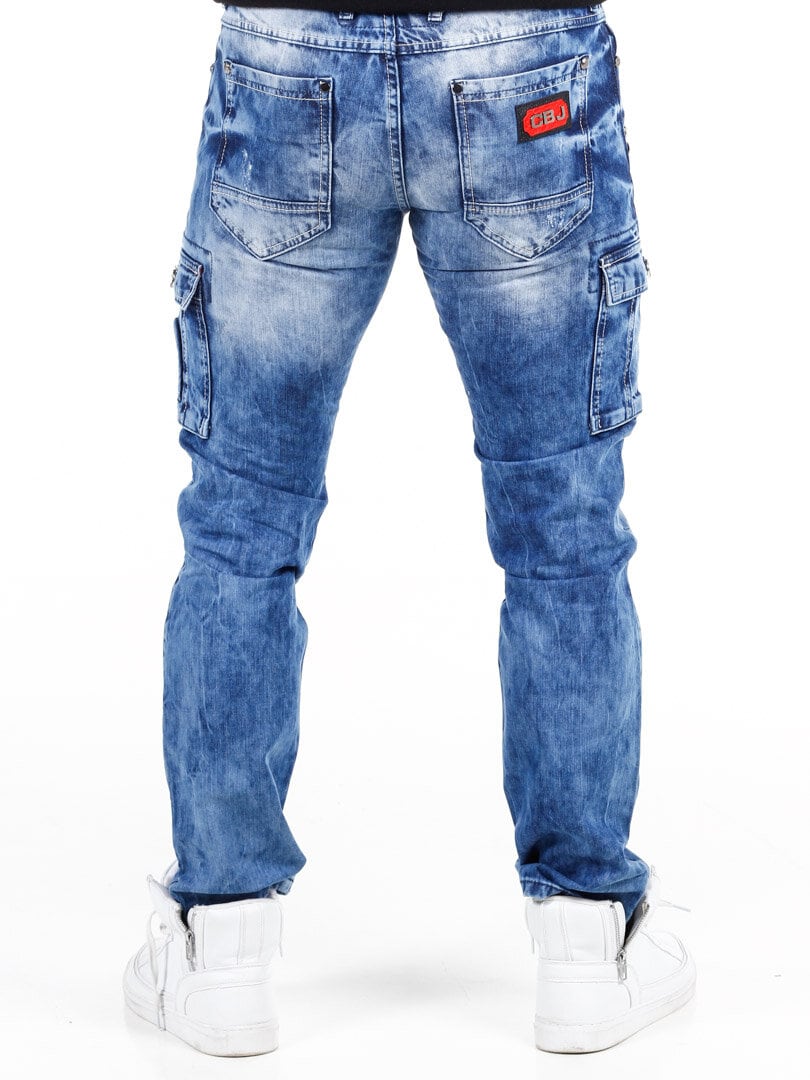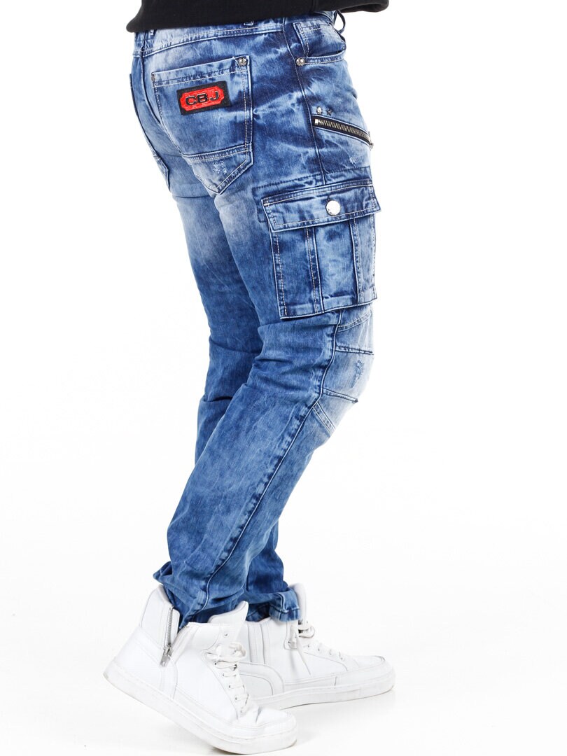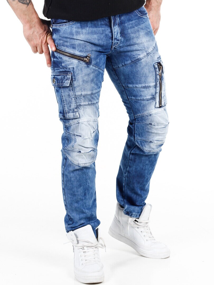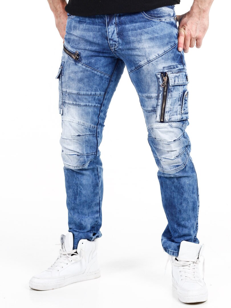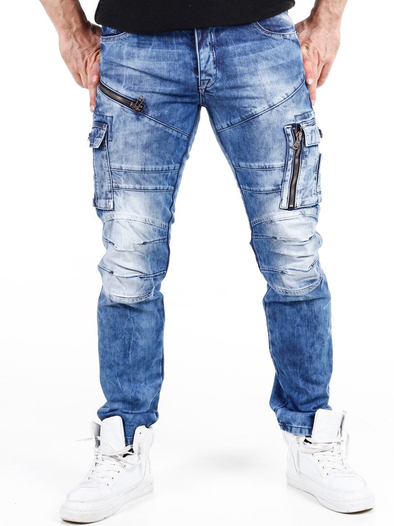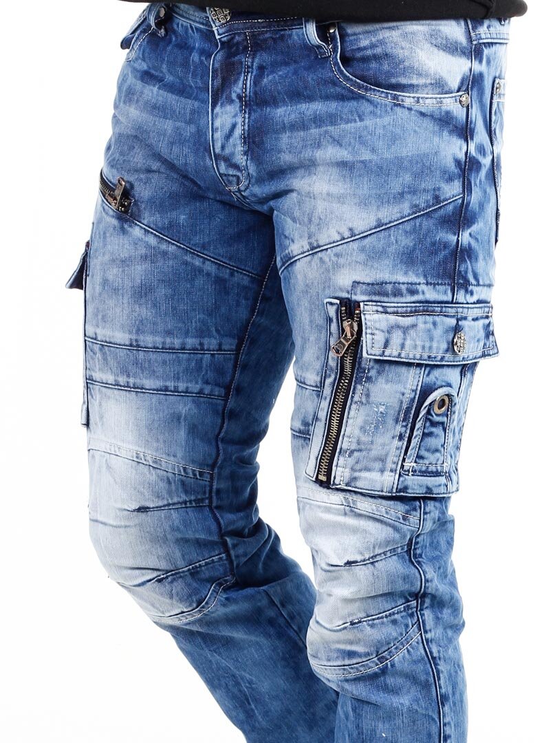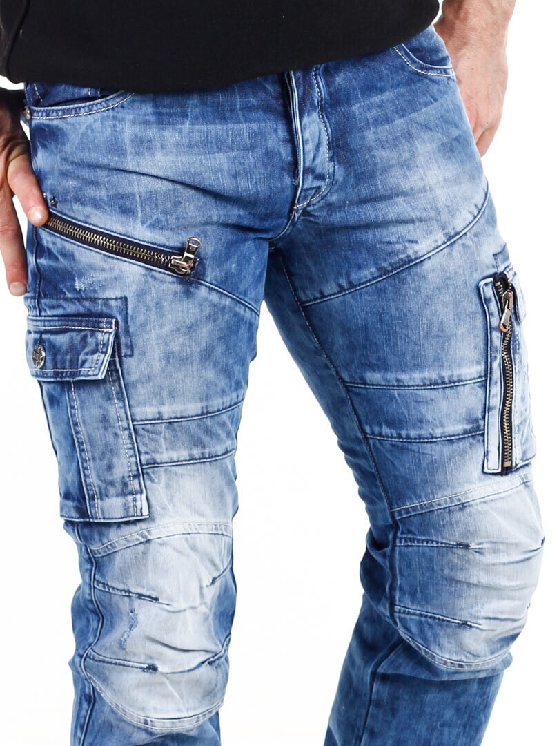Mellanblå jeans med slitningar, metallnitar, grova dragkedjor och patches i svart skinnimitation med loggan. Gjorda i 100% bomull med rymliga bakfickor, tre fickor fram och två cargofickor som sitter på benen.