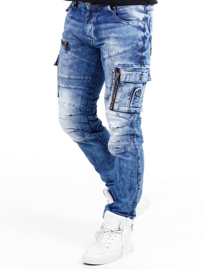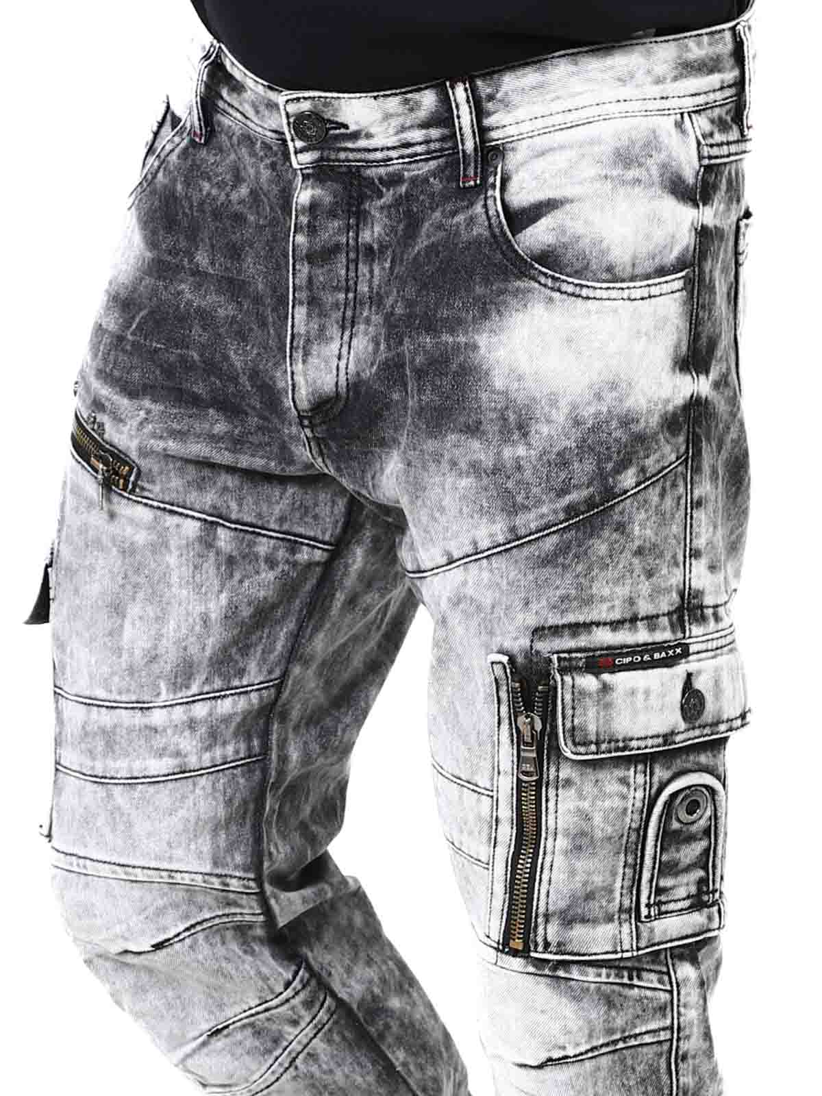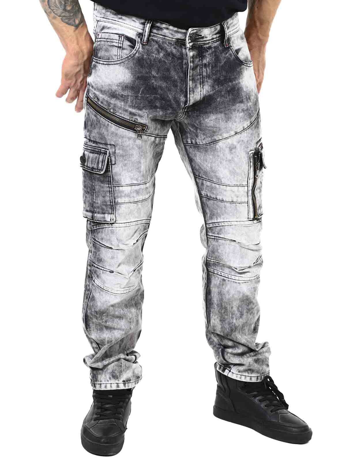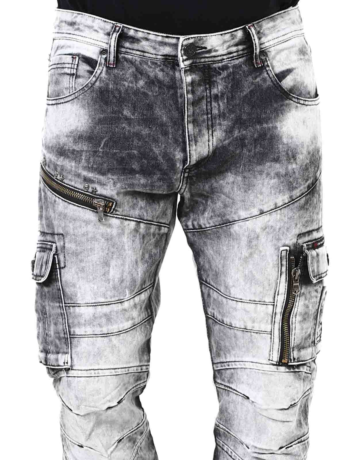 Cargoinspirerade jeans i en tuff, gråsvart tvätt med slitna detaljer och markerade sömmar. De dekorativa dragkedjorna och nitarna framtill ger byxorna en rå edge, medan cargofickorna på benen gör dem praktiska. Perfekta för dig som vill sticka ut med stil och självförtroende!