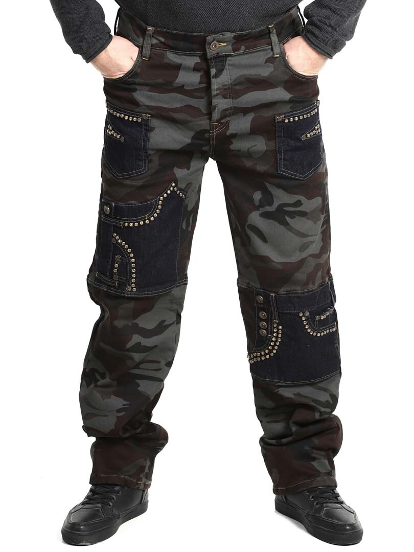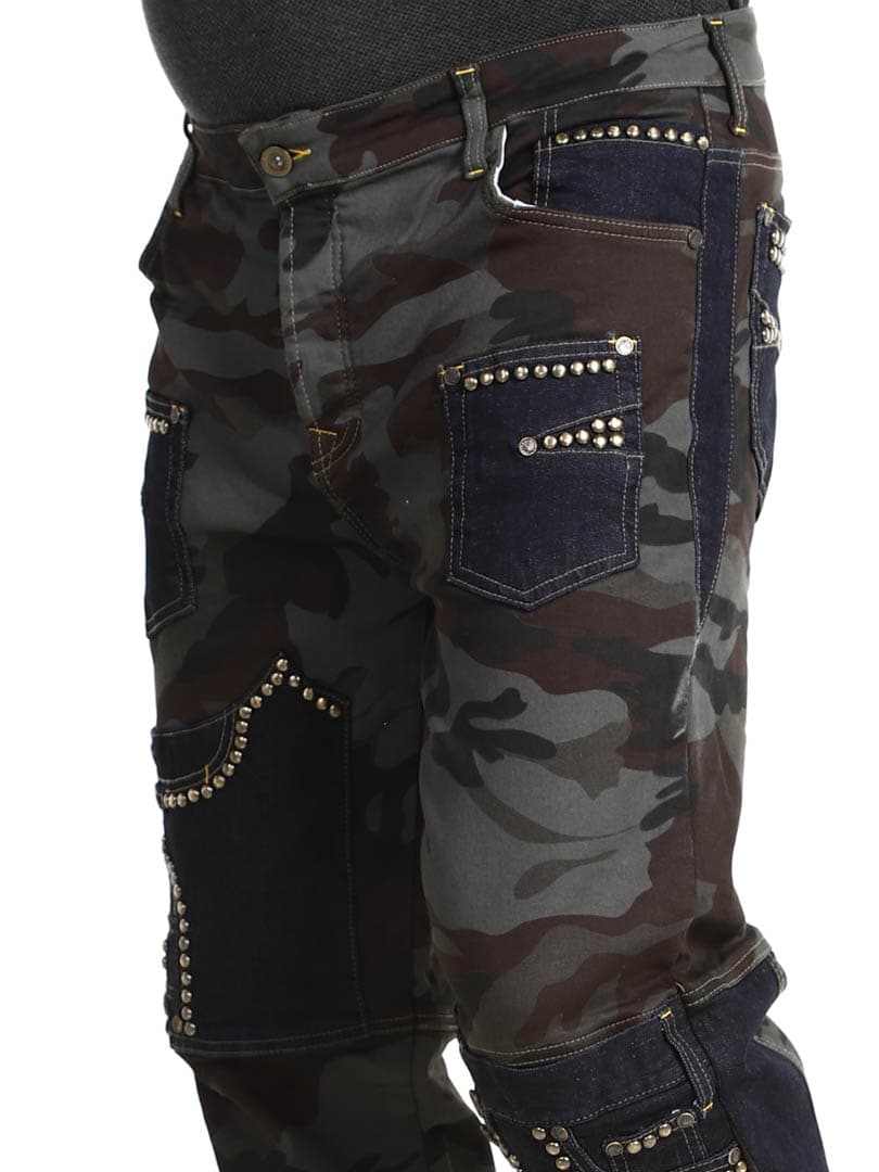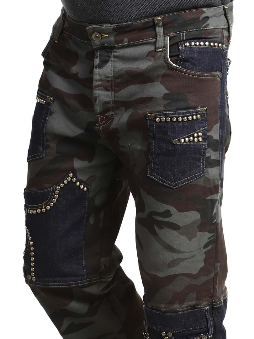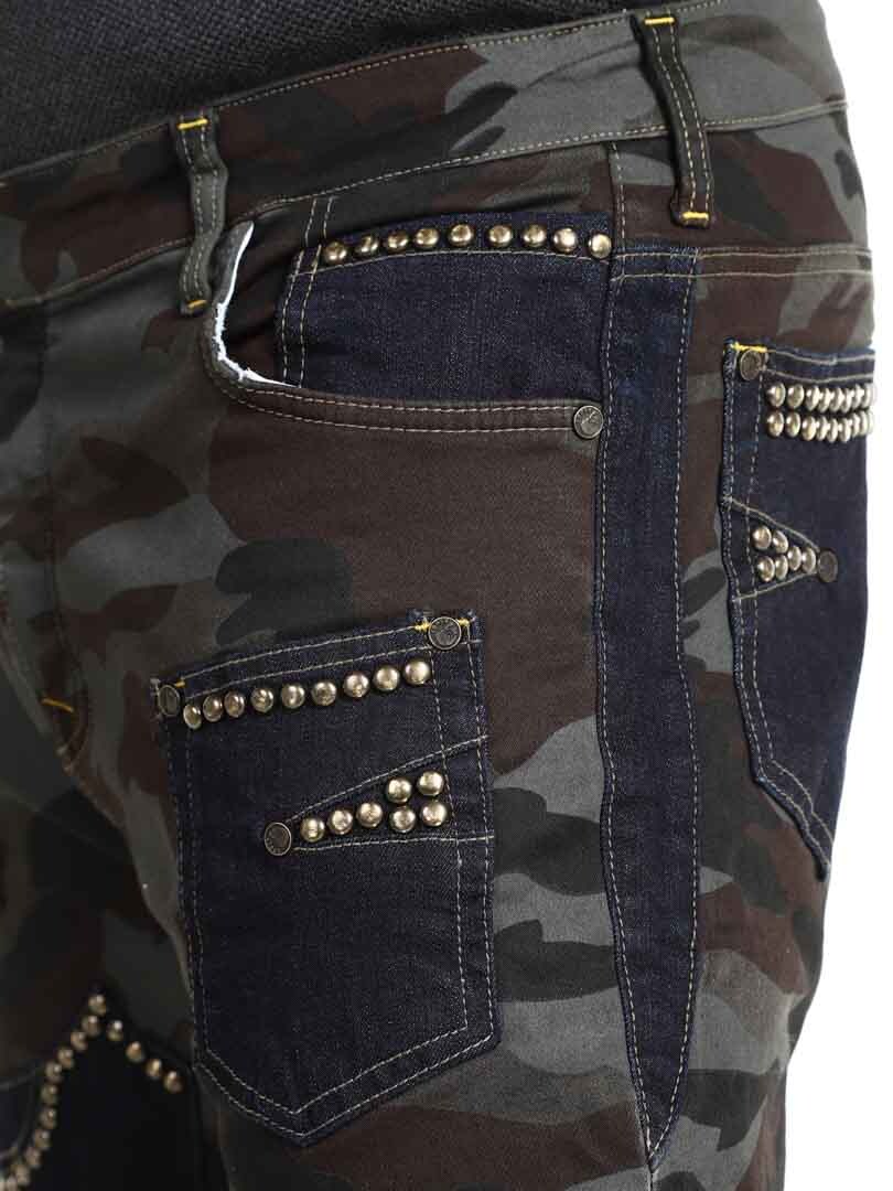 Dessa byxor kombinerar militärmönstrad design med kontrasterande denimpaneler och dekorativa nitar, vilket ger en rå och iögonfallande stil. De har flera funktionella och snygga fickor. Den stretchiga passformen ger komfort och rörelsefrihet, samtidigt som byxorna är perfekta för dig som vill sticka ut med en edgy look!