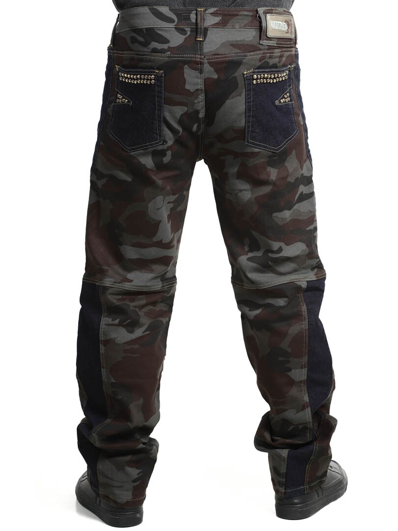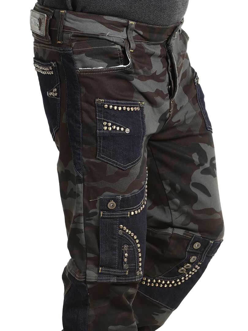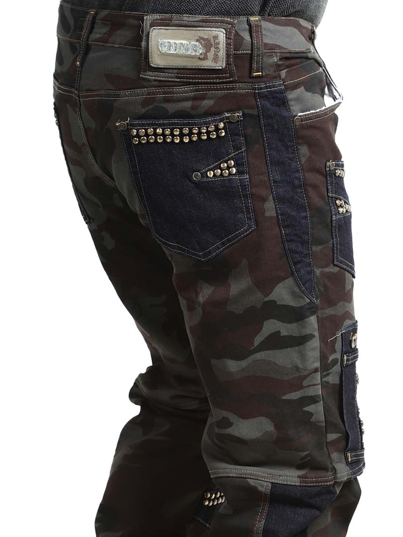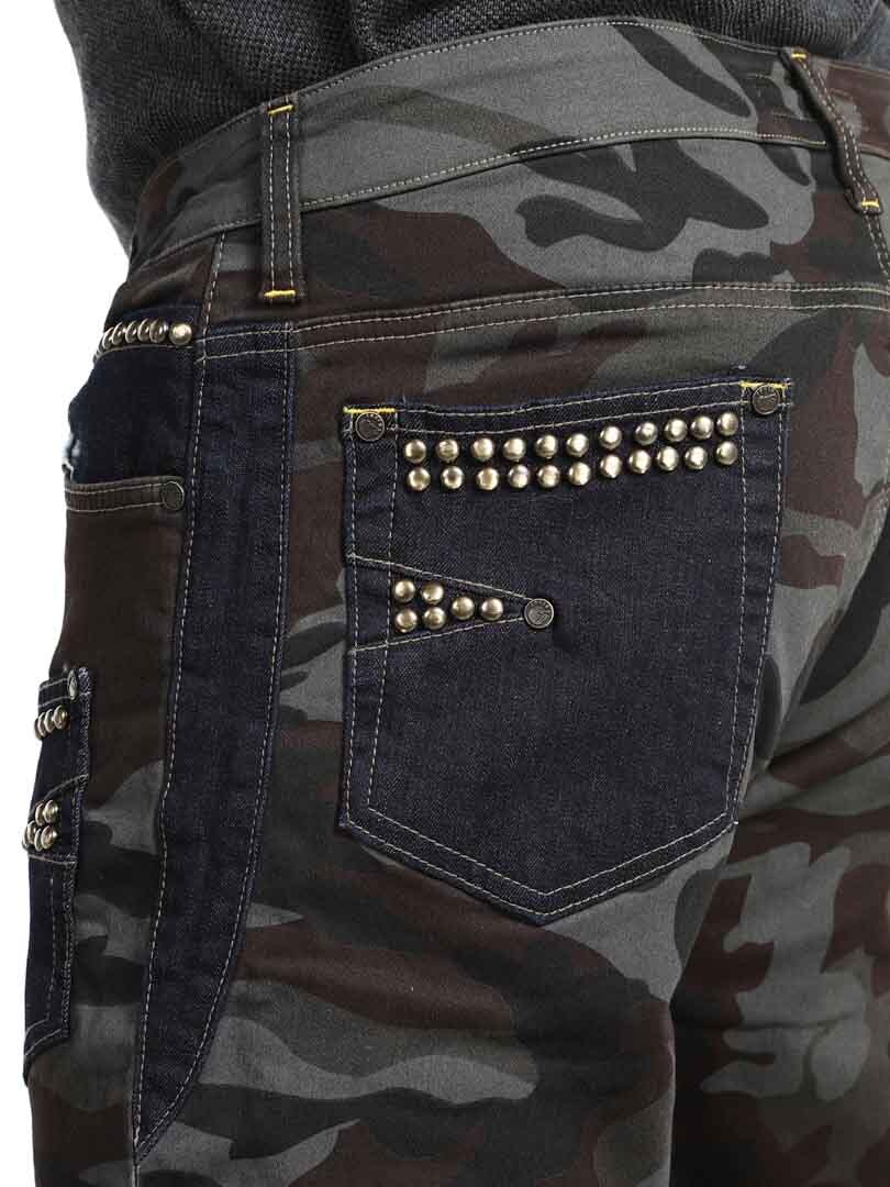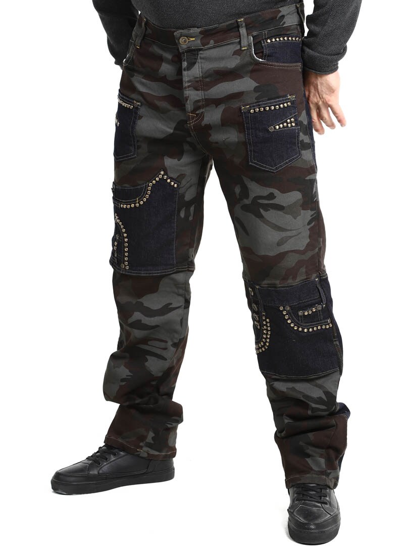 Dessa byxor kombinerar militärmönstrad design med kontrasterande denimpaneler och dekorativa nitar, vilket ger en rå och iögonfallande stil. De har flera funktionella och snygga fickor. Den stretchiga passformen ger komfort och rörelsefrihet, samtidigt som byxorna är perfekta för dig som vill sticka ut med en edgy look!