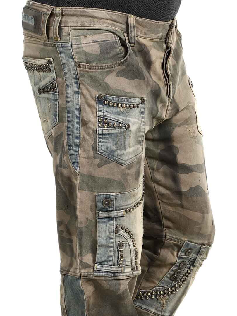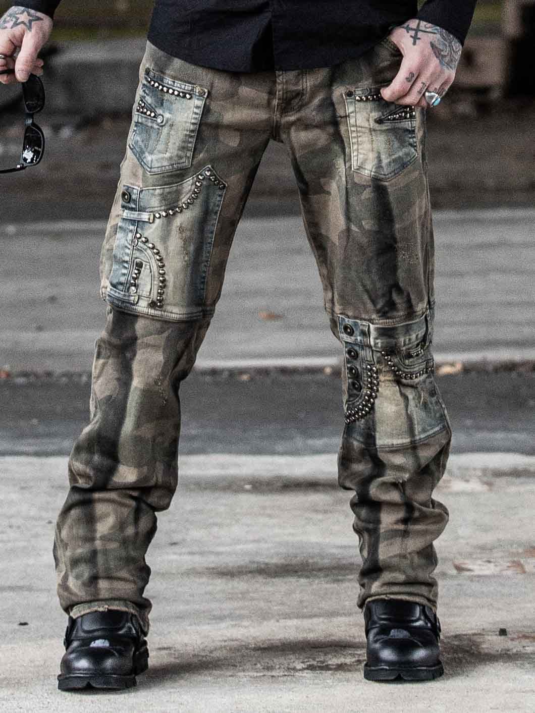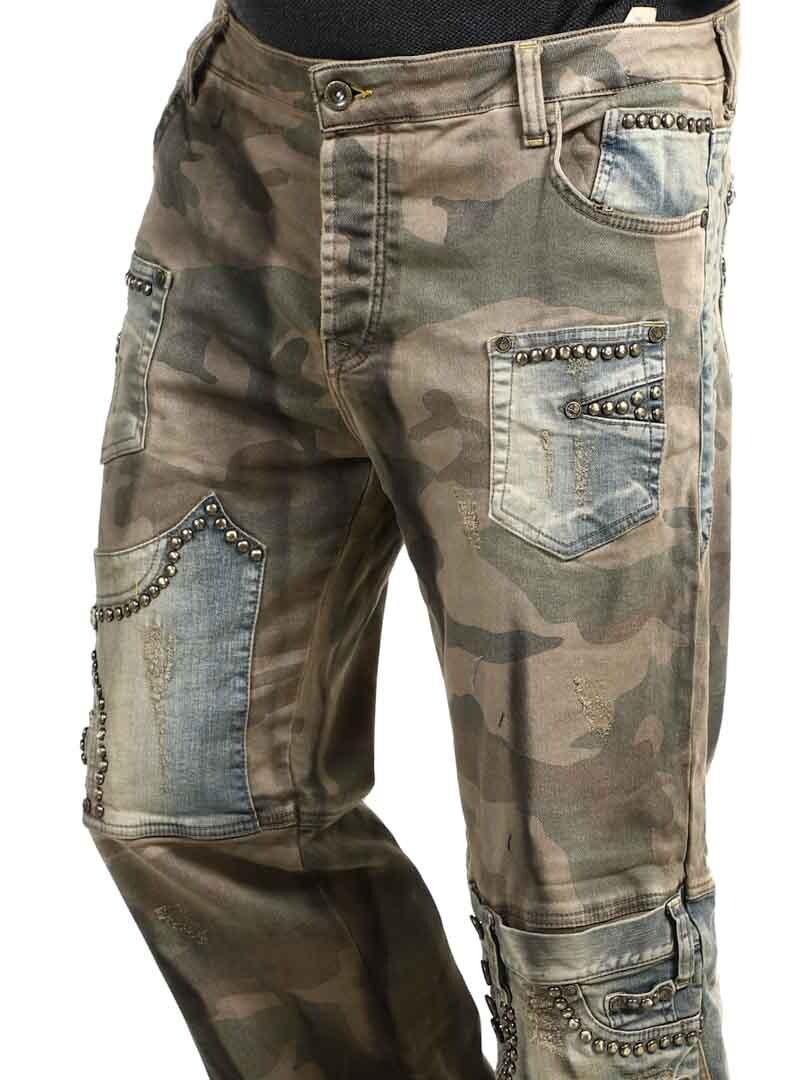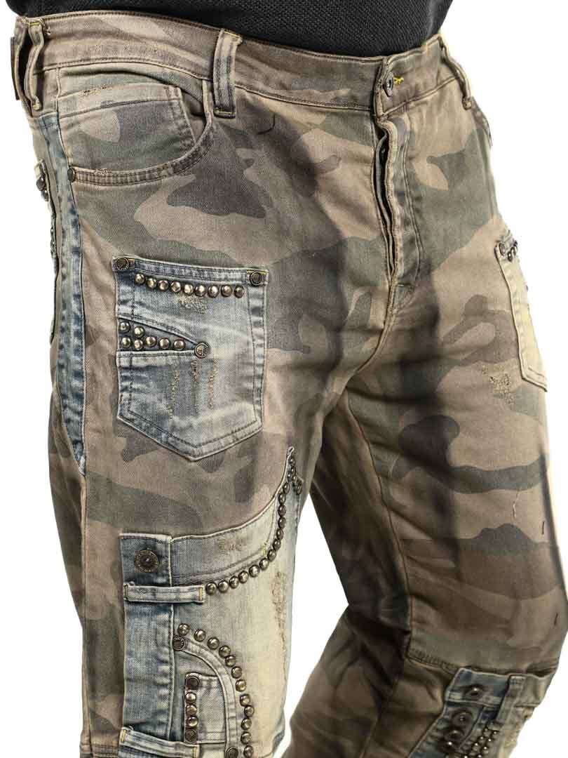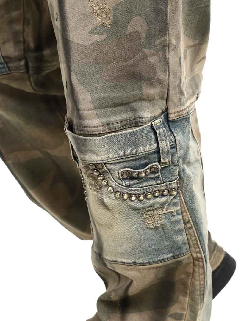 Dessa byxor kombinerar militärmönstrad design med kontrasterande denimpaneler och dekorativa nitar, vilket ger en rå och iögonfallande stil. De har flera funktionella och snygga fickor. Den stretchiga passformen ger komfort och rörelsefrihet, samtidigt som byxorna är perfekta för dig som vill sticka ut med en edgy look!