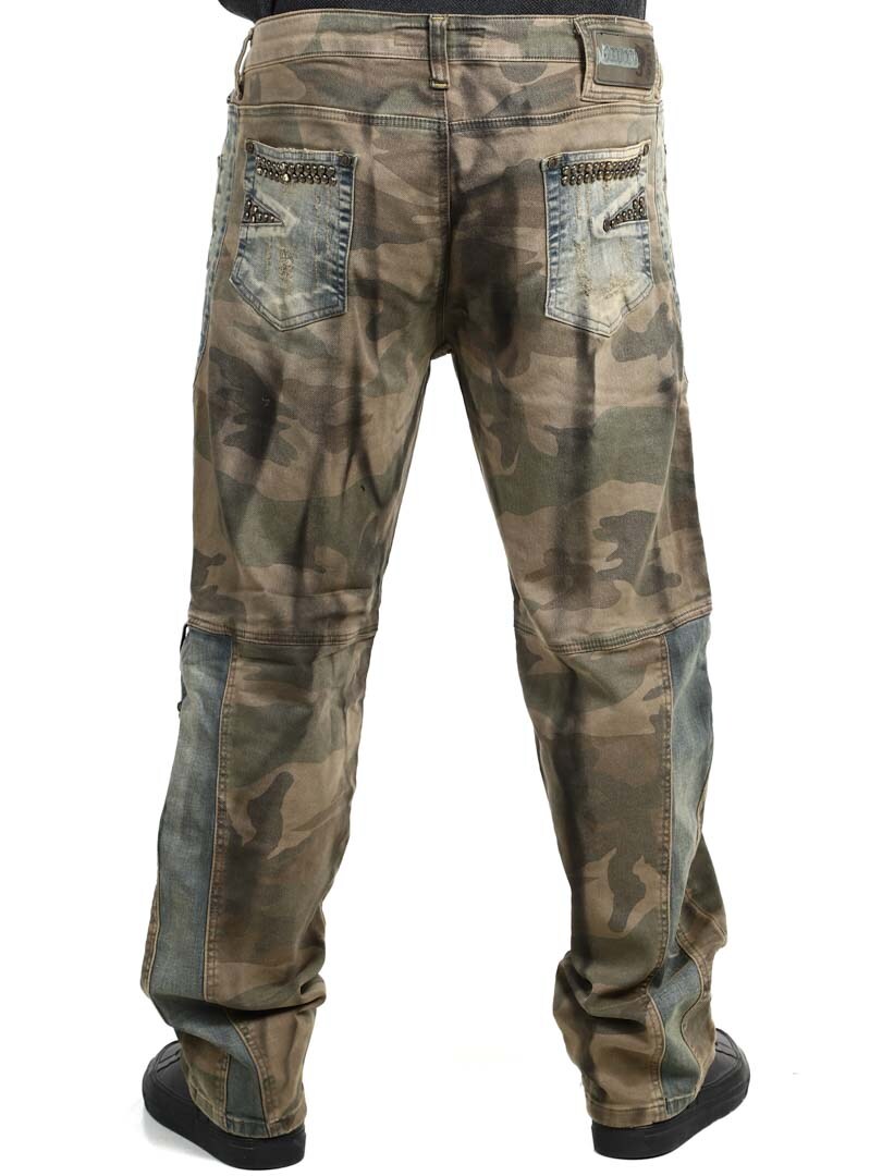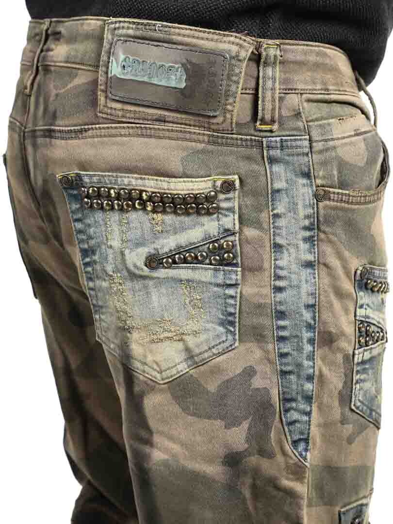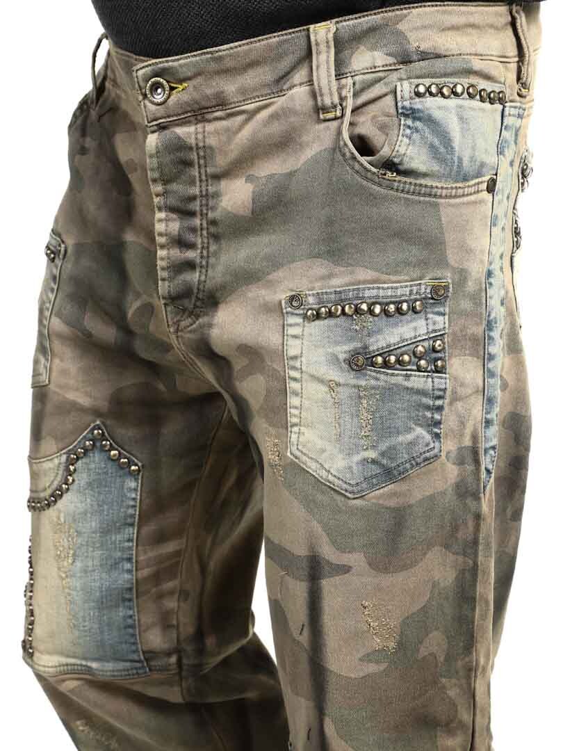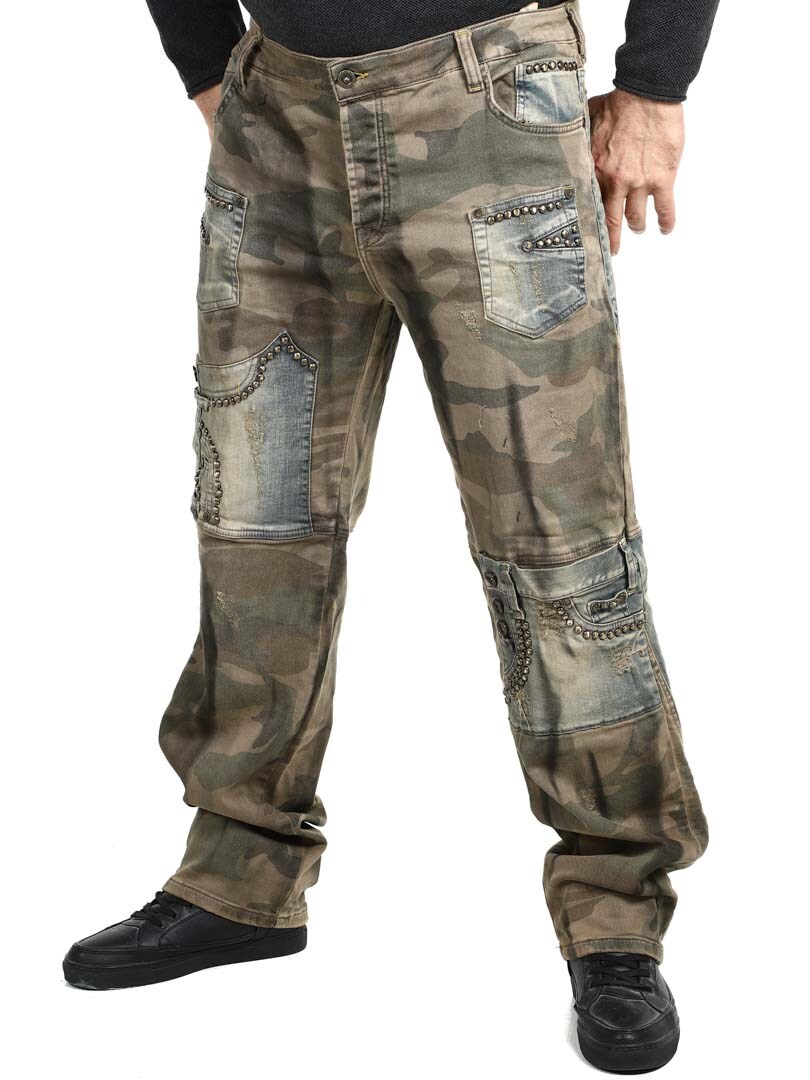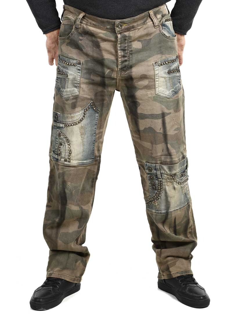 Dessa byxor kombinerar militärmönstrad design med kontrasterande denimpaneler och dekorativa nitar, vilket ger en rå och iögonfallande stil. De har flera funktionella och snygga fickor. Den stretchiga passformen ger komfort och rörelsefrihet, samtidigt som byxorna är perfekta för dig som vill sticka ut med en edgy look!