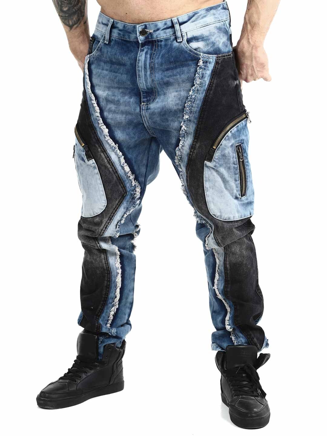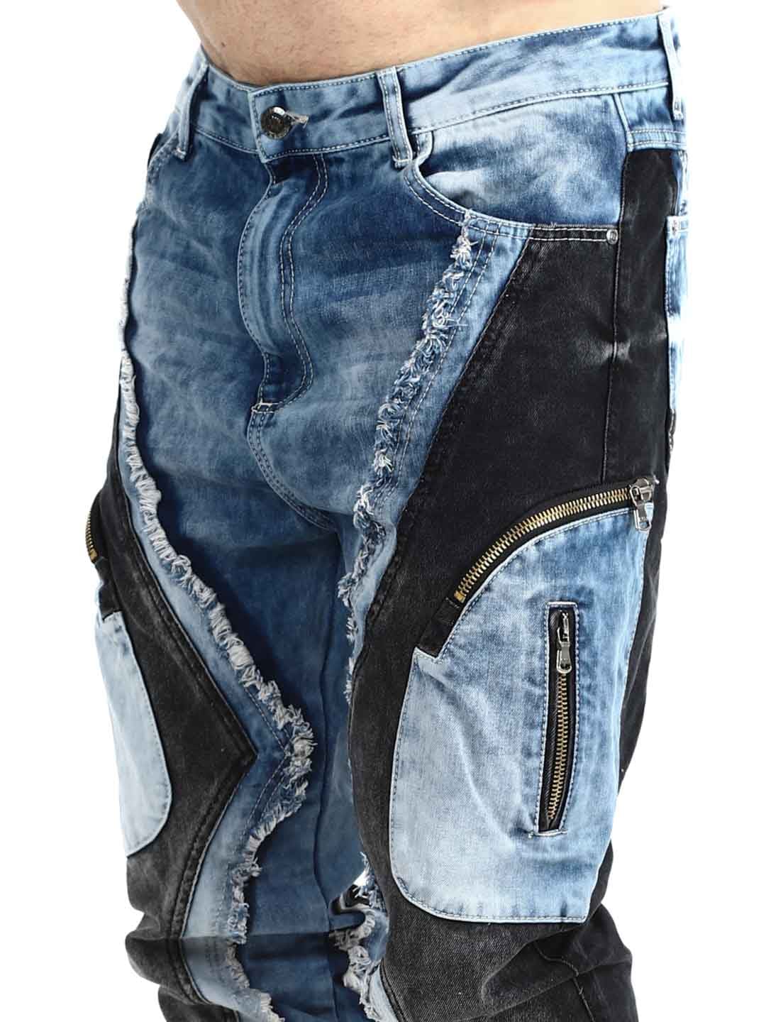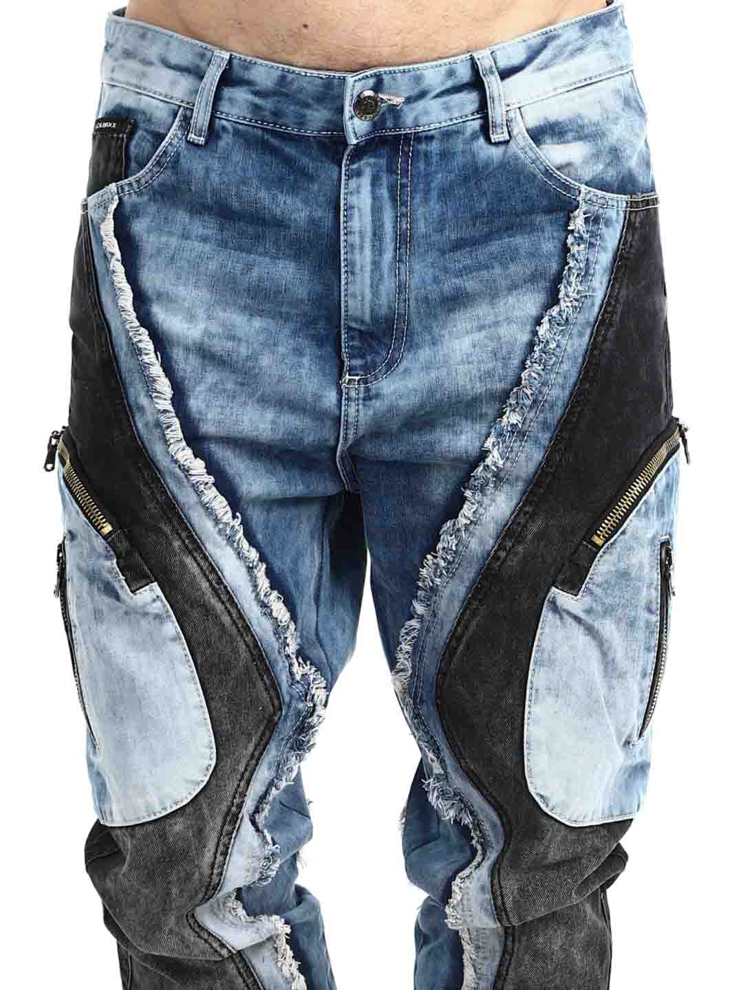 Dessa jeans är designade för dig som vill sticka ut. Modellen har en unik patchwork-look med kontrasterande denimfält, fransade kanter och markerade sömmar som ger en kraftfull, urban attityd. De flera dragkedjorna förstärker den edgy stilen och ger byxorna en tydlig street- och bikerinspirerad känsla.