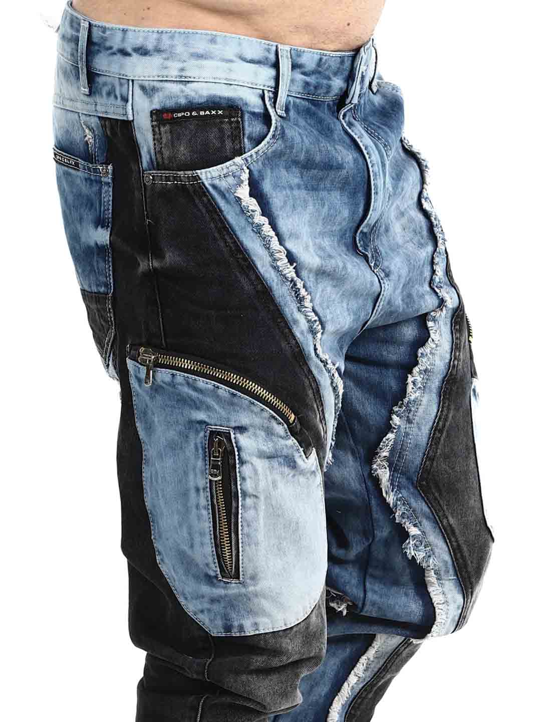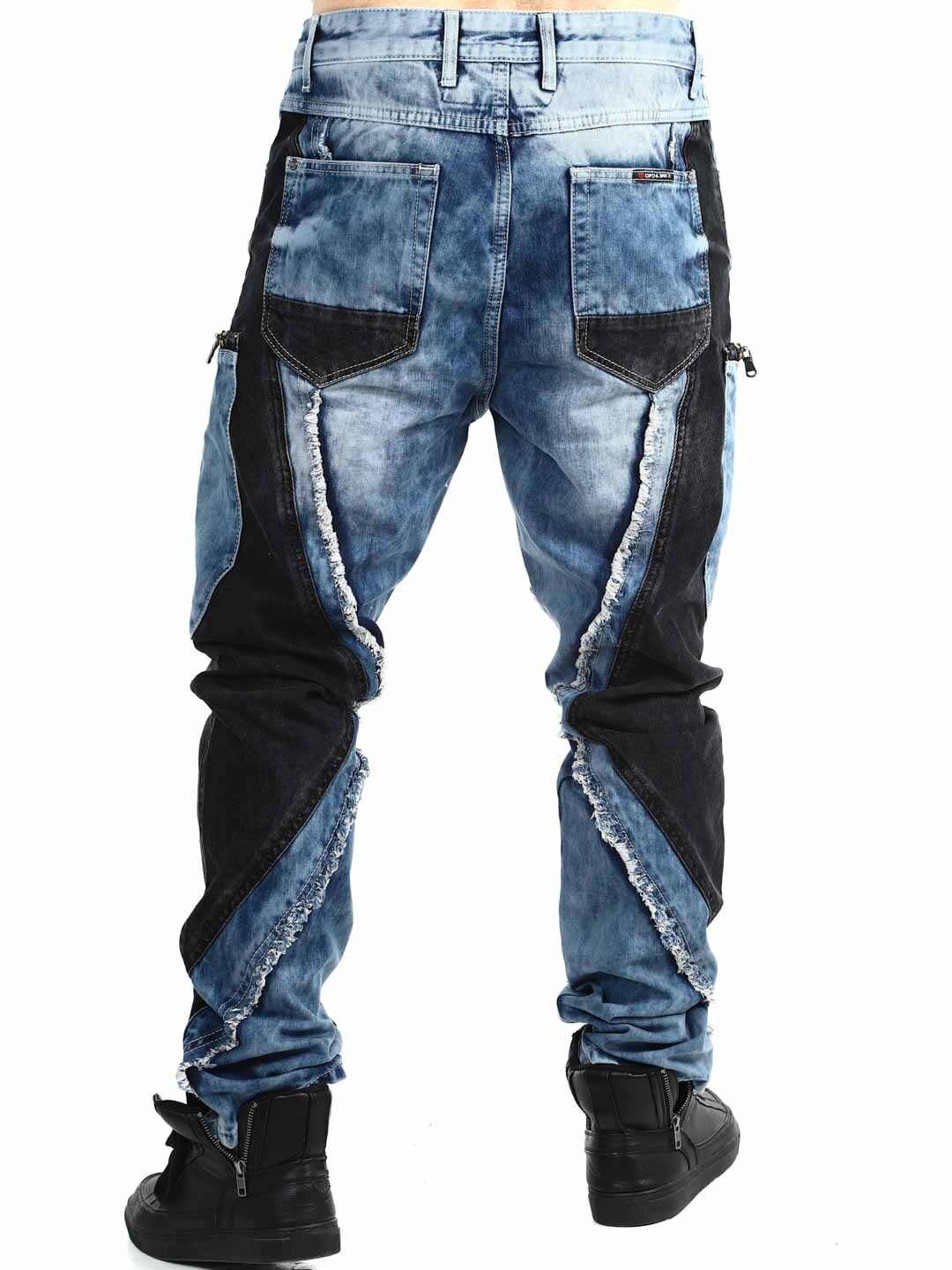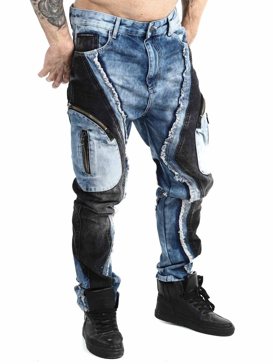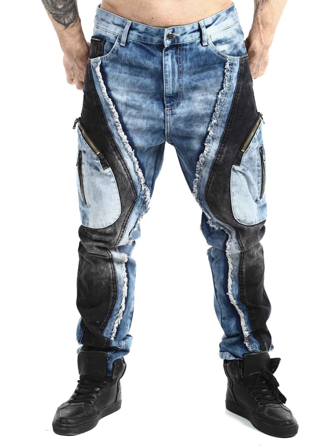 Dessa jeans är designade för dig som vill sticka ut. Modellen har en unik patchwork-look med kontrasterande denimfält, fransade kanter och markerade sömmar som ger en kraftfull, urban attityd. De flera dragkedjorna förstärker den edgy stilen och ger byxorna en tydlig street- och bikerinspirerad känsla.