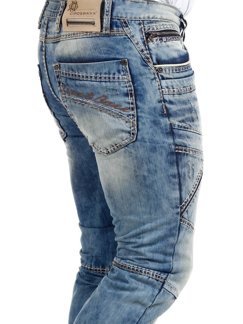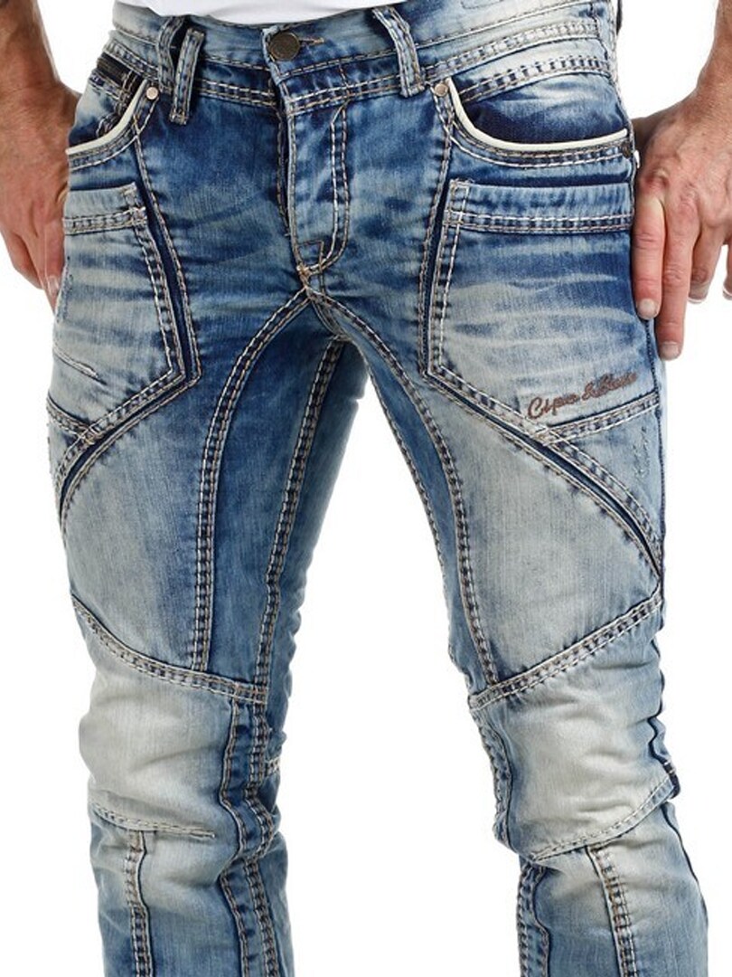 Byxor i mjuk denim med slitningar och grova sömmar i vitt och beige. Något smalare modell med tre fickor fram och två bak. Detaljerade med patch med loggan i linningen och en mindre dragkedja fram.