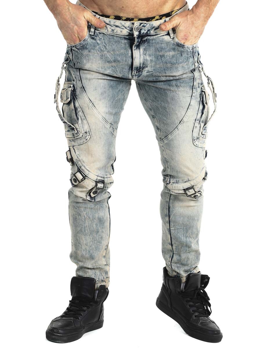 Slim fit-jeans med kraftigt blekt finish och markanta detaljer. Cargofickor och dekorativa remmar med spännen längs benen ger ett industriellt uttryck med attityd. Tillverkade i ett stretchigt denimtyg som ger en skön följsamhet trots den smala passformen. Perfekta för dig som gärna låter byxorna ta huvudrollen i outfiten!