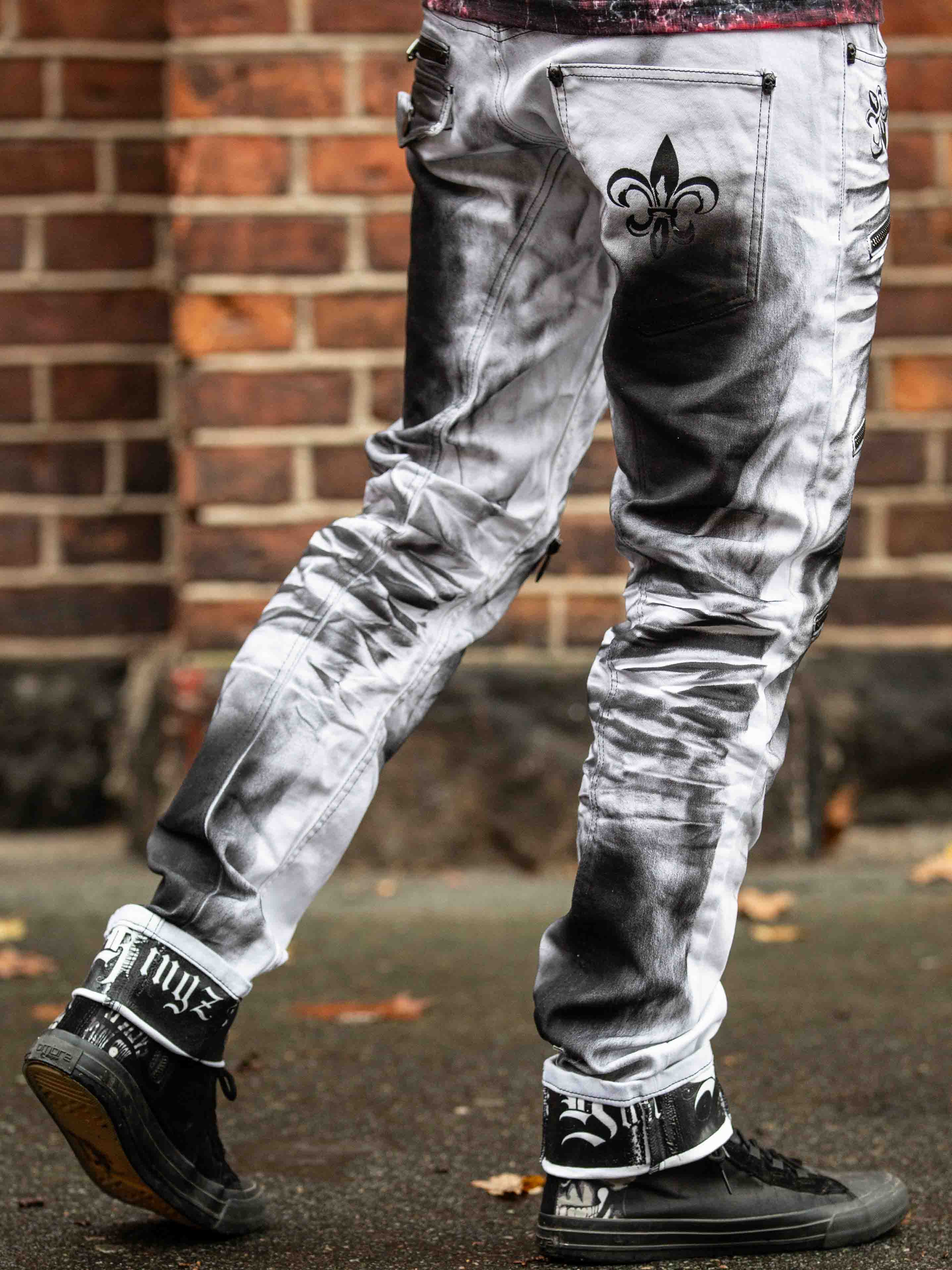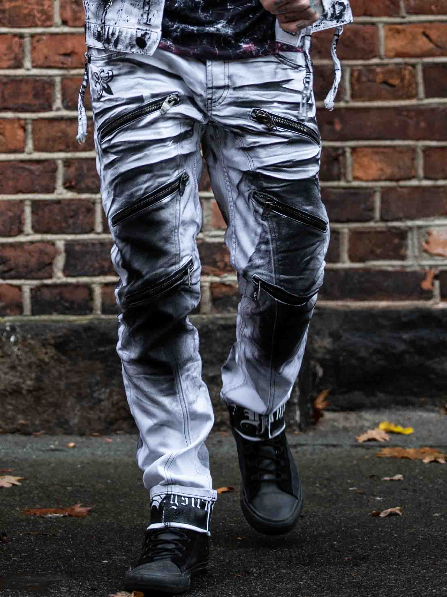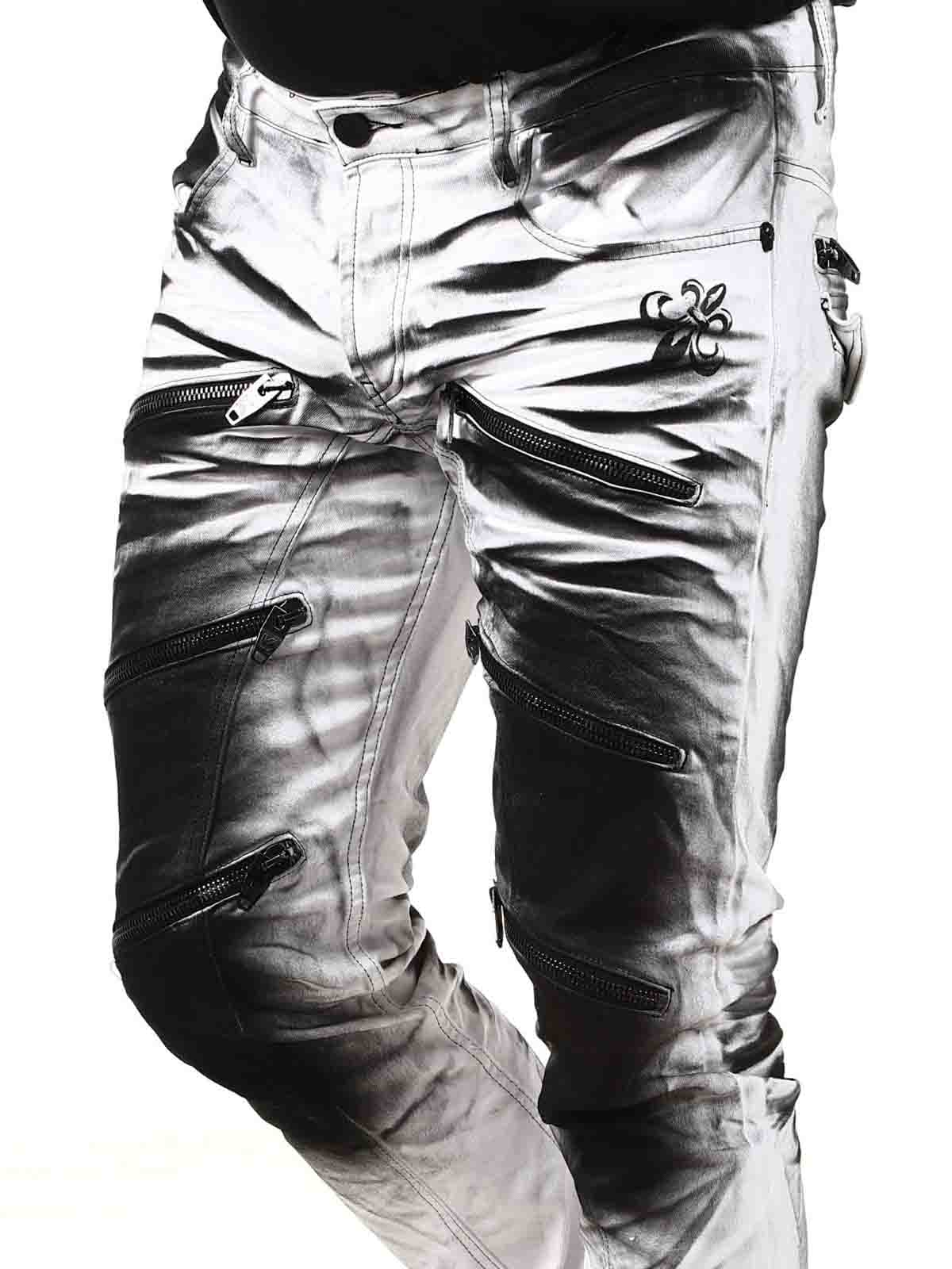 Tuffa jeans med tryck i bensluten vid uppvik. Jeansen har tre framfickor, två bakfickor och har bälteshällor i midjan. Dem är tufft detaljerade med dragkedjor, tryck och kontrastsömmar.