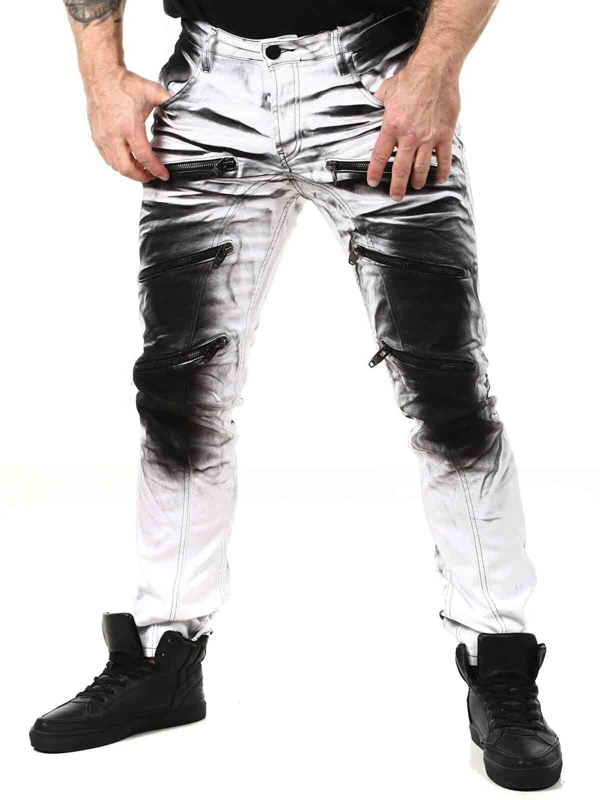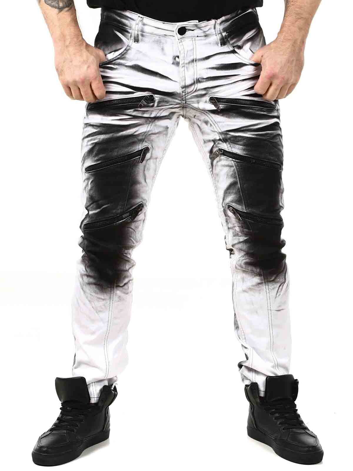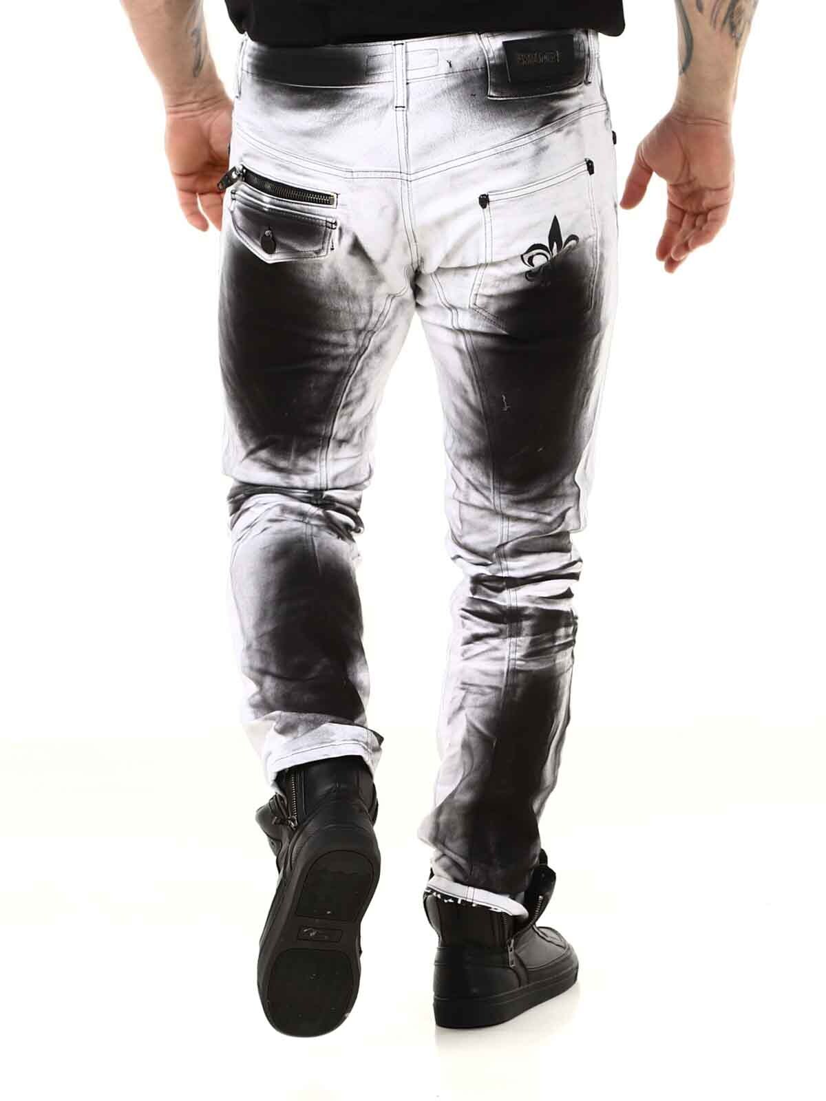 Tuffa jeans med tryck i bensluten vid uppvik. Jeansen har tre framfickor, två bakfickor och har bälteshällor i midjan. Dem är tufft detaljerade med dragkedjor, tryck och kontrastsömmar.