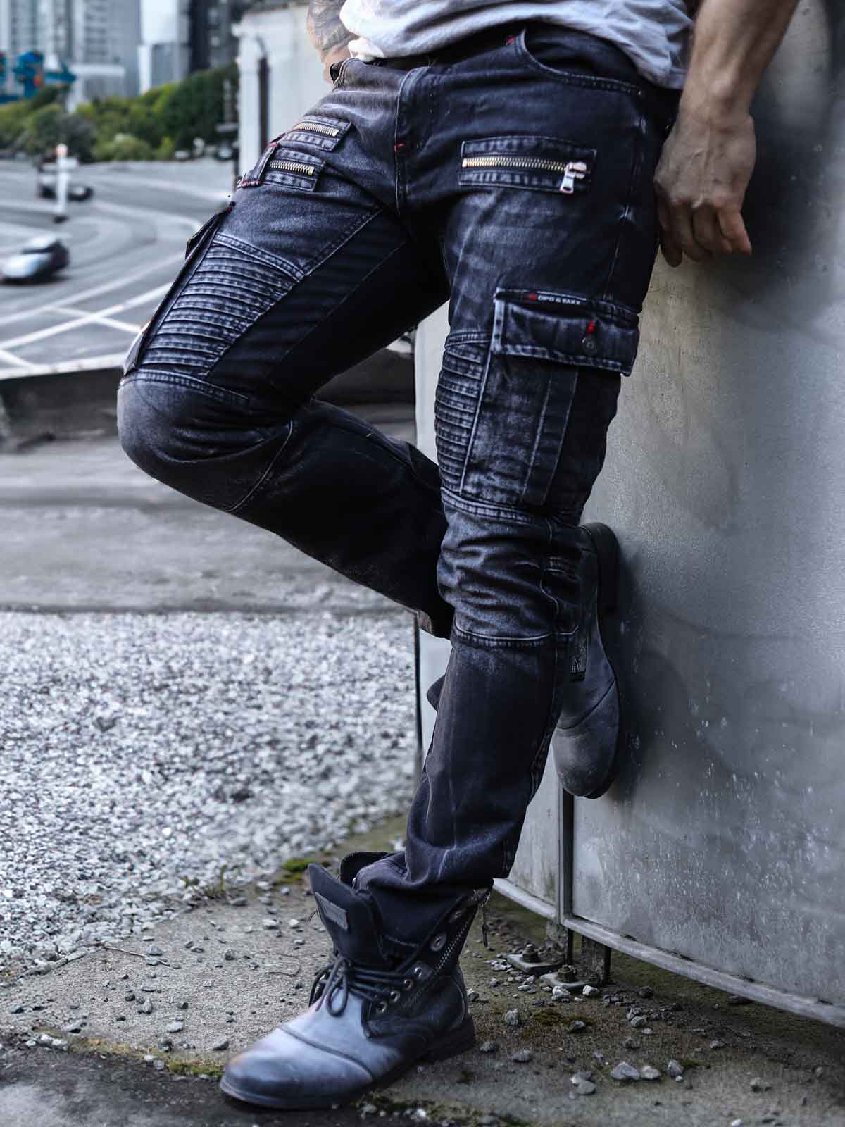 Hårda byxor i svart denim med sliten look. Designade med markerande sömmar, dragkedjor och räfflat parti. De har flera fickor och klassik passform.