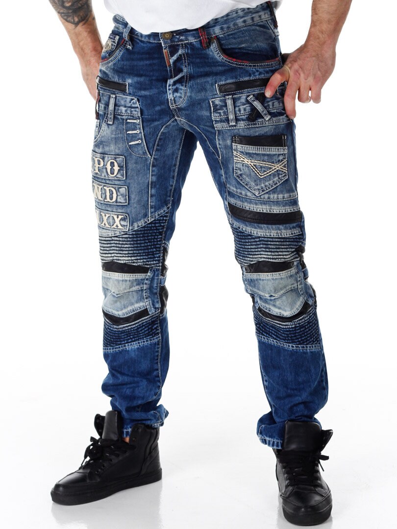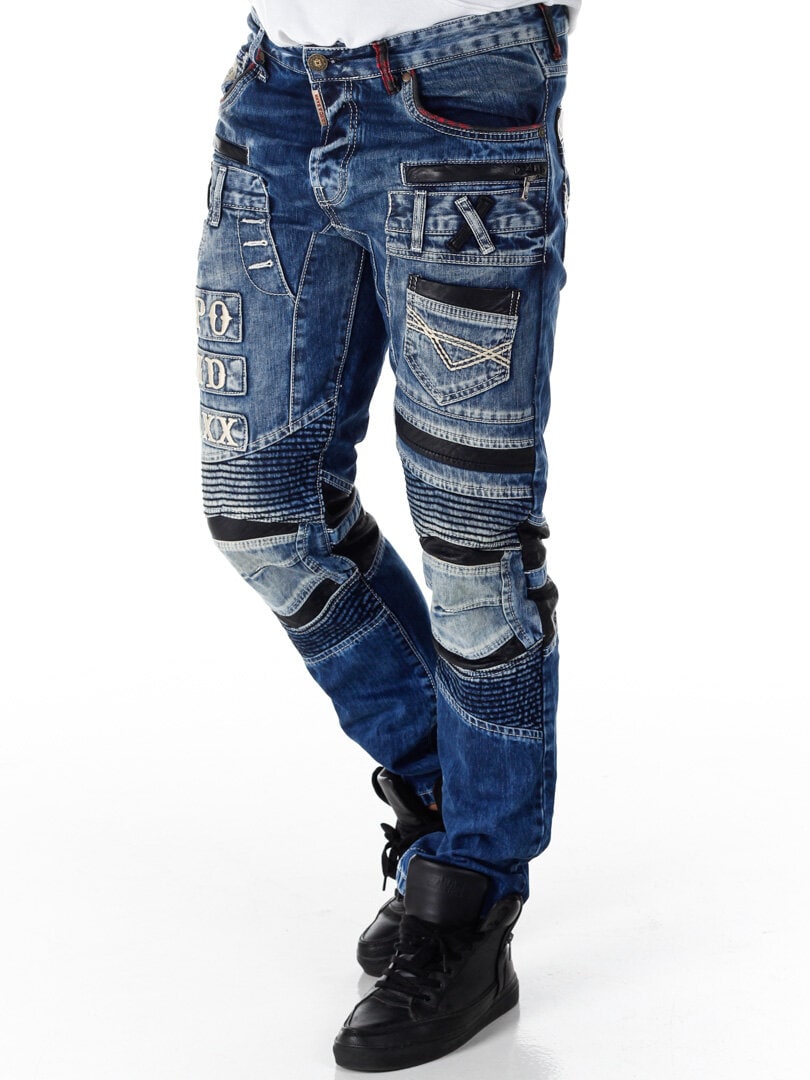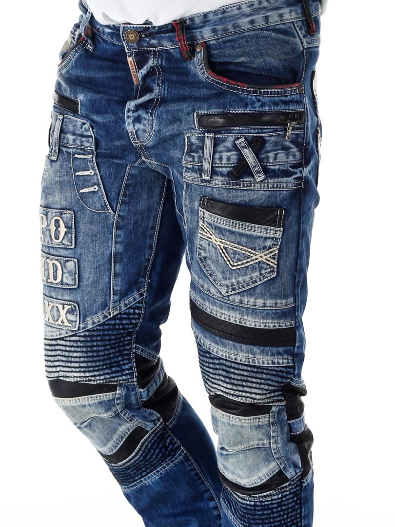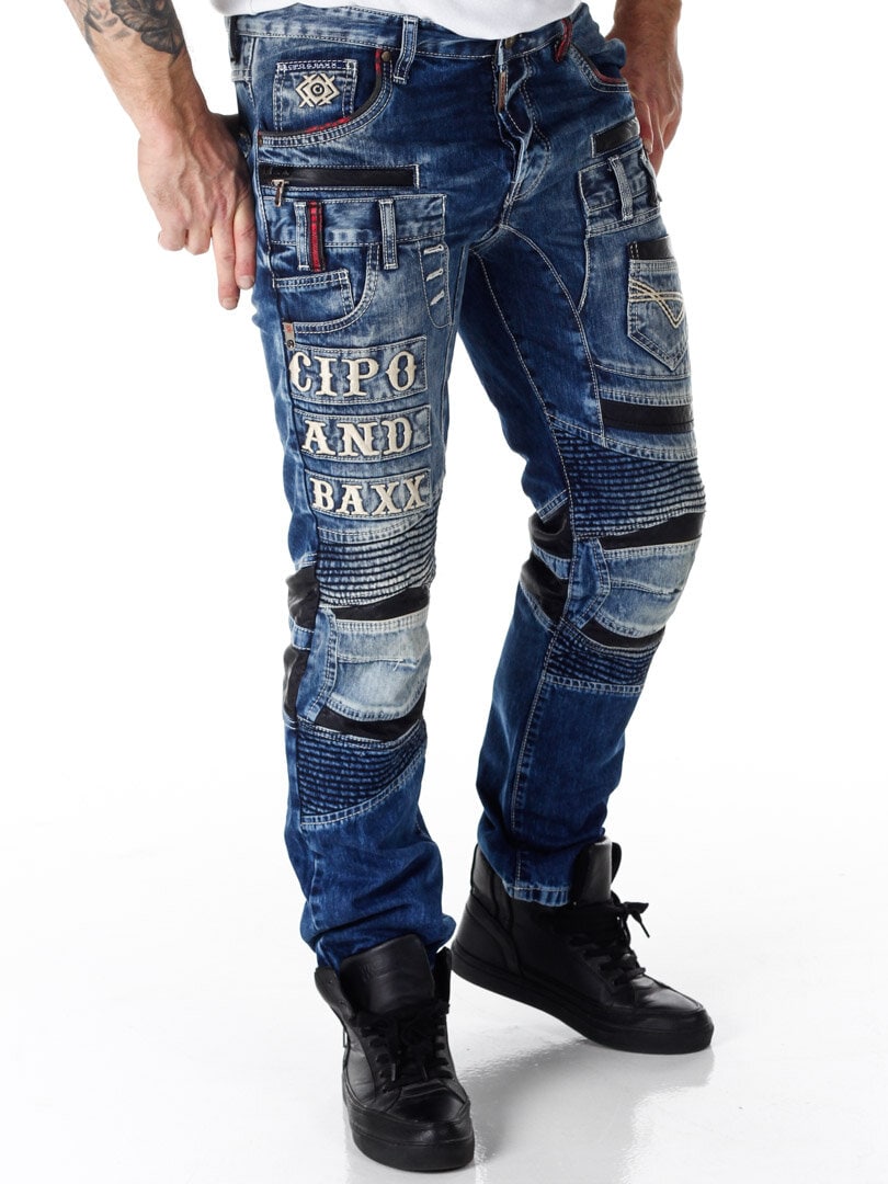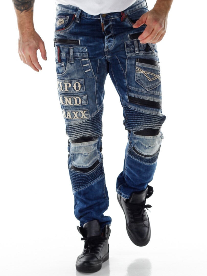 Byxor i tvättad denim med tuff design. De har klassisk passform och många fickor. Detaljerade med partier i skinnimitation, dragkedjor och skräddad logga.