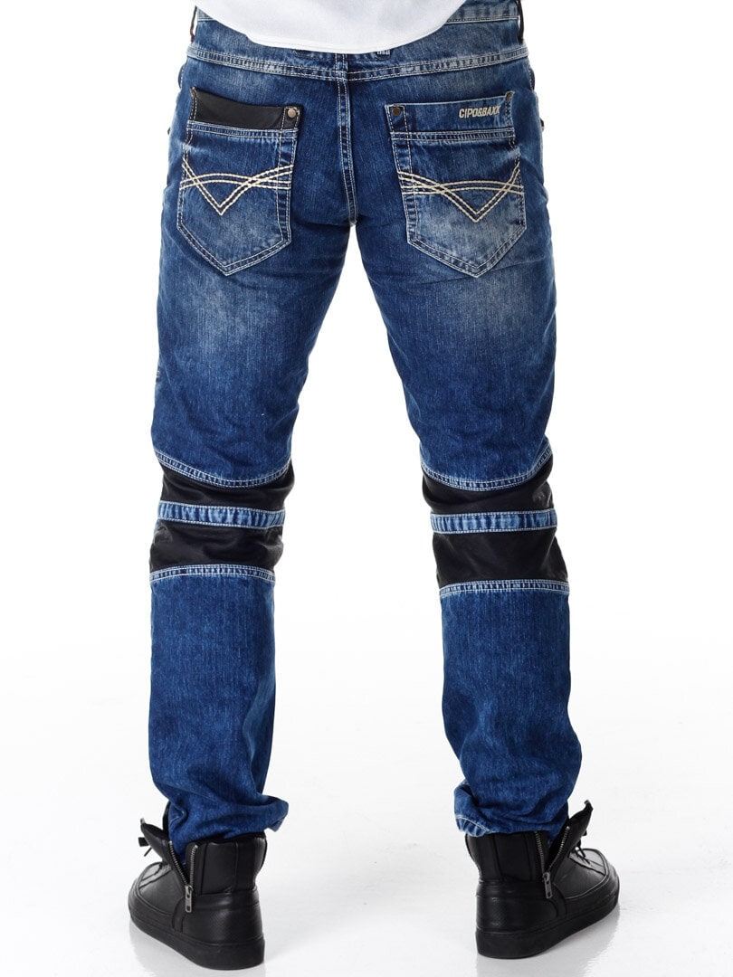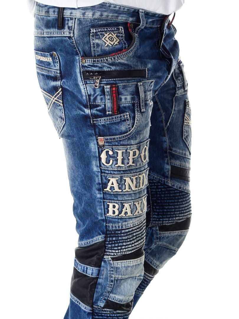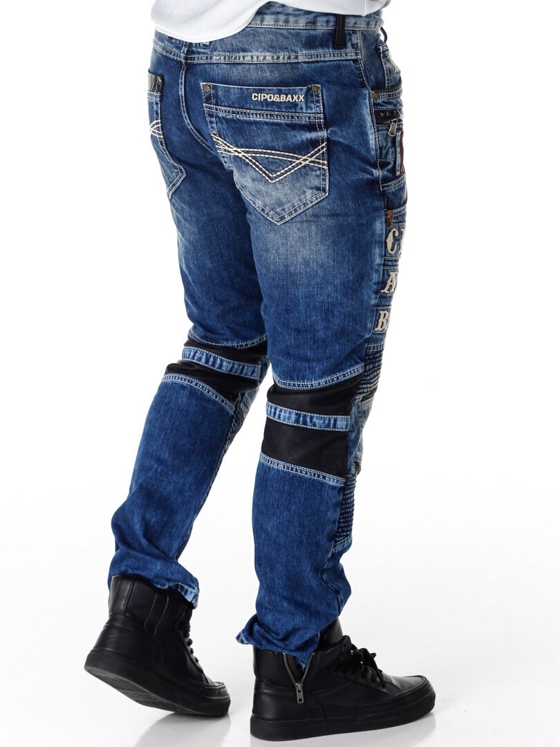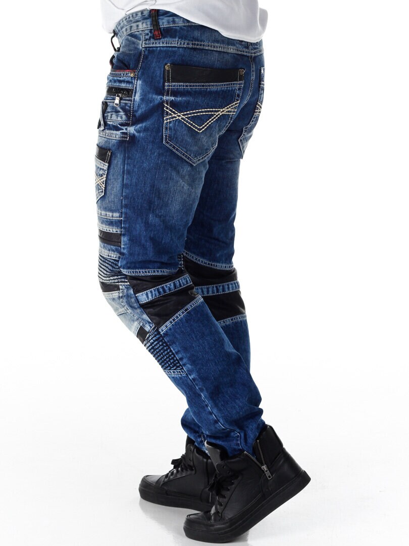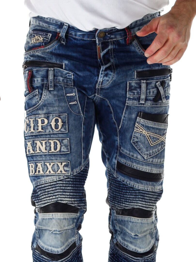 Byxor i tvättad denim med tuff design. De har klassisk passform och många fickor. Detaljerade med partier i skinnimitation, dragkedjor och skräddad logga.