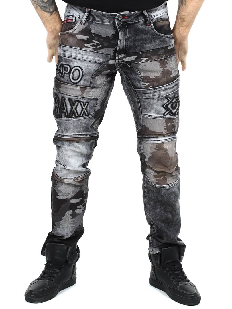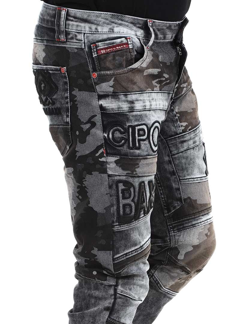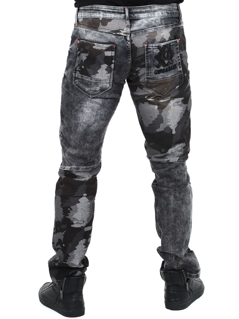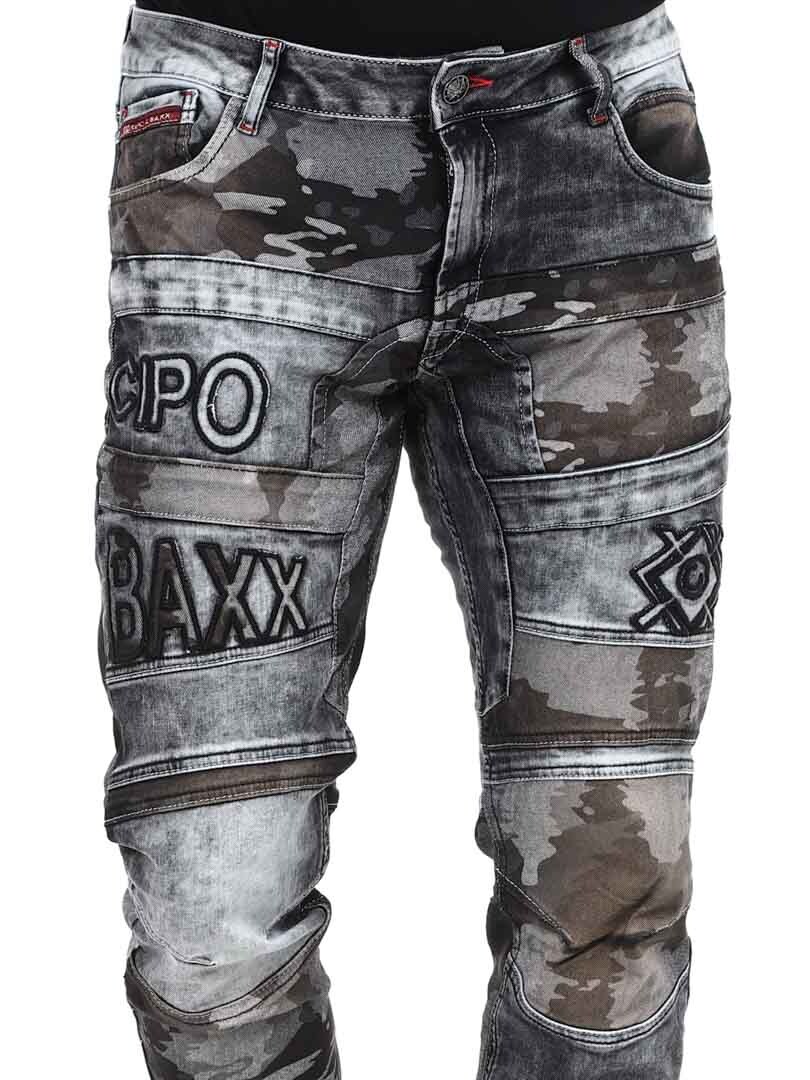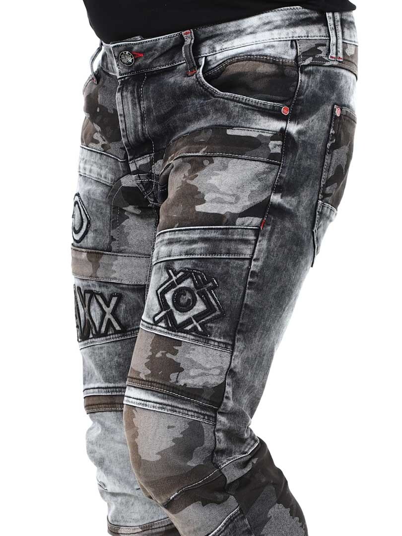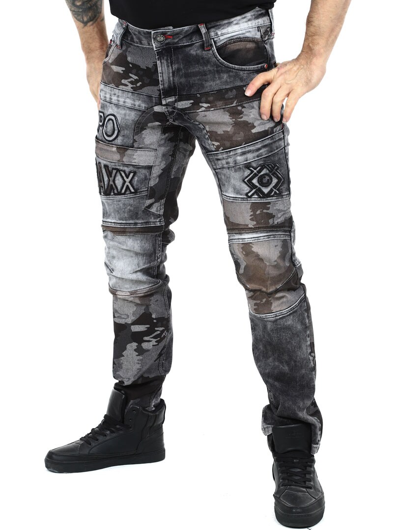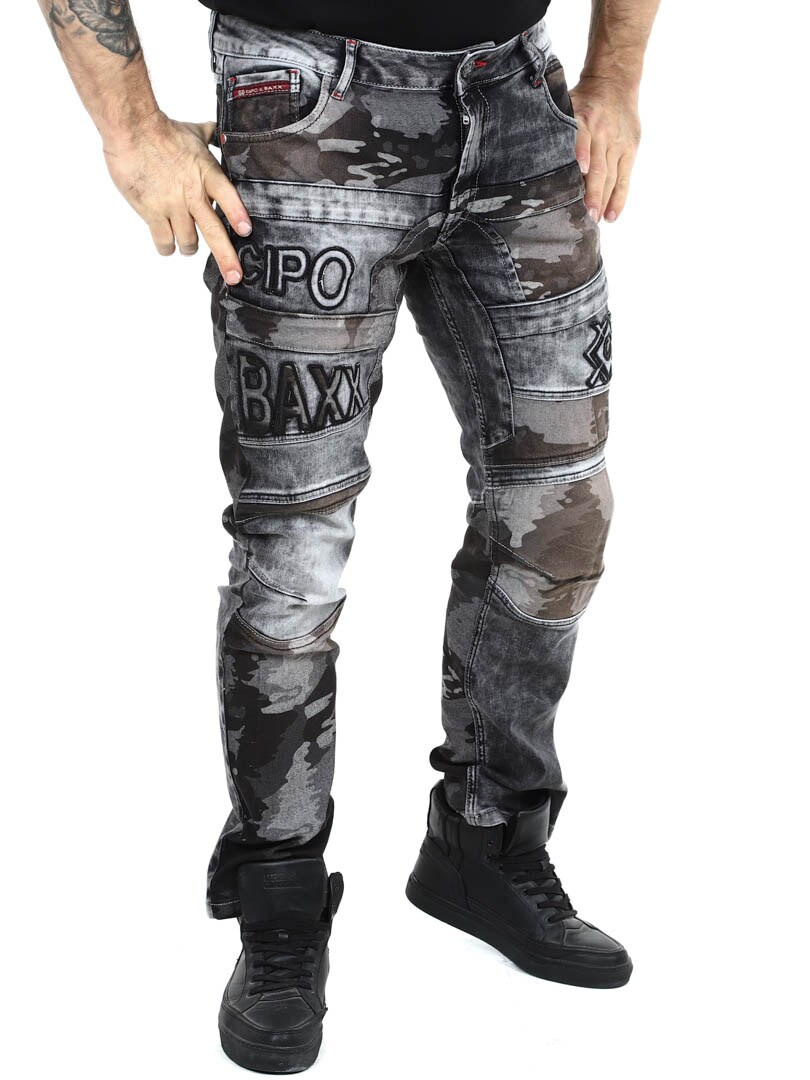 Stentvättade byxor med kamouflagemönstrade partier. 5-ficksmodell med stretch och klassisk passform. Skräddad logotyp fram- och baktill.