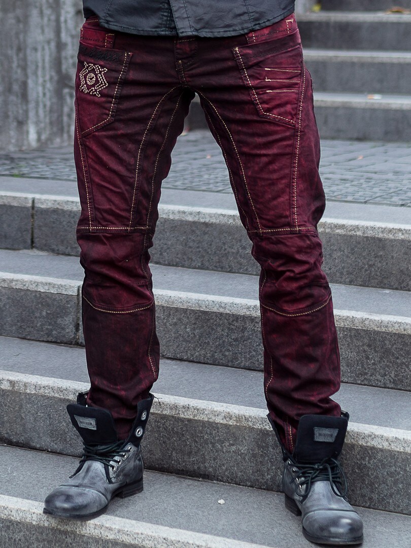 Byxorna har sliten tvättning som framhävs av sömmar och skräddade mönster i beige, grått, svart och rött. I linningen baktill sitter en svart patch med röda detaljer i metall. Modellen har en smalare passform och gott om fickor.