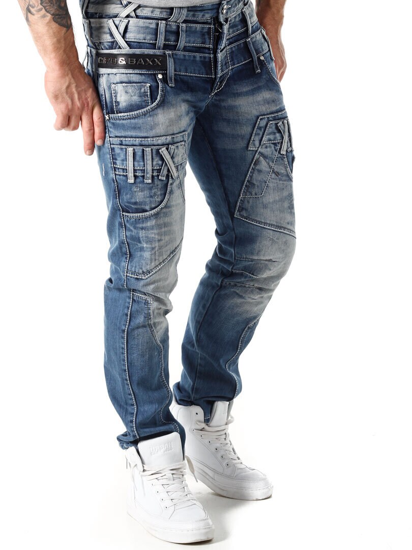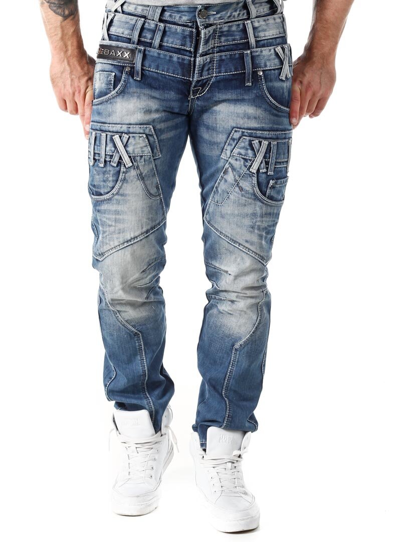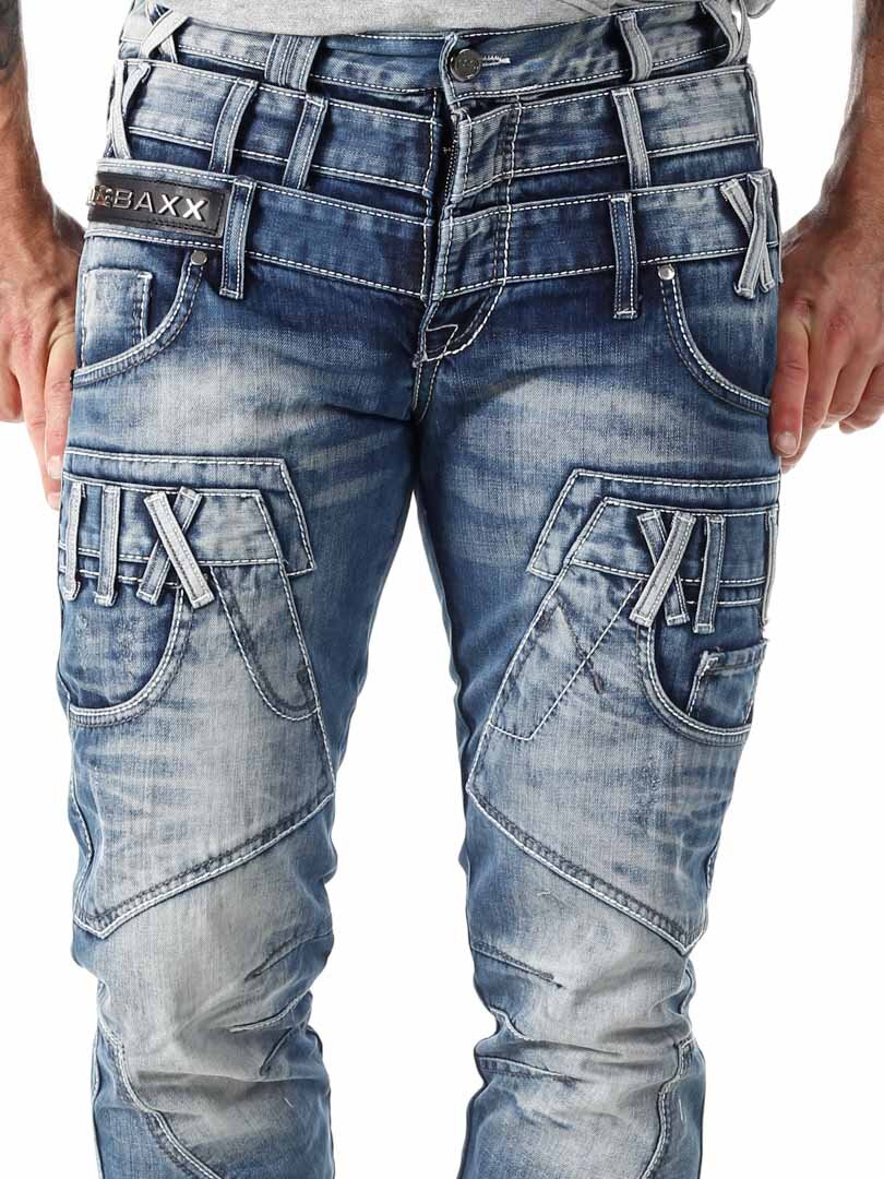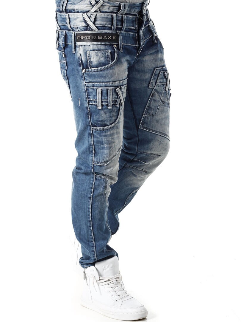 Blåa byxor med ljusare partier och slitningar. Designad med detaljer som hällar, fickor och framträdande sömmar. Loggan syns tydligt framtill.