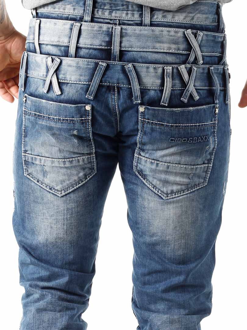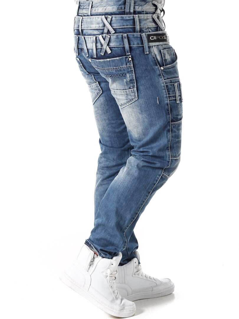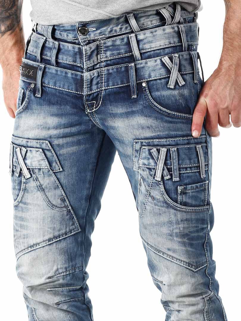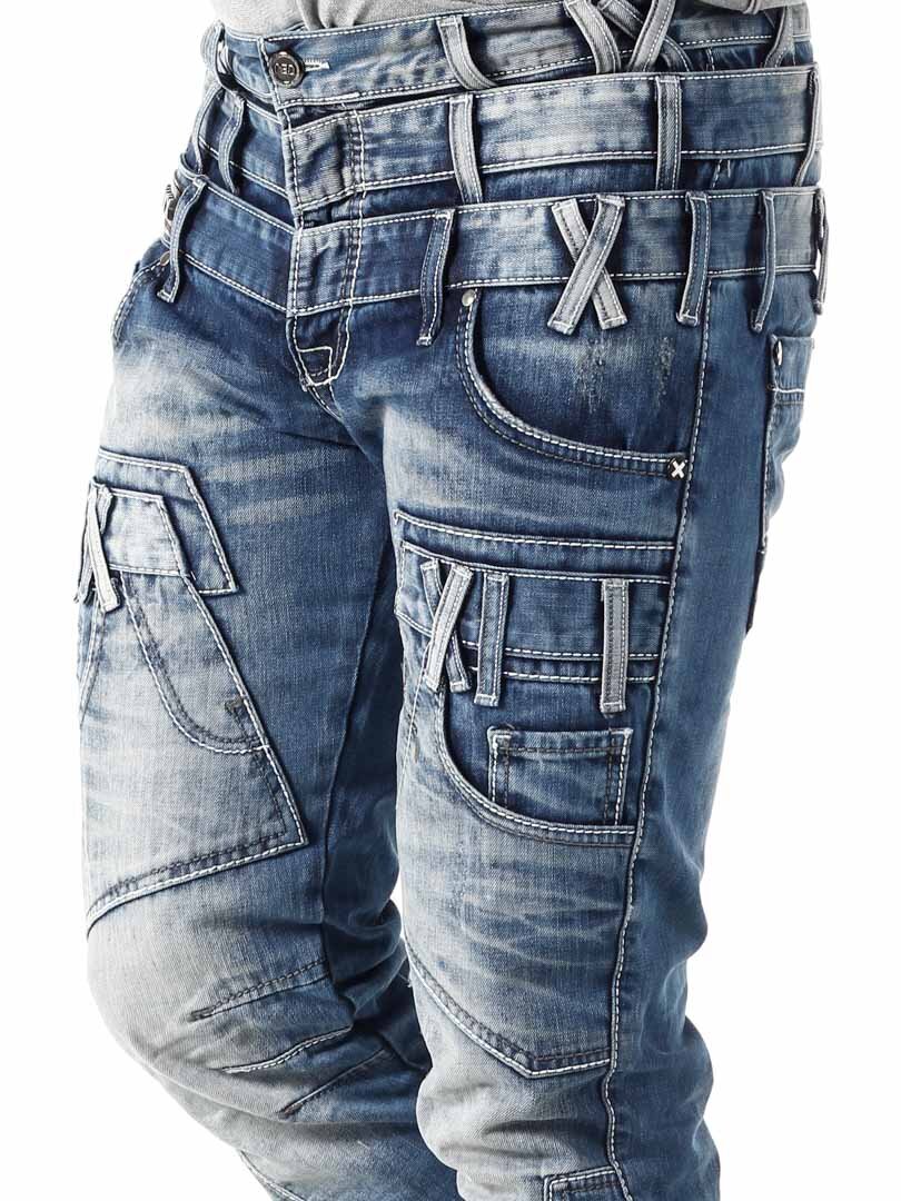 Blåa byxor med ljusare partier och slitningar. Designad med detaljer som hällar, fickor och framträdande sömmar. Loggan syns tydligt framtill.