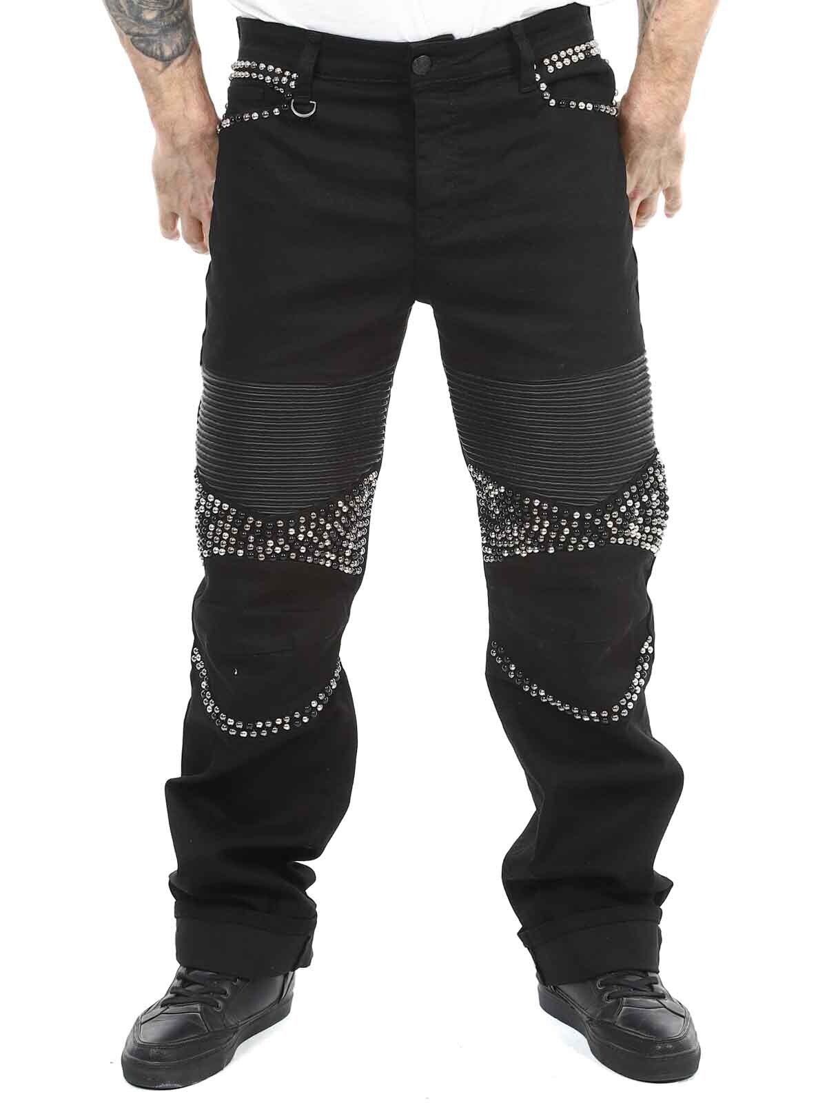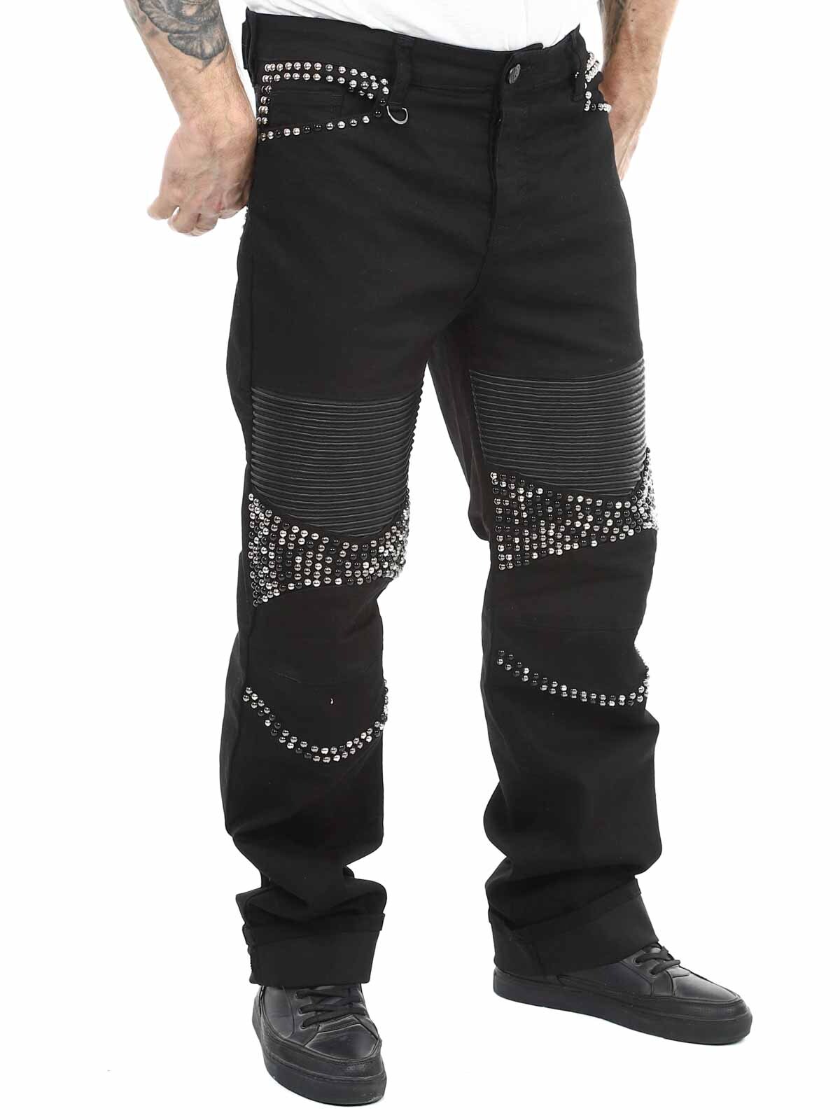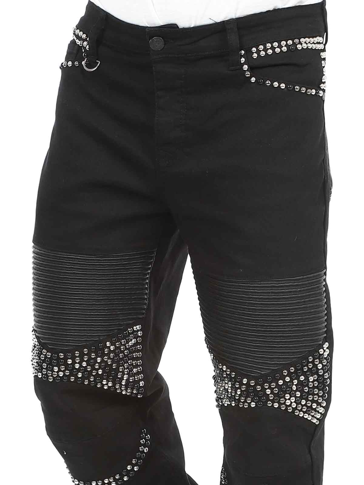 Bekväma jeans designade med nitar och skinnimitation på låren samt en bakficka. De har fem fickor, bälteshällor i midjan och stängs med knappgylf.