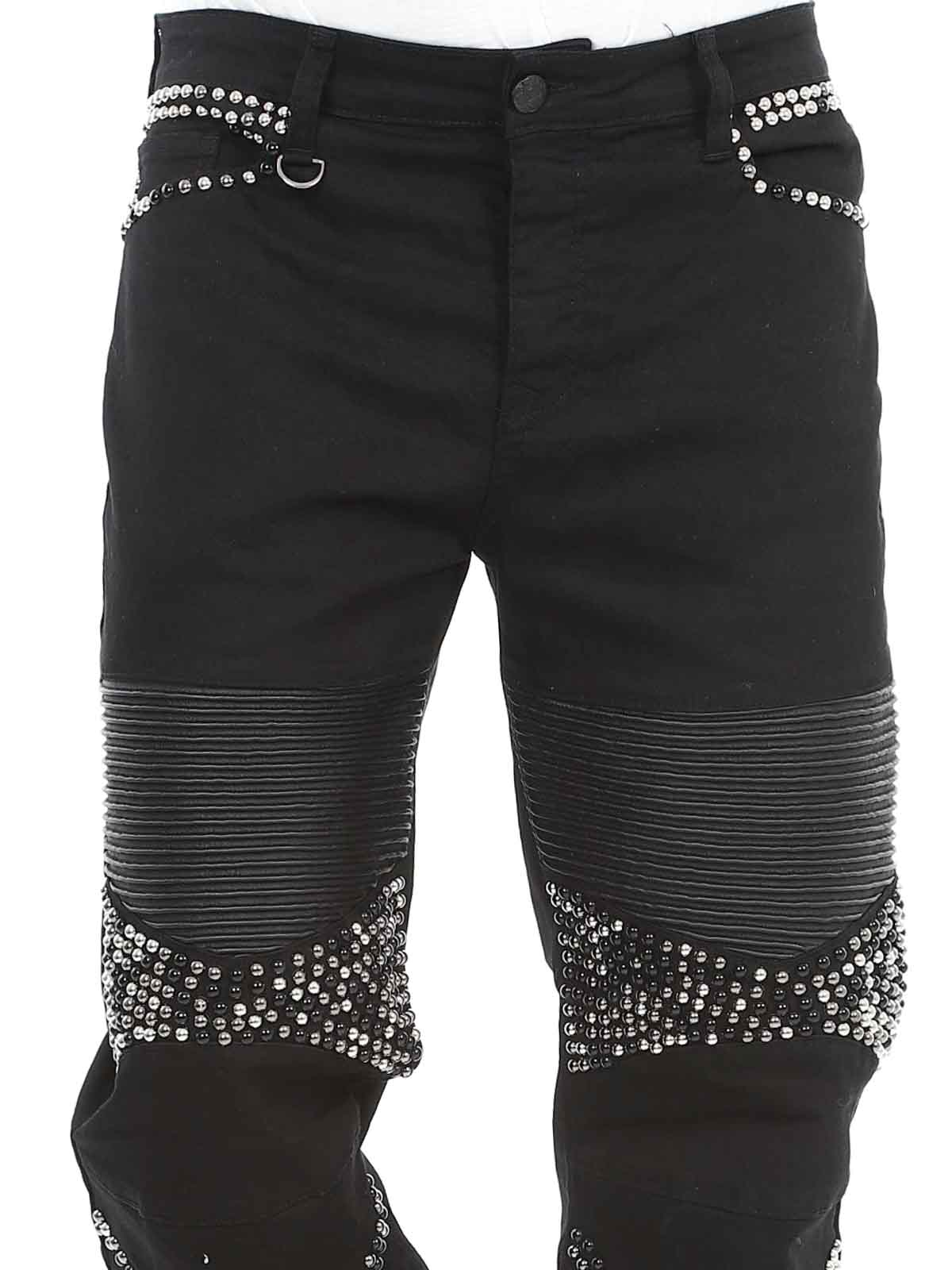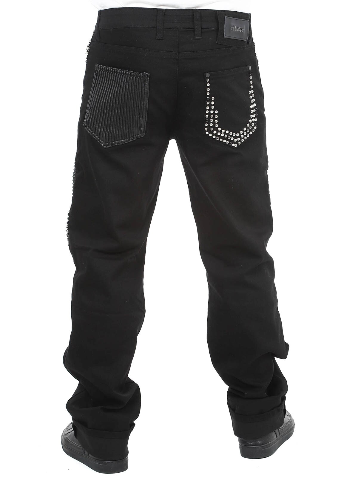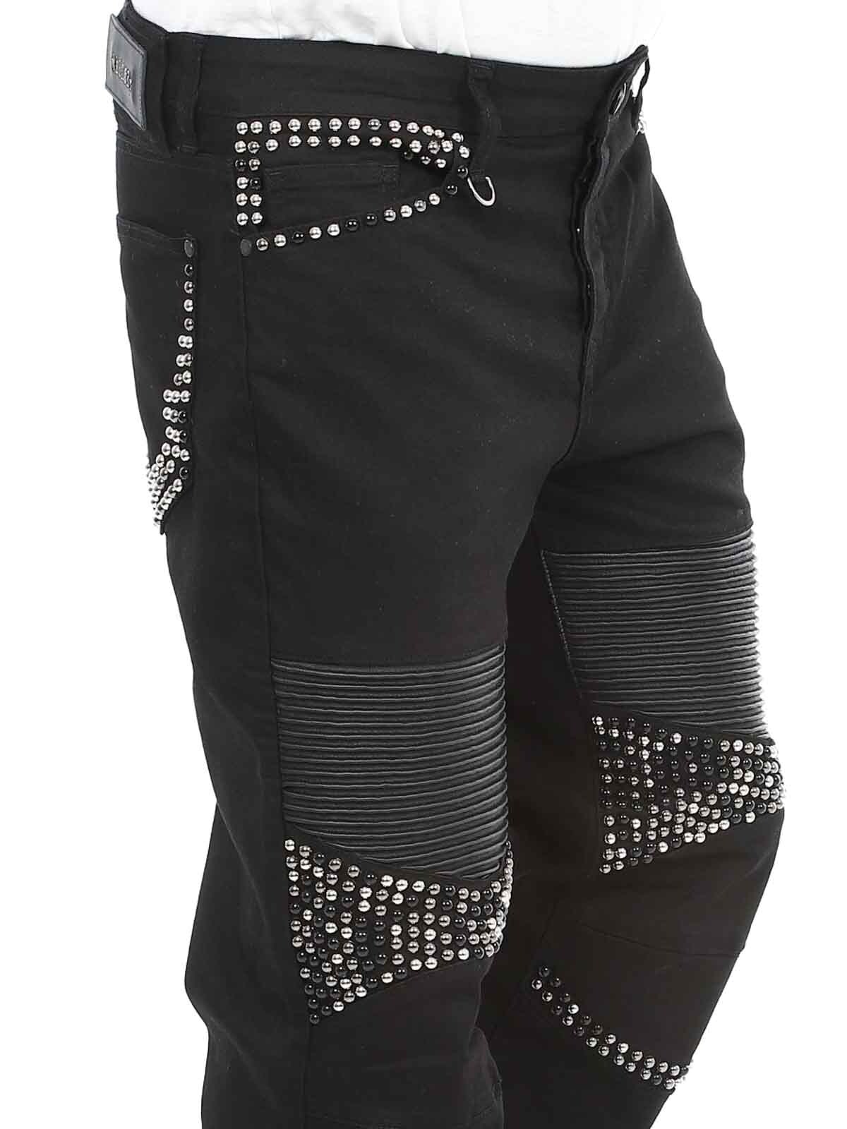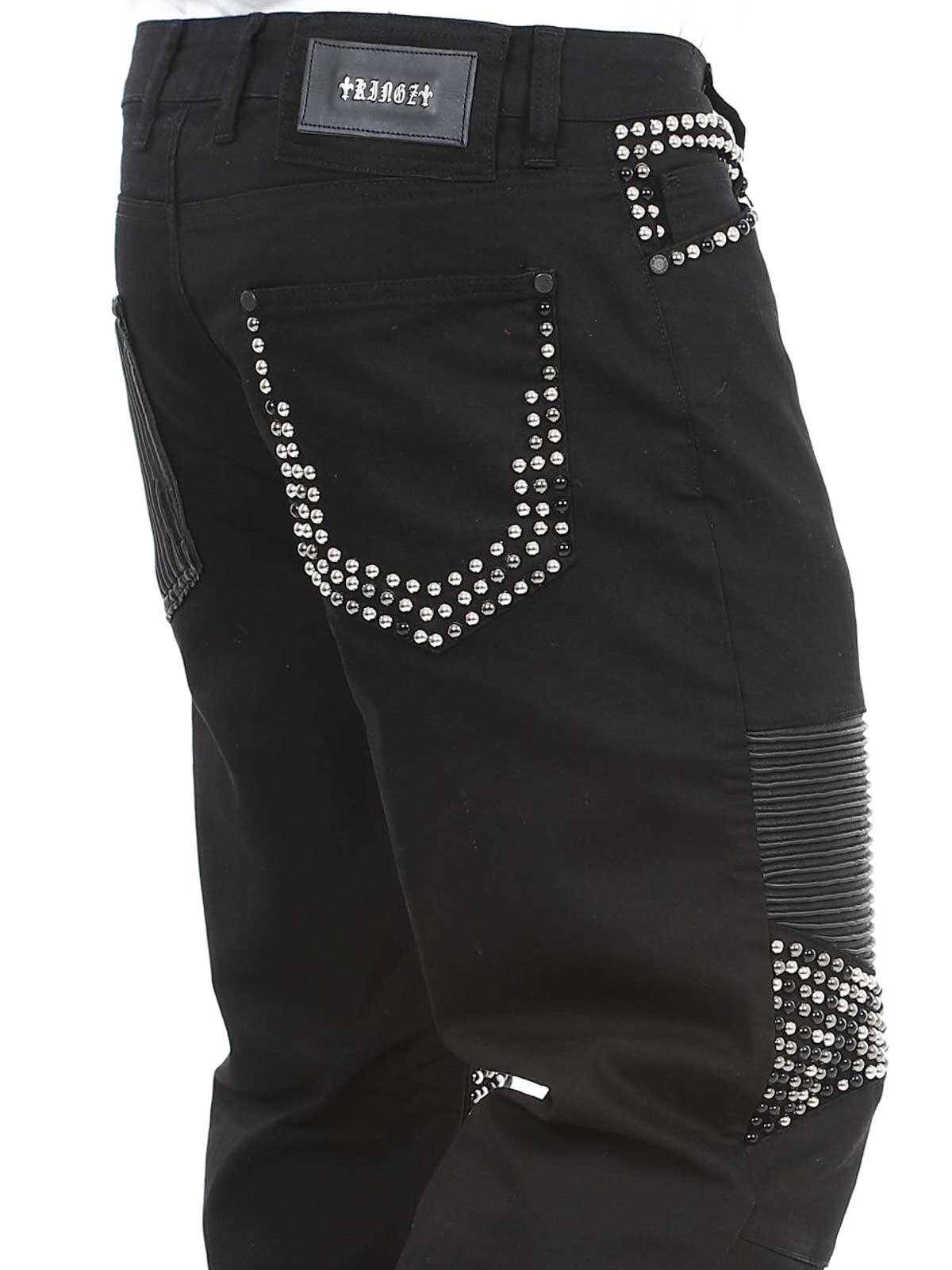 Bekväma jeans designade med nitar och skinnimitation på låren samt en bakficka. De har fem fickor, bälteshällor i midjan och stängs med knappgylf.