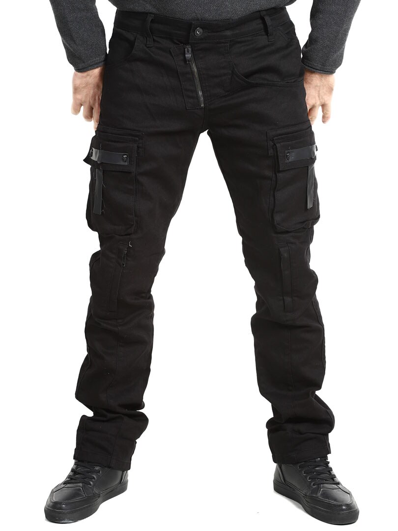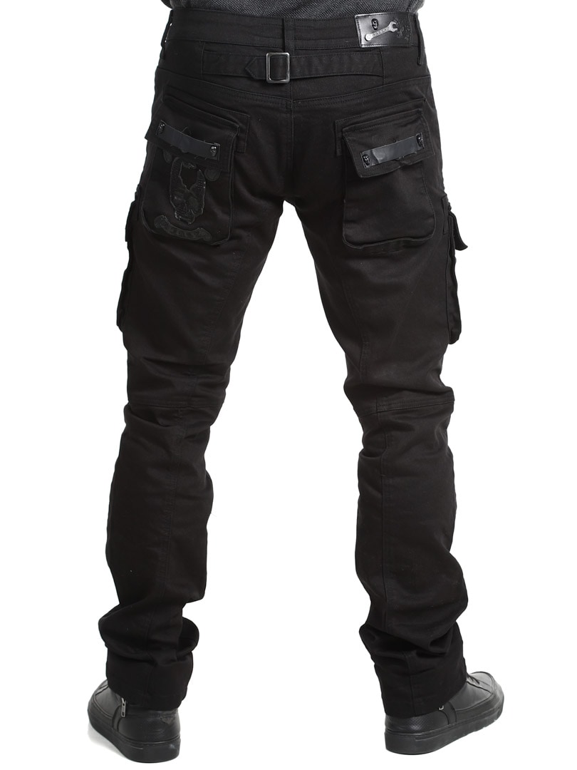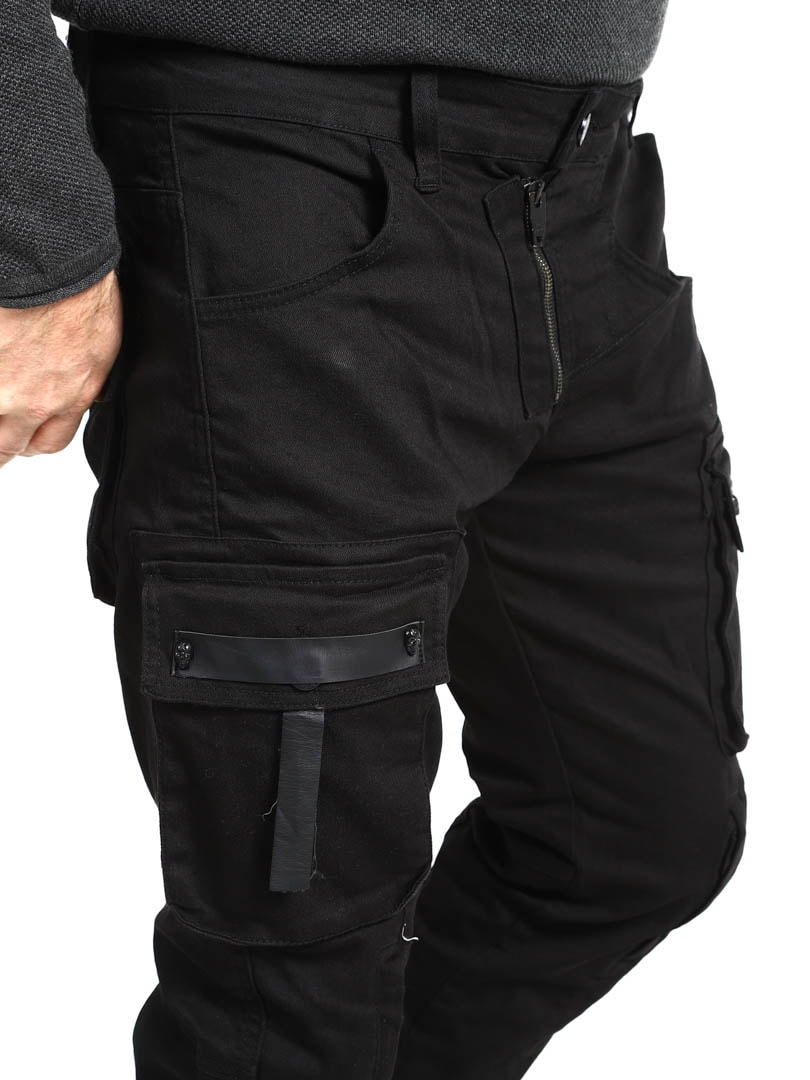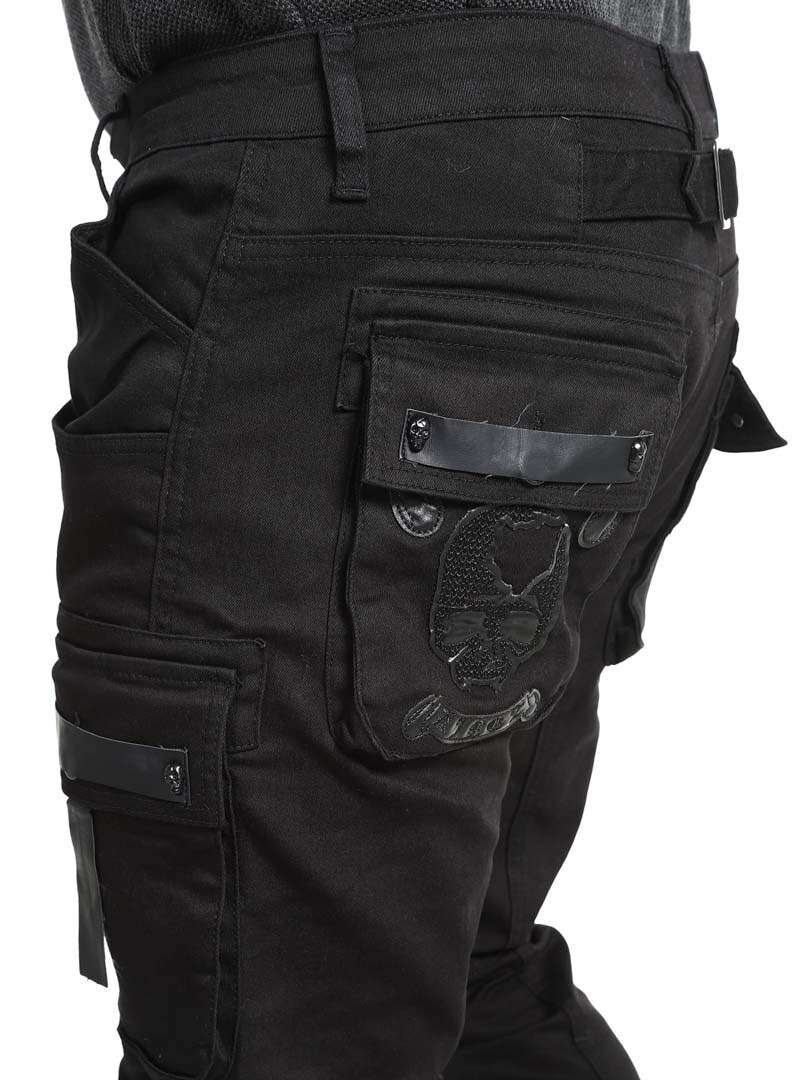 Unika jeans med flera fickor. Tufft detajerade med dödskallenitar, läderremmar och dragkedjor på knäna. Jeansen stängs med dragkedjegylf och har bälteshällor i midjan.