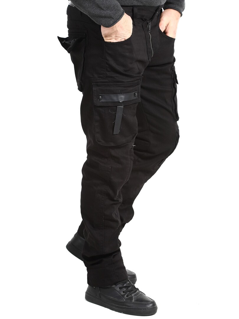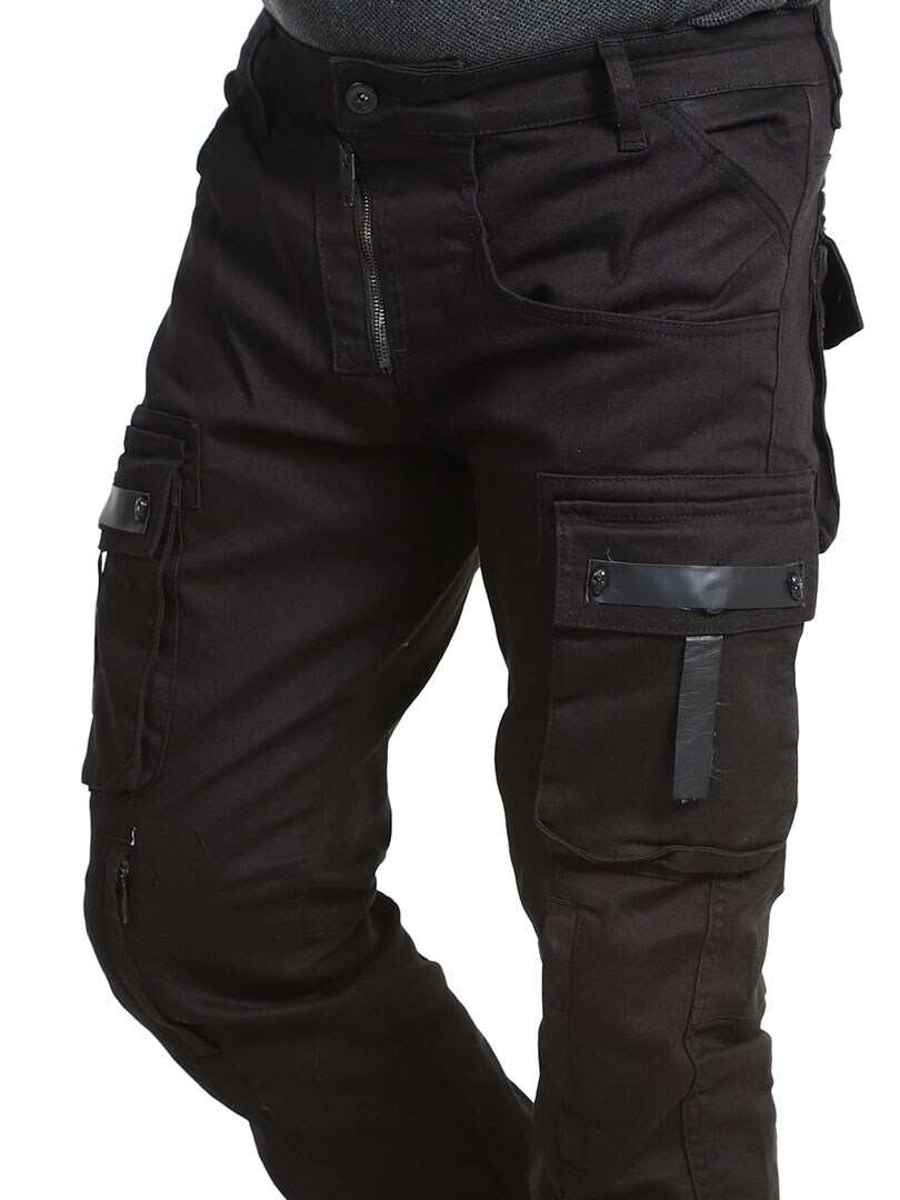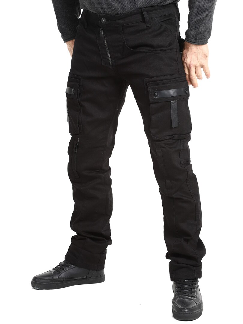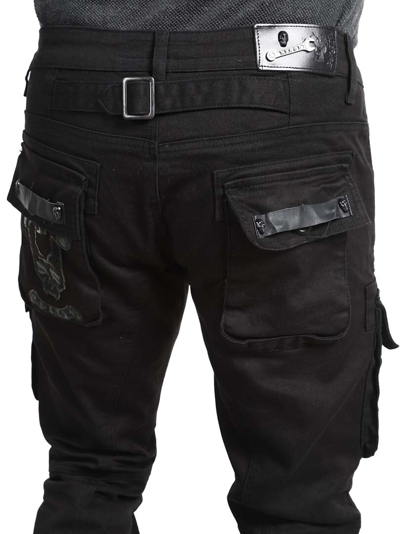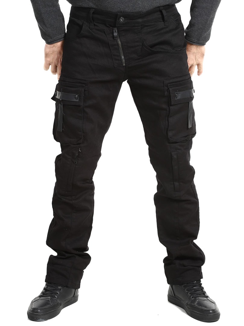 Unika jeans med flera fickor. Tufft detajerade med dödskallenitar, läderremmar och dragkedjor på knäna. Jeansen stängs med dragkedjegylf och har bälteshällor i midjan.