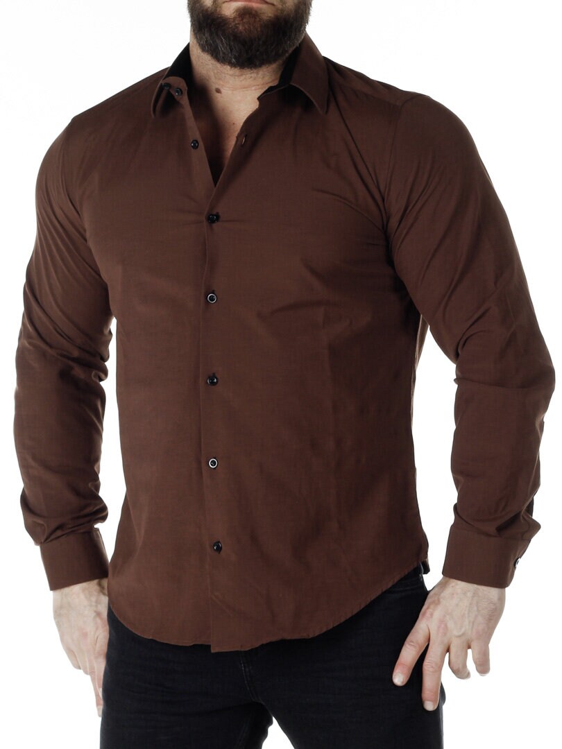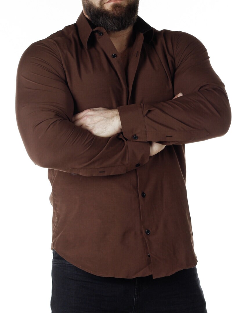 Bomullskjorta i bekväm modell som är något stretchig. Brun bas med knappar, insida krage och ärmslut i kontrastfärg. Smalare modell med rundad linning nertill och förstärkt krage som håller formen. Finns i fler färger!