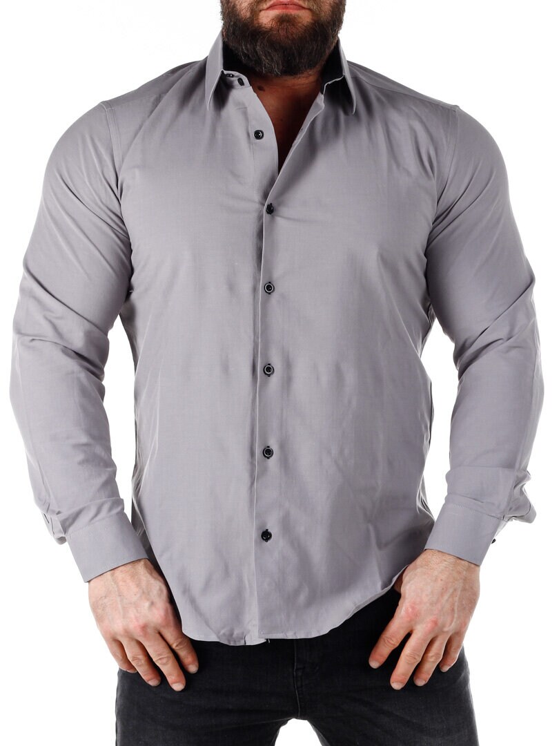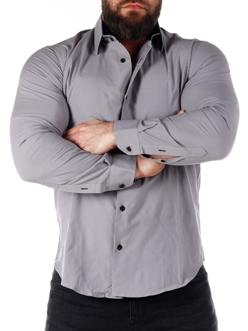 Bomullskjorta i bekväm modell som är något stretchig. Grå bas med knappar, insida krage och ärmslut i kontrastfärg. Smalare modell med rundad linning nertill och förstärkt krage som håller formen. Finns i fler färger!
