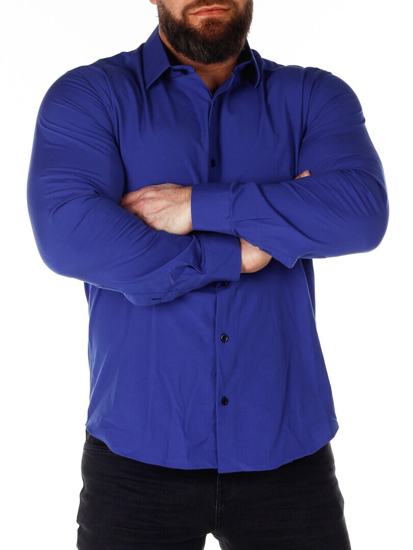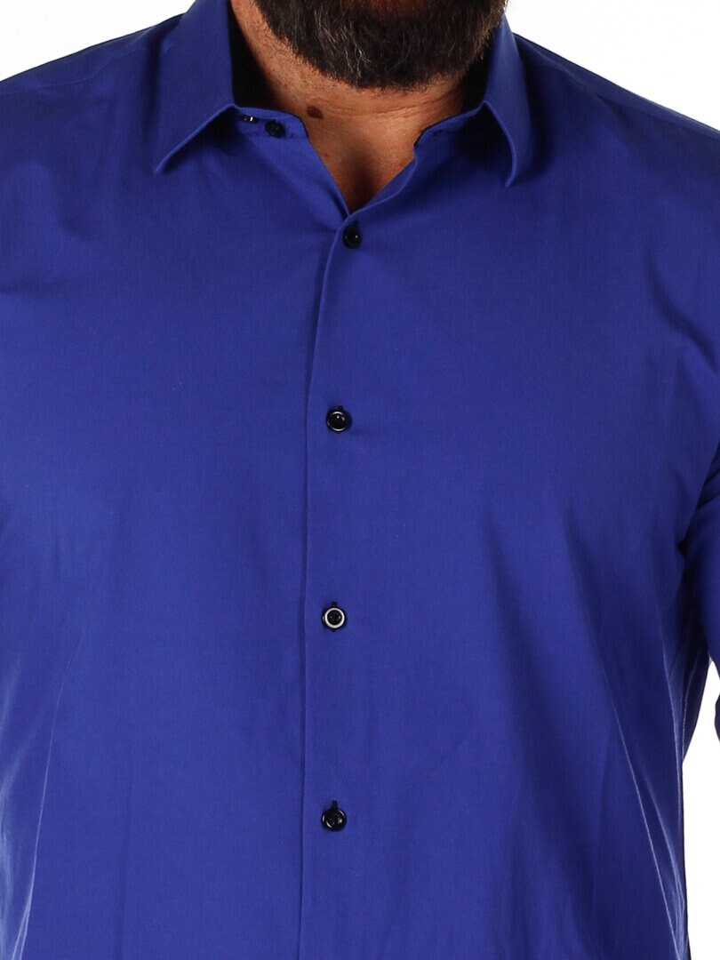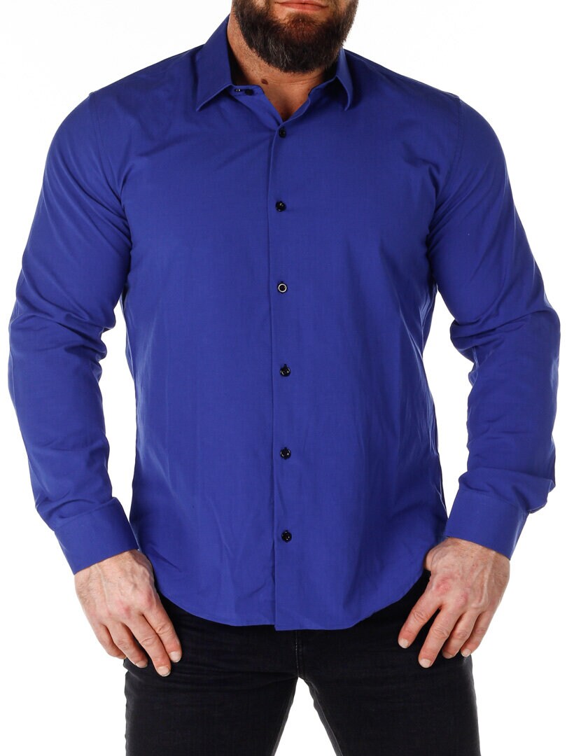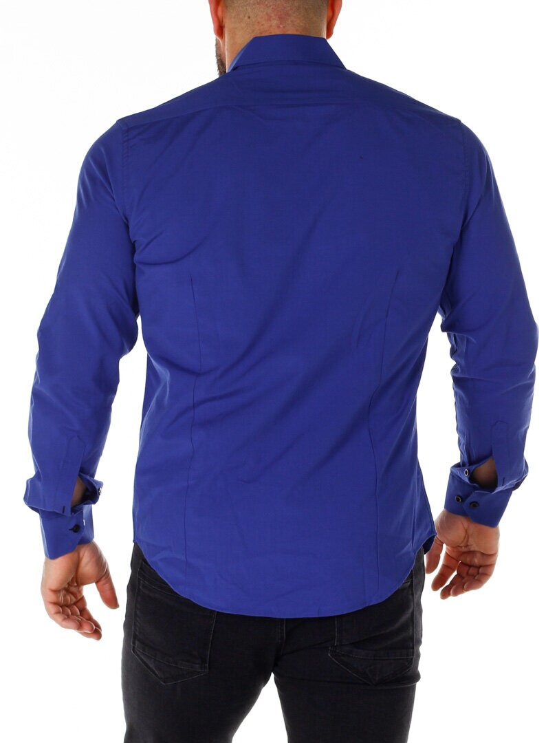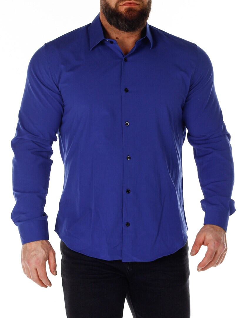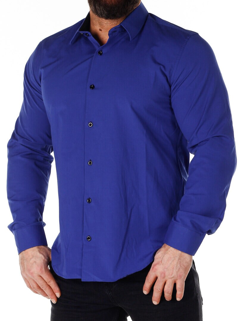 Bomullskjorta i bekväm modell som är något stretchig. Blå bas med knappar, insida krage och ärmslut i kontrastfärg. Smalare modell med rundad linning nertill och förstärkt krage som håller formen. Finns i fler färger!