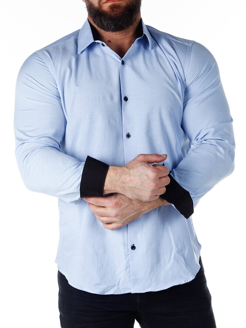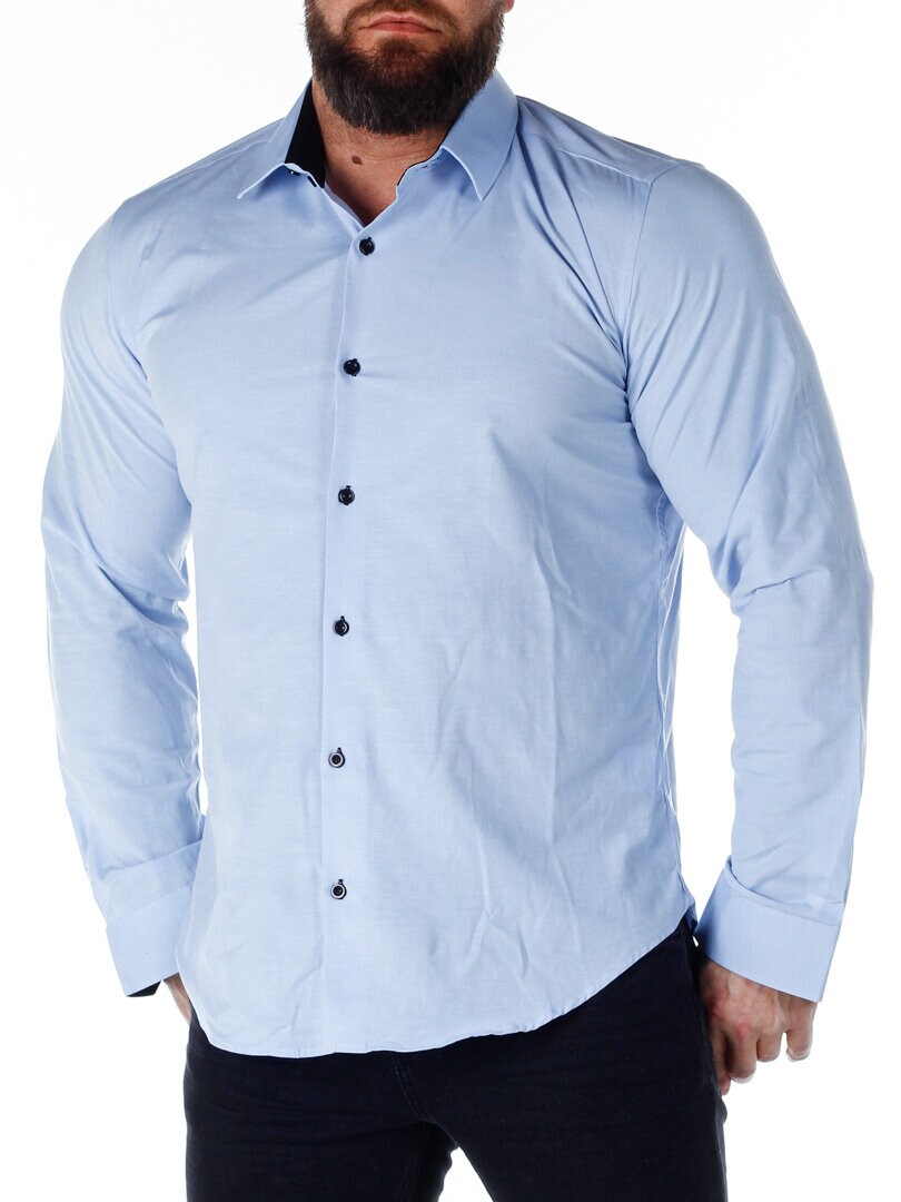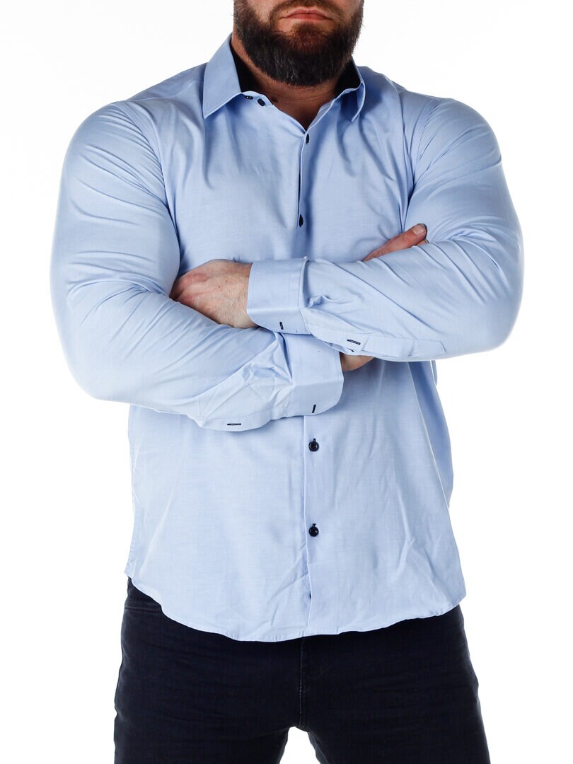Bomullskjorta i bekväm modell som är något stretchig. Ljusblå bas med knappar, insida krage och ärmslut i kontrastfärg. Smalare modell med rundad linning nertill och förstärkt krage som håller formen. Finns i fler färger!