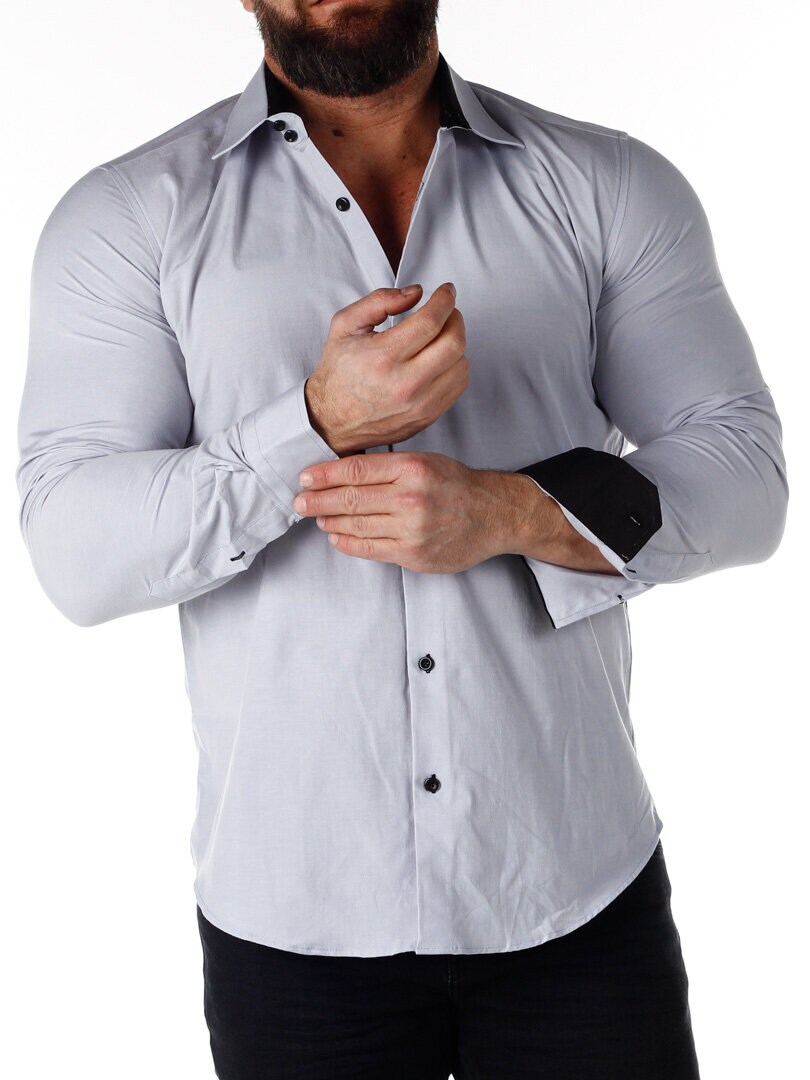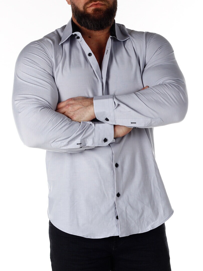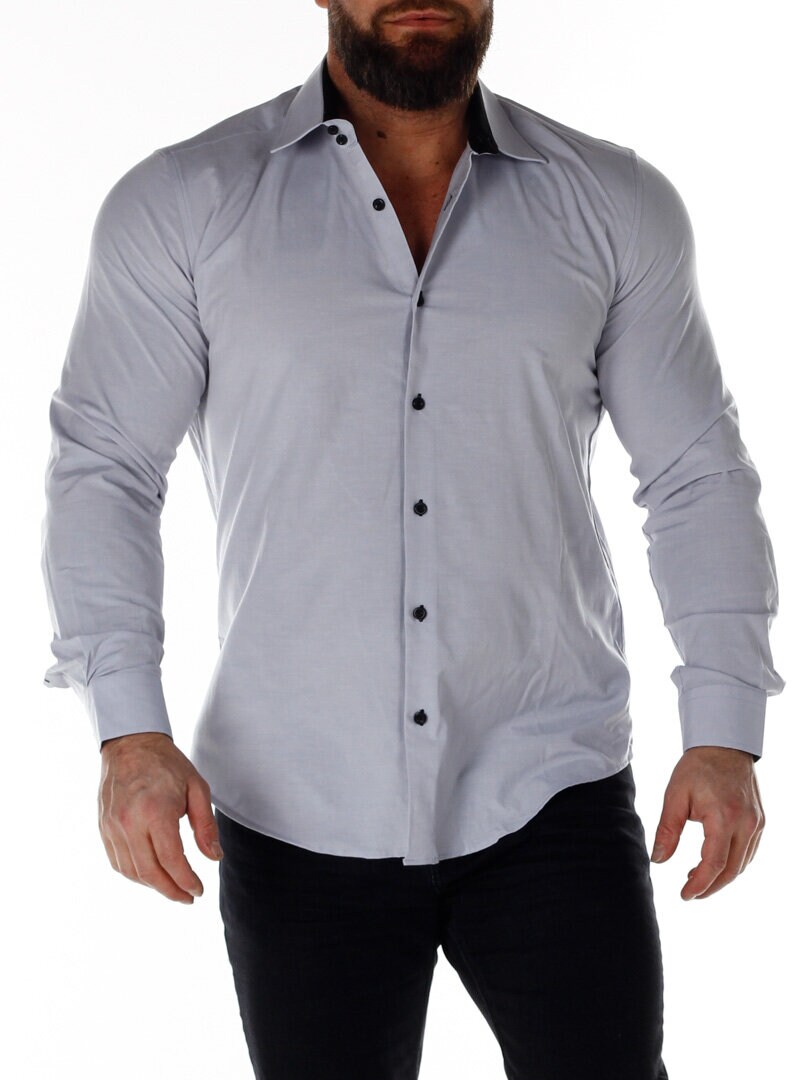 Bomullskjorta i bekväm modell som är något stretchig. Ljusgrå bas med knappar, insida krage och ärmslut i kontrastfärg. Smalare modell med rundad linning nertill och förstärkt krage som håller formen. Finns i fler färger!