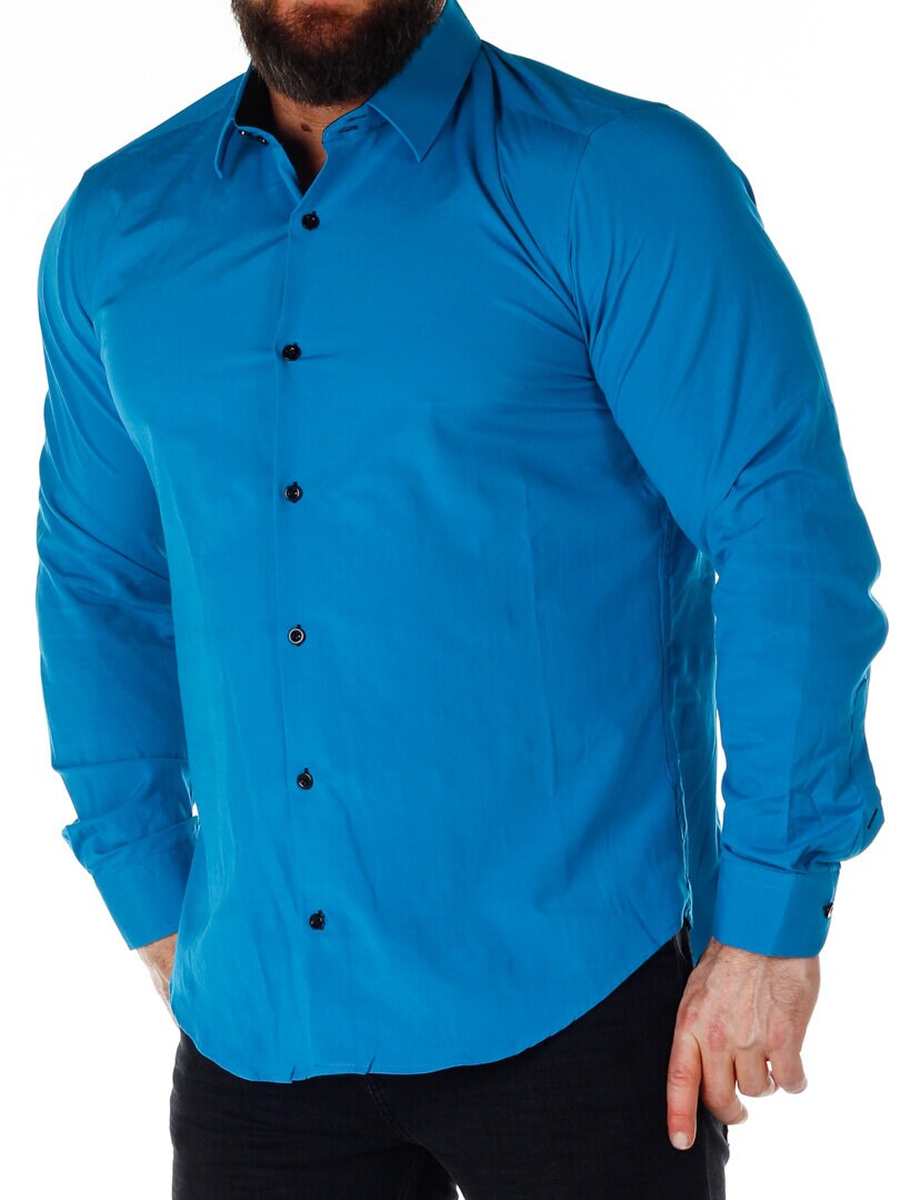 Bomullskjorta i bekväm modell som är något stretchig. Blå bas med knappar, insida krage och ärmslut i kontrastfärg. Smalare modell med rundad linning nertill och förstärkt krage som håller formen. Finns i fler färger!