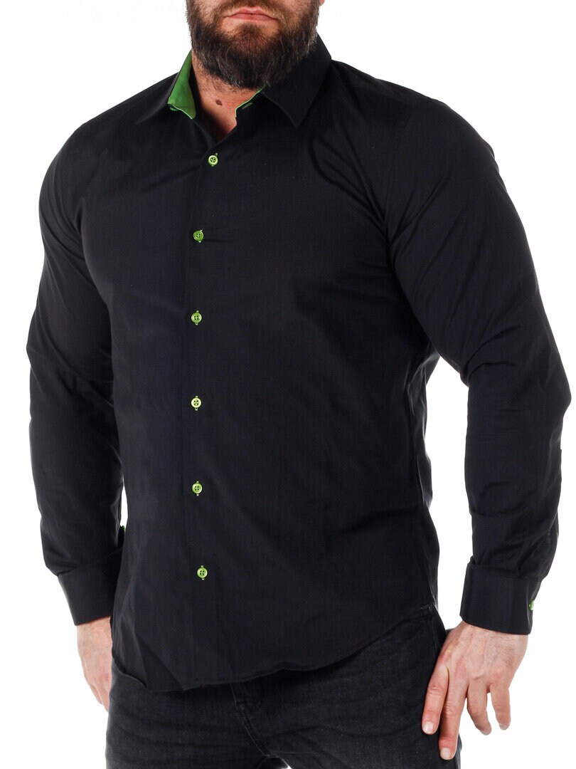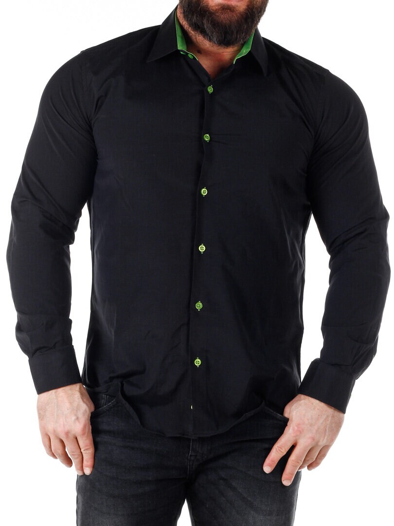 Bomullskjorta i bekväm modell som är något stretchig. Svart bas med knappar, insida krage och ärmslut i kontrastfärg. Smalare modell med rundad linning nertill och förstärkt krage som håller formen. Finns i fler färger!