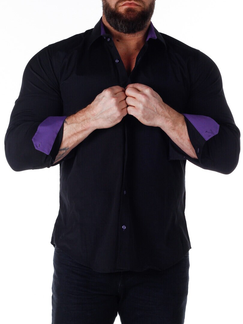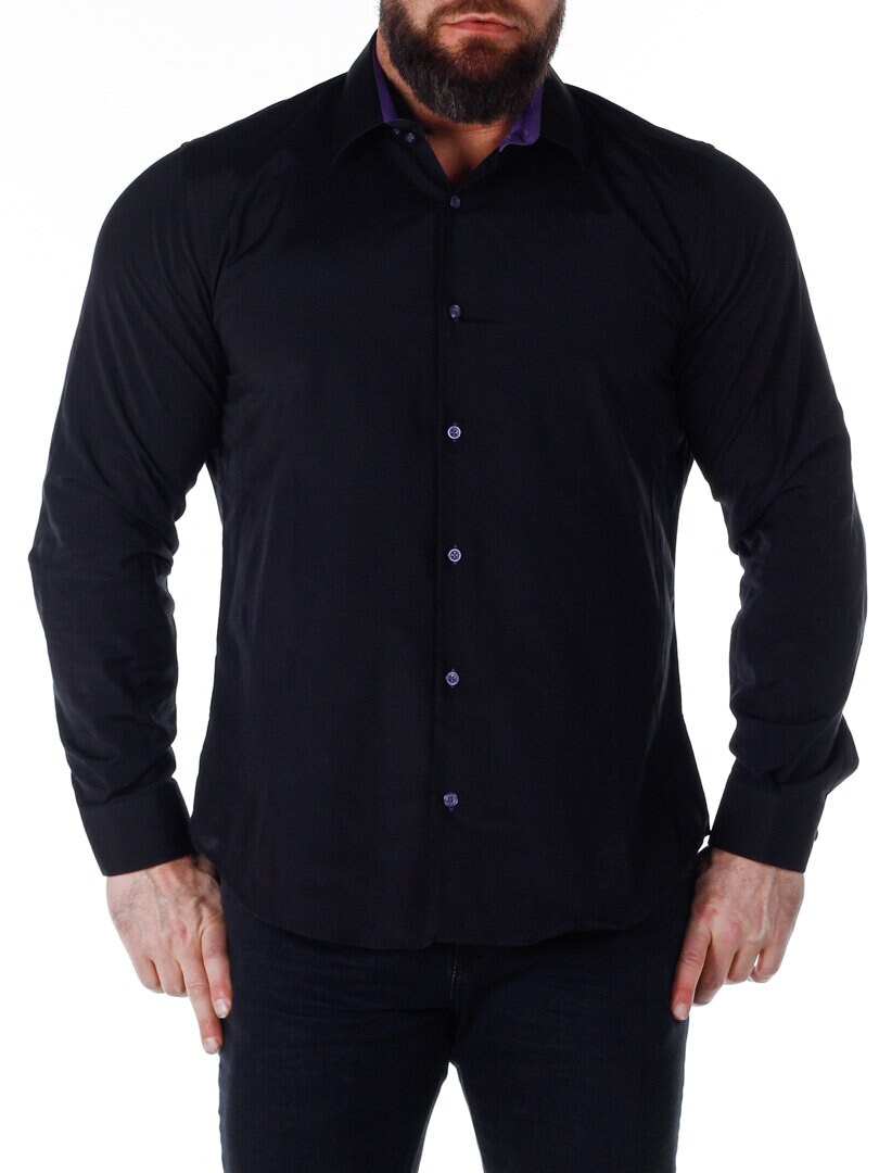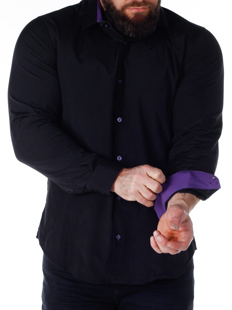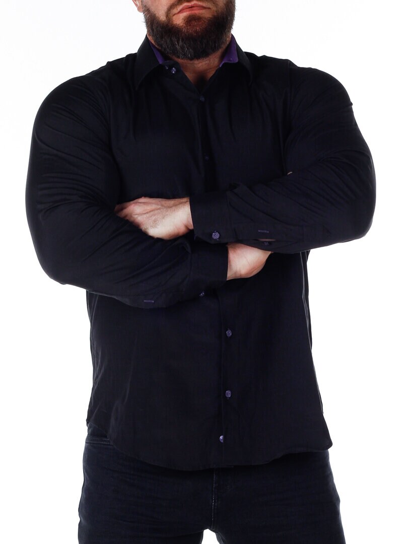 Bomullskjorta i bekväm modell som är något stretchig. Svart bas med knappar, insida krage och ärmslut i kontrastfärg. Smalare modell med rundad linning nertill och förstärkt krage som håller formen. Finns i fler färger!