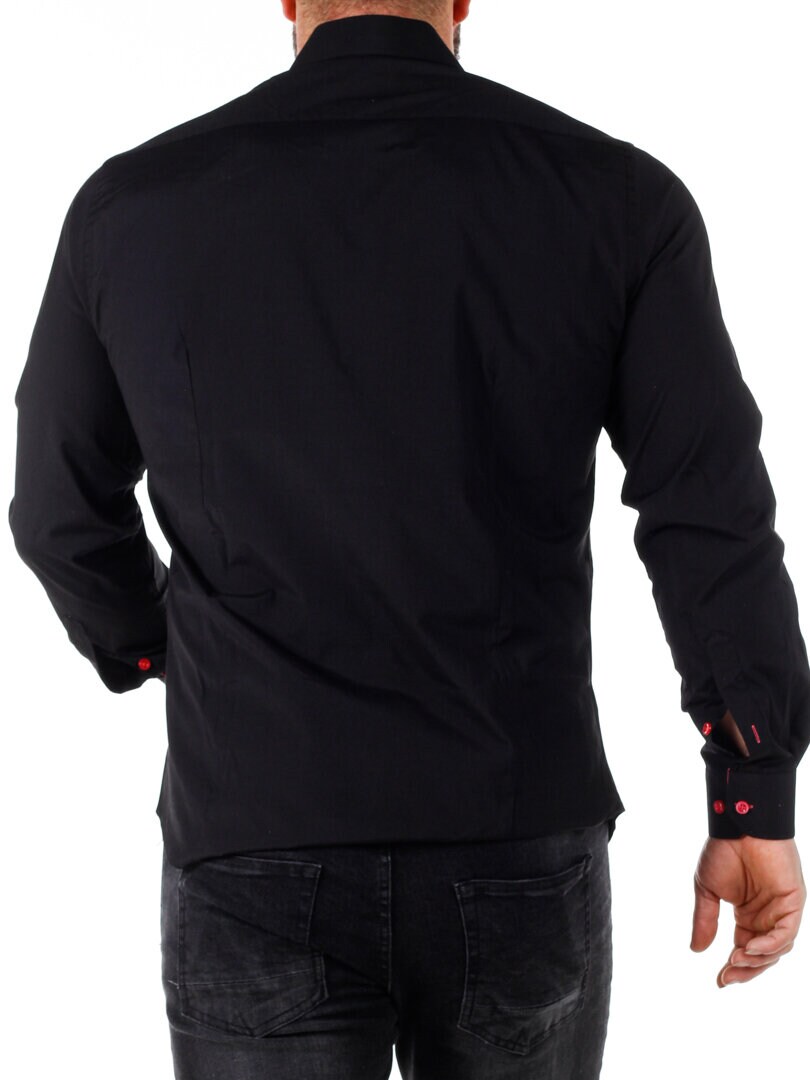 Bomullskjorta i bekväm modell som är något stretchig. Svart bas med knappar, insida krage och ärmslut i kontrastfärg. Smalare modell med rundad linning nertill och förstärkt krage som håller formen. Finns i fler färger!