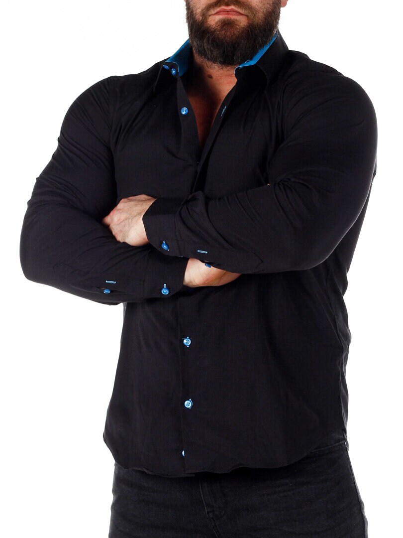 Bomullskjorta i bekväm modell som är något stretchig. Svart bas med knappar, insida krage och ärmslut i kontrastfärg. Smalare modell med rundad linning nertill och förstärkt krage som håller formen. Finns i fler färger!